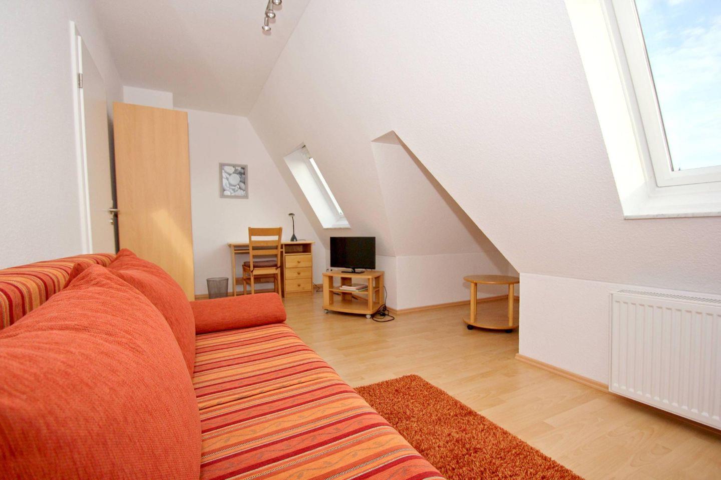 WOHNEN // Wohnraum mit Essbereich, Sitzgarnitur mit bequemer Schlafcouch, Flachbild-TV (Kabel), Radio, CD-Player ++