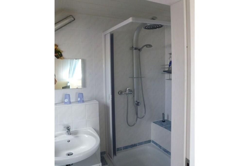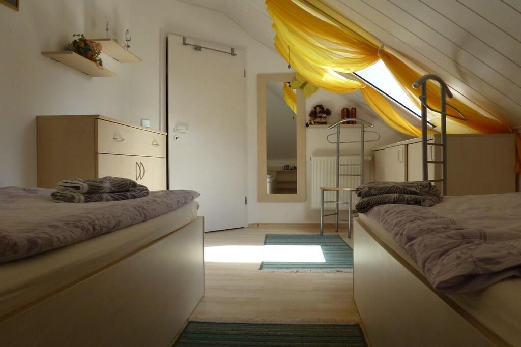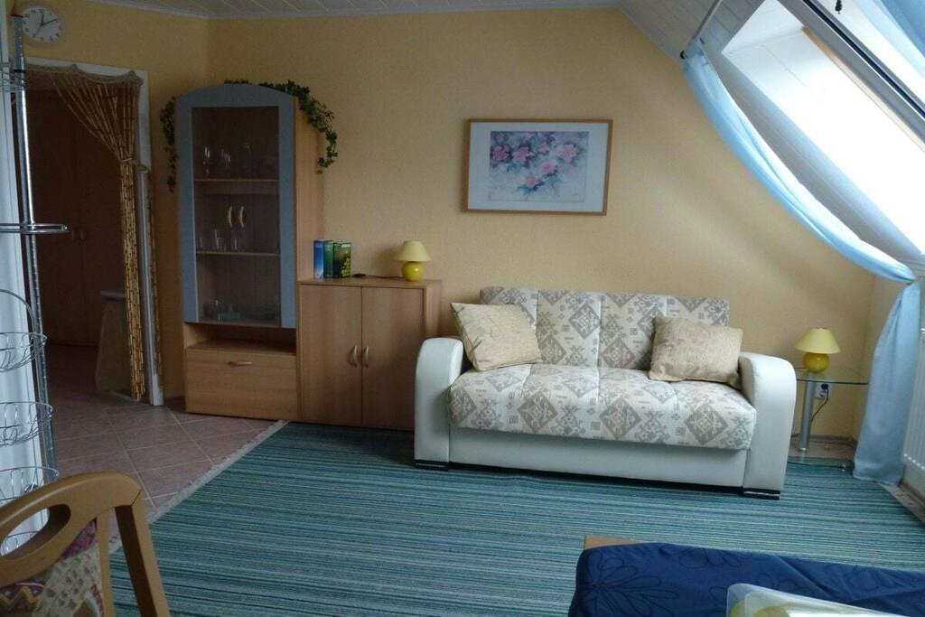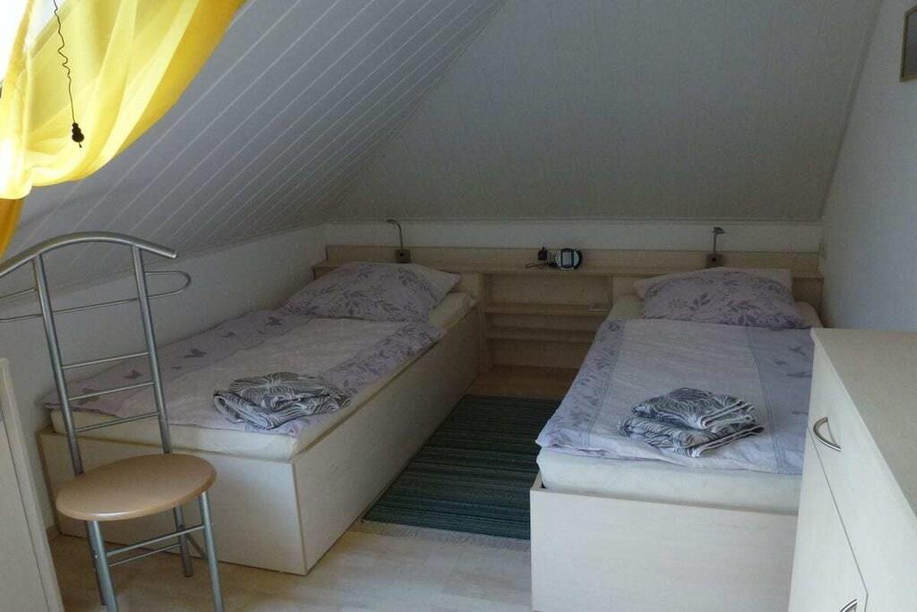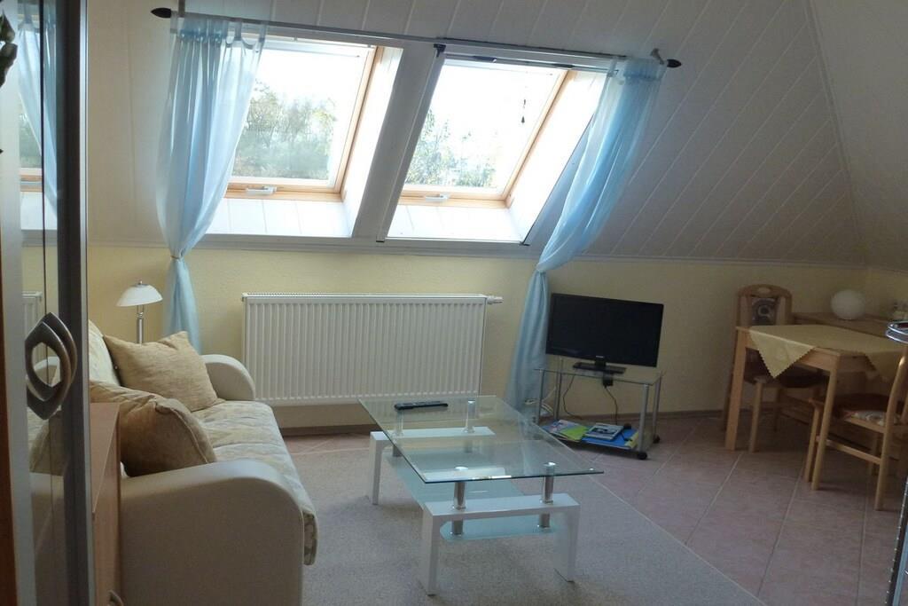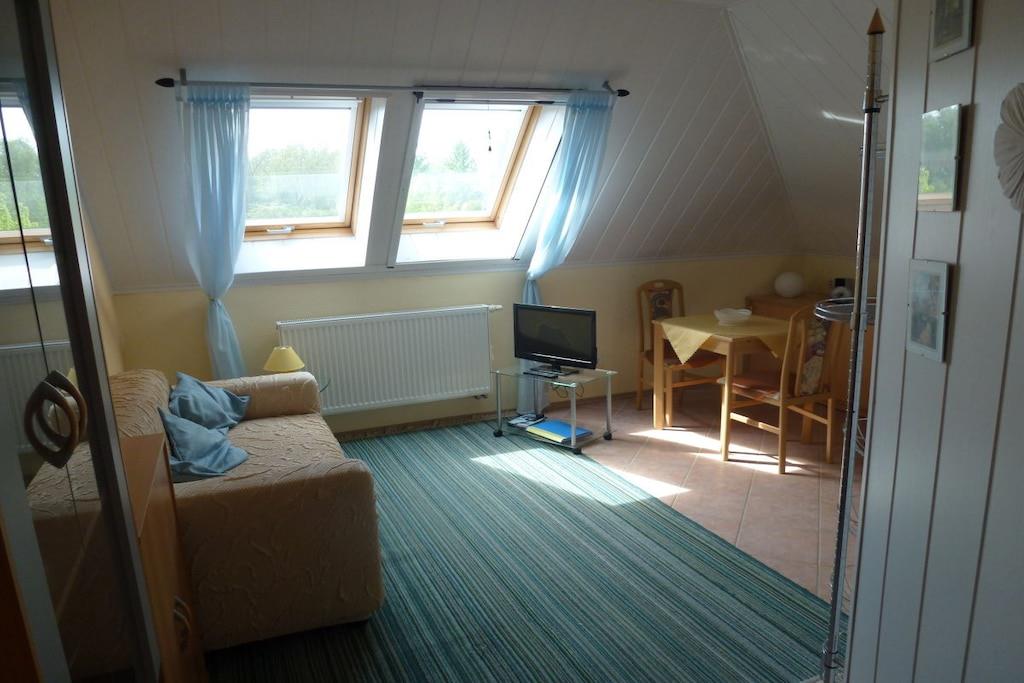 Das Wohnzimmer ist mit einer Couch, einem Tisch und Essecke sowie mit SAT-TV-Gerät, Radio und DVD-Player ausgestattet. ln diesem Raum finden Sie auch eine kleine Pantryküche mit 2-Platten-Elektroherd, Kühlschrank, Mikrowelle und Kaffeemaschine. Im Schlafzimmer stehen zwei bequeme Einzelbetten mit Nachttisch und Leselampe; ebenso ein Kleiderschrank sowie ein Sideboard. Das moderne Bad ist mit Dusche und WC ausgestattet. Einen Hochstuhl stellen wir unseren jüngsten Gästen gerne kostenlos zur Verfügung. Das Warmwasser wird umweltfreundlich durch eine Solaranlage auf dem Dach erzeugt, geheizt wird mittels einer Gasbrennwerttherme Ihren PKW können Sie vor dem Haus an den hauseigenen Parktaschen abstellen.