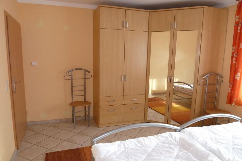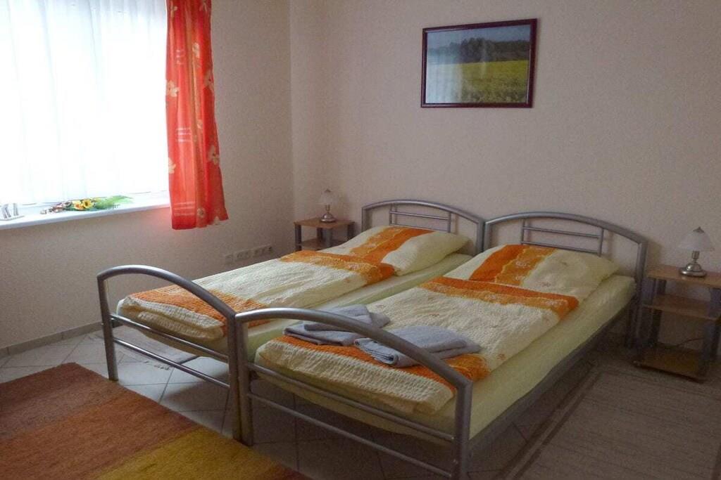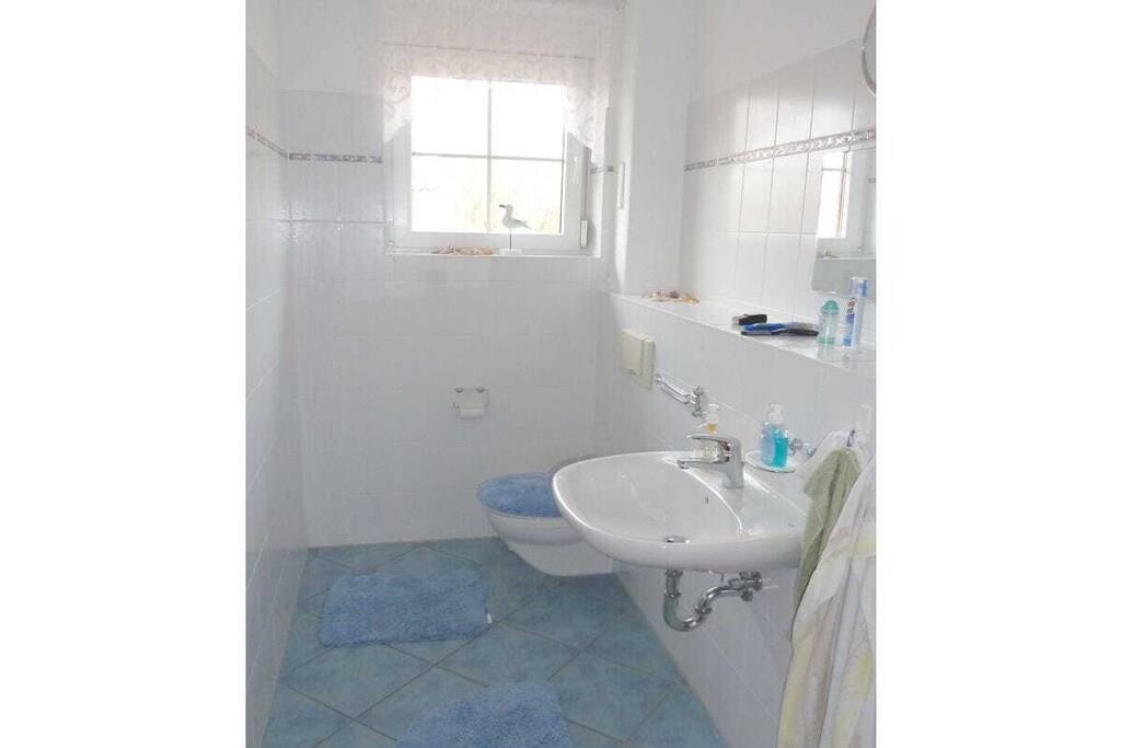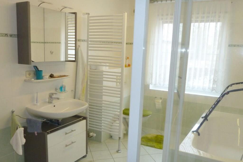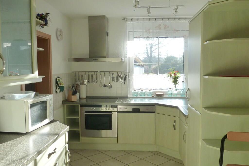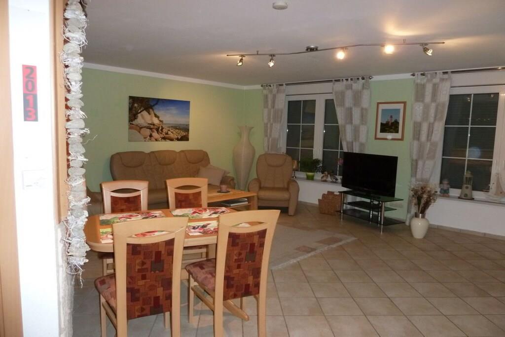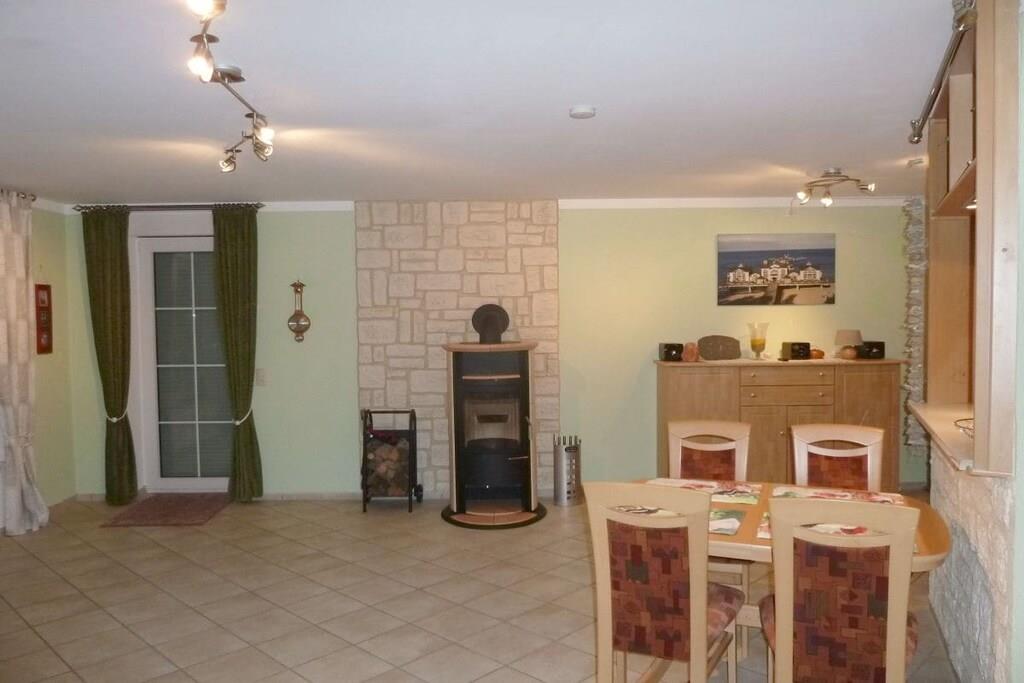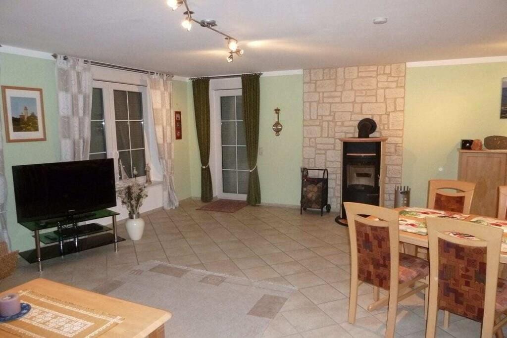 Unser sehr hochwertig ausgestattetes Ferienwohnung "Windland" (4 Sterne) mit separatem Eingang ist für vier Gäste eingerichtet. Das großzügige Wohnzimmer ist mit einer Schlafcouch, einem Tisch mit Sesseln sowie SAT-TV-Gerät, Radio und DVD-Player ausgestattet. Ein großer Tisch mit Stühlen vor der Durchreiche zur Küche dient als geräumiger Essplatz. Der Kaminofen im Wohnzimmer lädt zu gemütlichen Stunden in einer behaglichen Atmosphäre ein. Einen Hochstuhl stellen wir unseren jüngsten Gästen gerne kostenlos zur Verfügung. Das Warmwasser wird umweltfreundlich durch eine Solaranlage auf dem Dach erzeugt, geheizt wird mittels einer Gasbrennwerttherme. Ihren PKW können Sie auf dem Grundstück, linke Einfahrt, parken.