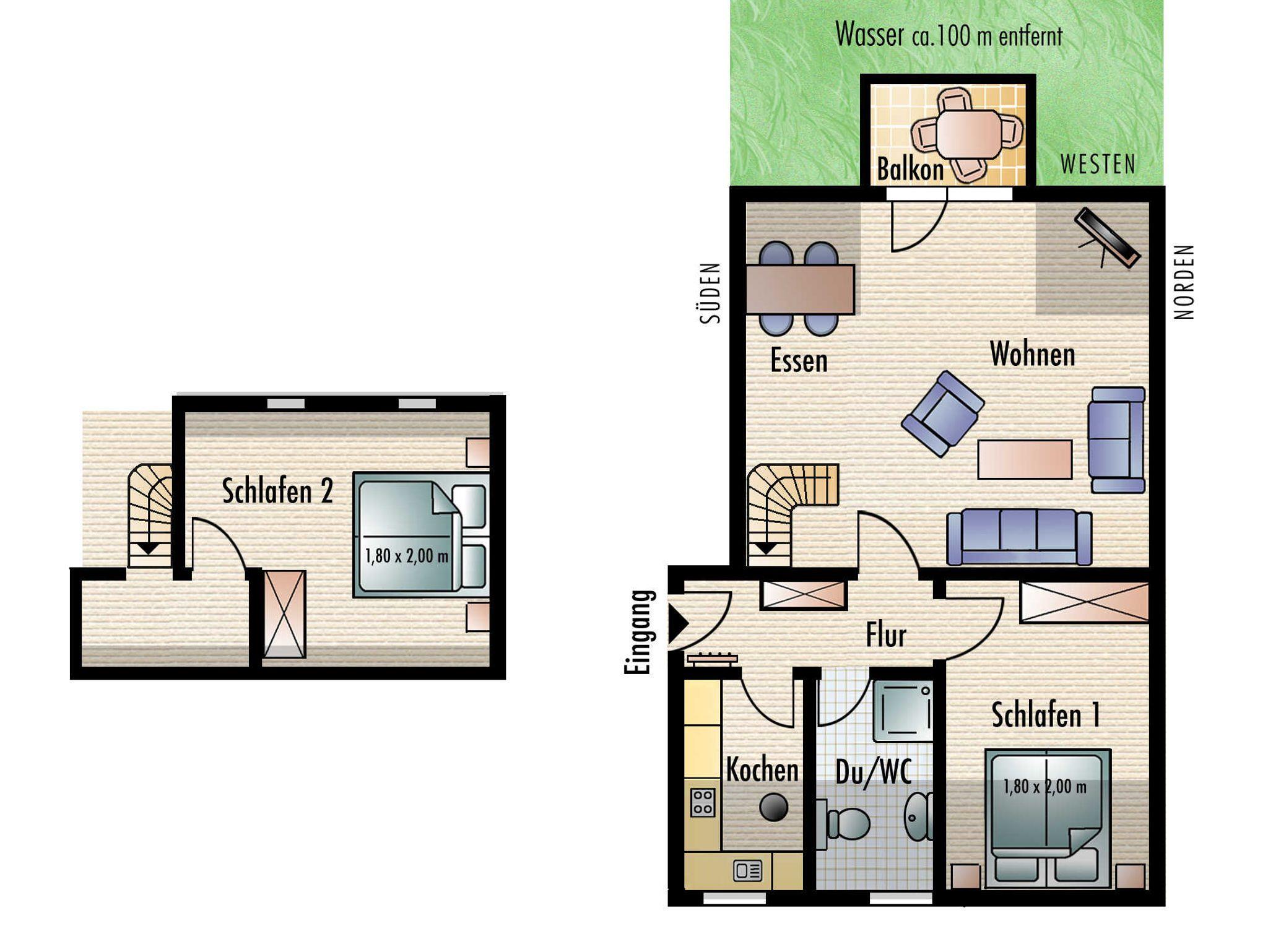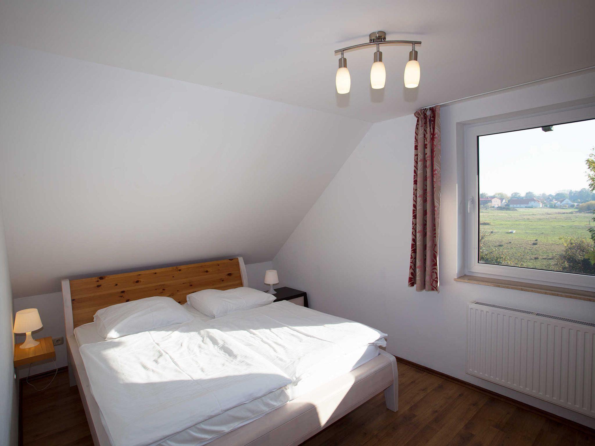 Die Ferienwohnung verfügt über zwei separate Schlafzimmer mit jeweils einem Doppelbett (2,00 x 1,80m, einzelnen 21cm dicken Komfort-Kaltschaum-Matratzen sowie sehr guten Lattenrosten). Ein Schlafzimmer befindet sich im Dachausbau und ist über eine offene Treppe vom Wohnzimmer aus zu erreichen. Es ist mit einem Highboard ausgestattet und durch eine Tür abschließbar. Im anderen Schlafzimmer befindet sich ein großer Kleiderschrank.