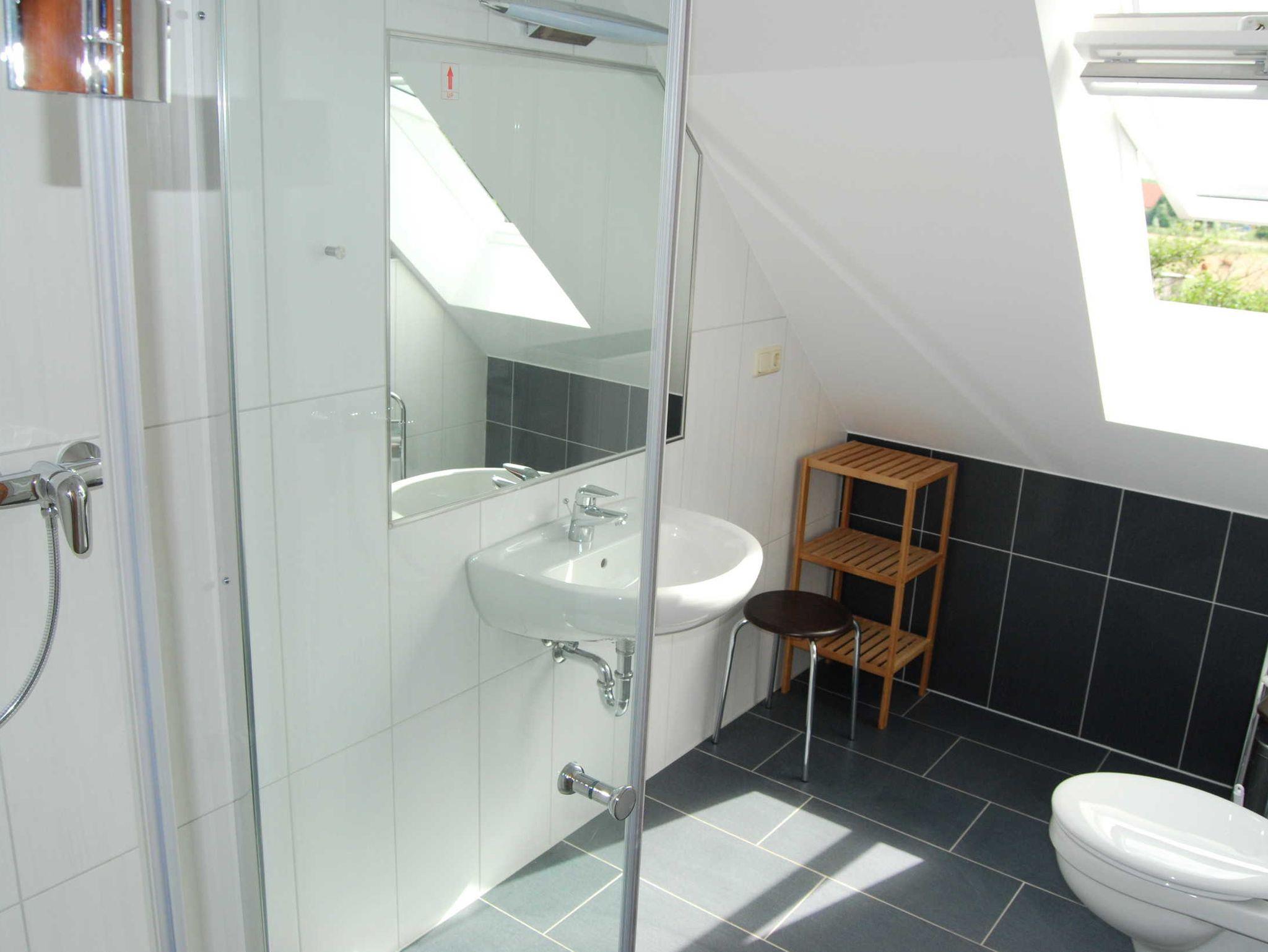 Das Bad hat eine ebenerdige Dusche und ein Fenster mit Blick ins Grüne (siehe Beispielbild bei den Außenansichten). Die separate Küche hat ebenfalls ein großes Fenster mit Blick ins Grüne. Die Ferienwohnungen 1 und 3 sind barrierefrei und rollstuhlgerecht.