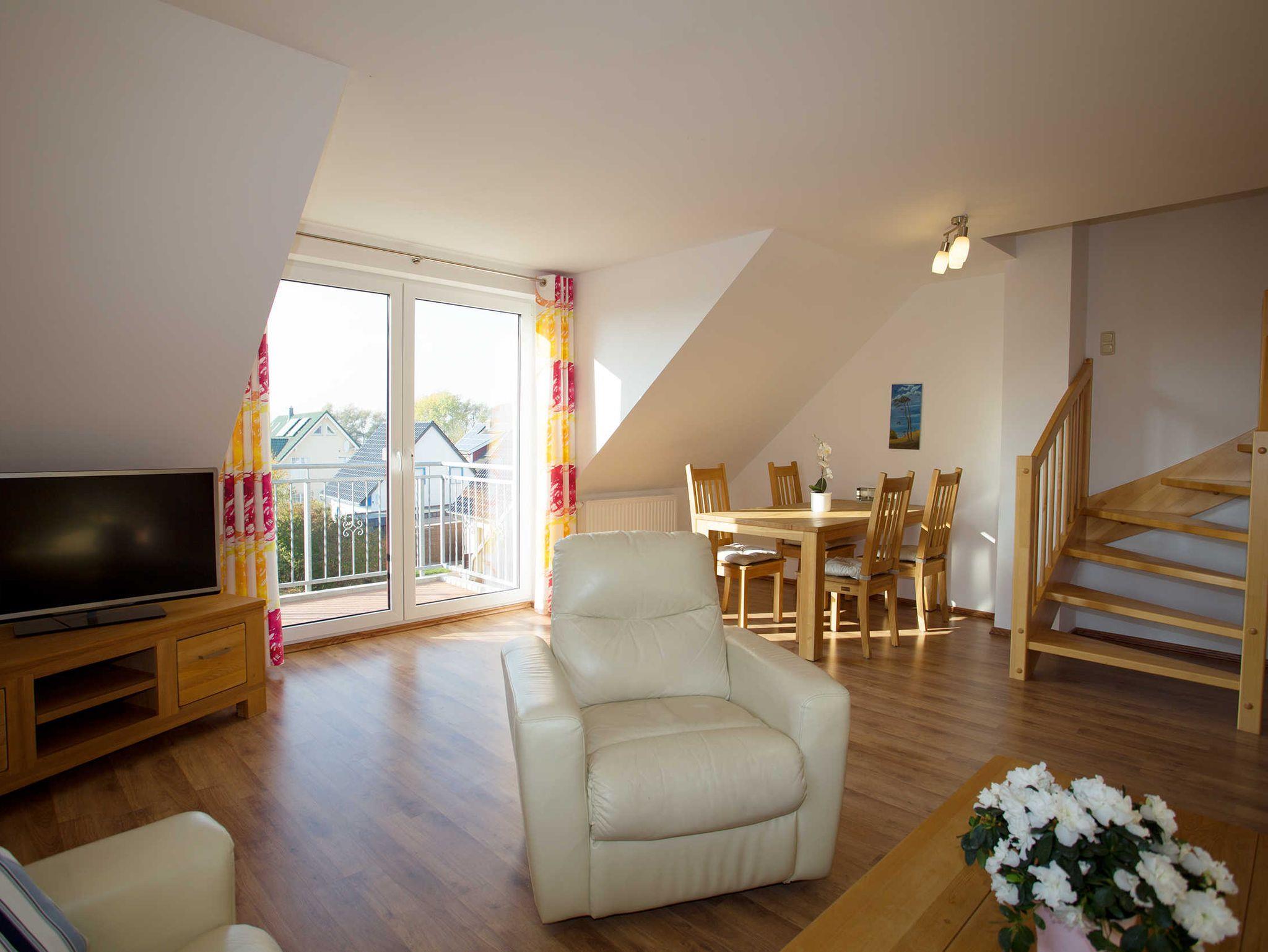 Der Wohnraum ist modern eingerichtet und verfügt über einen großen Flachbild-TV, einem Lowboard und Highboard sowie einer hellen Kunstledercouch (3-er Sofa, 2-er Sofa und verstellbarem Sofasessel) und einem großen massiven Esstisch mit passenden Holzstühlen. Vom Wohnraum ist der Zugang zum Balkon gegeben, von wo Sie aus einen tollen Blick auf den Wieker Bodden haben.