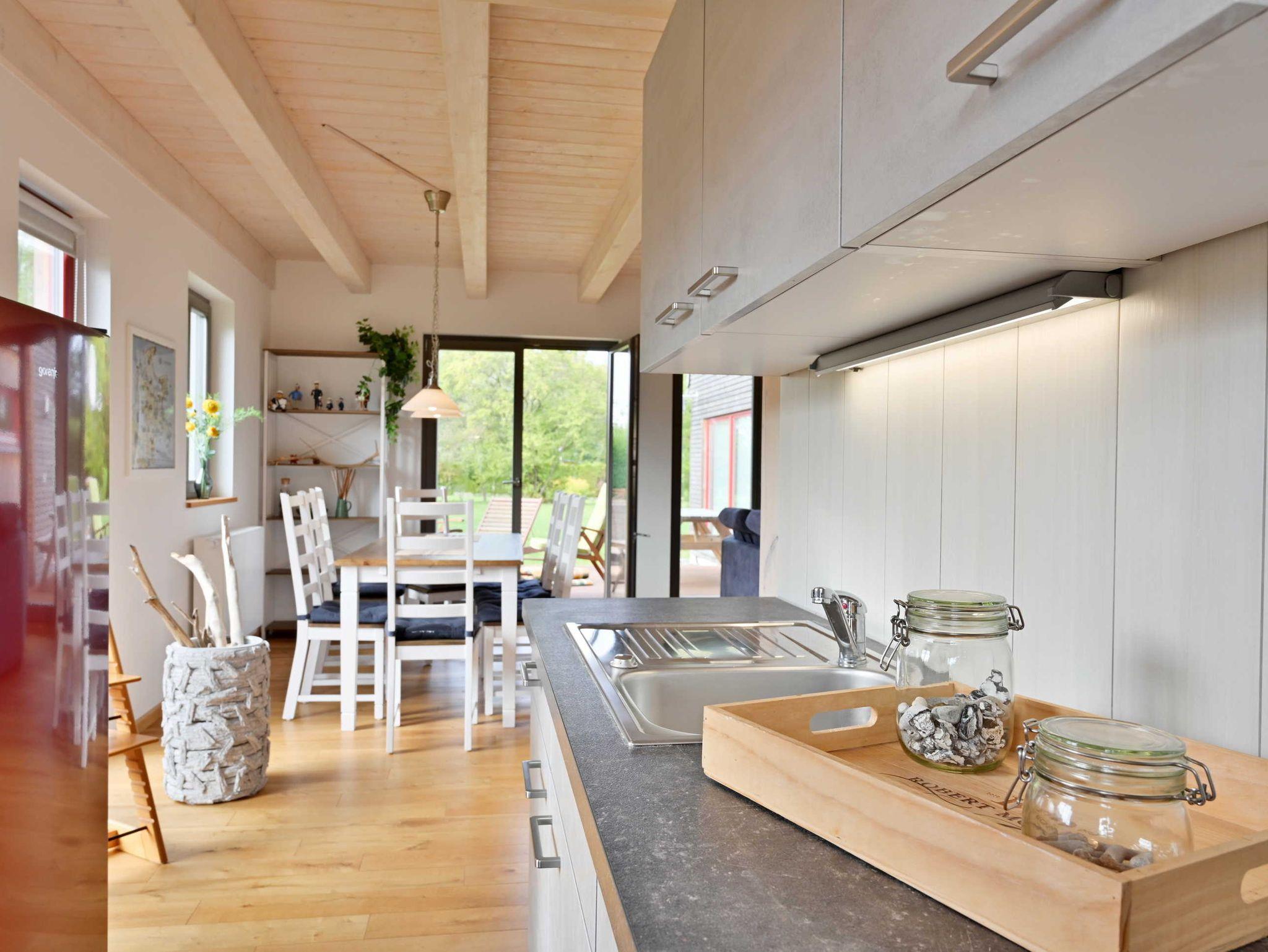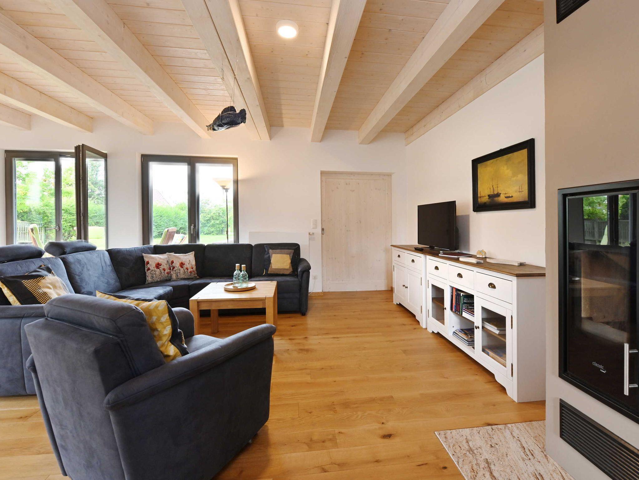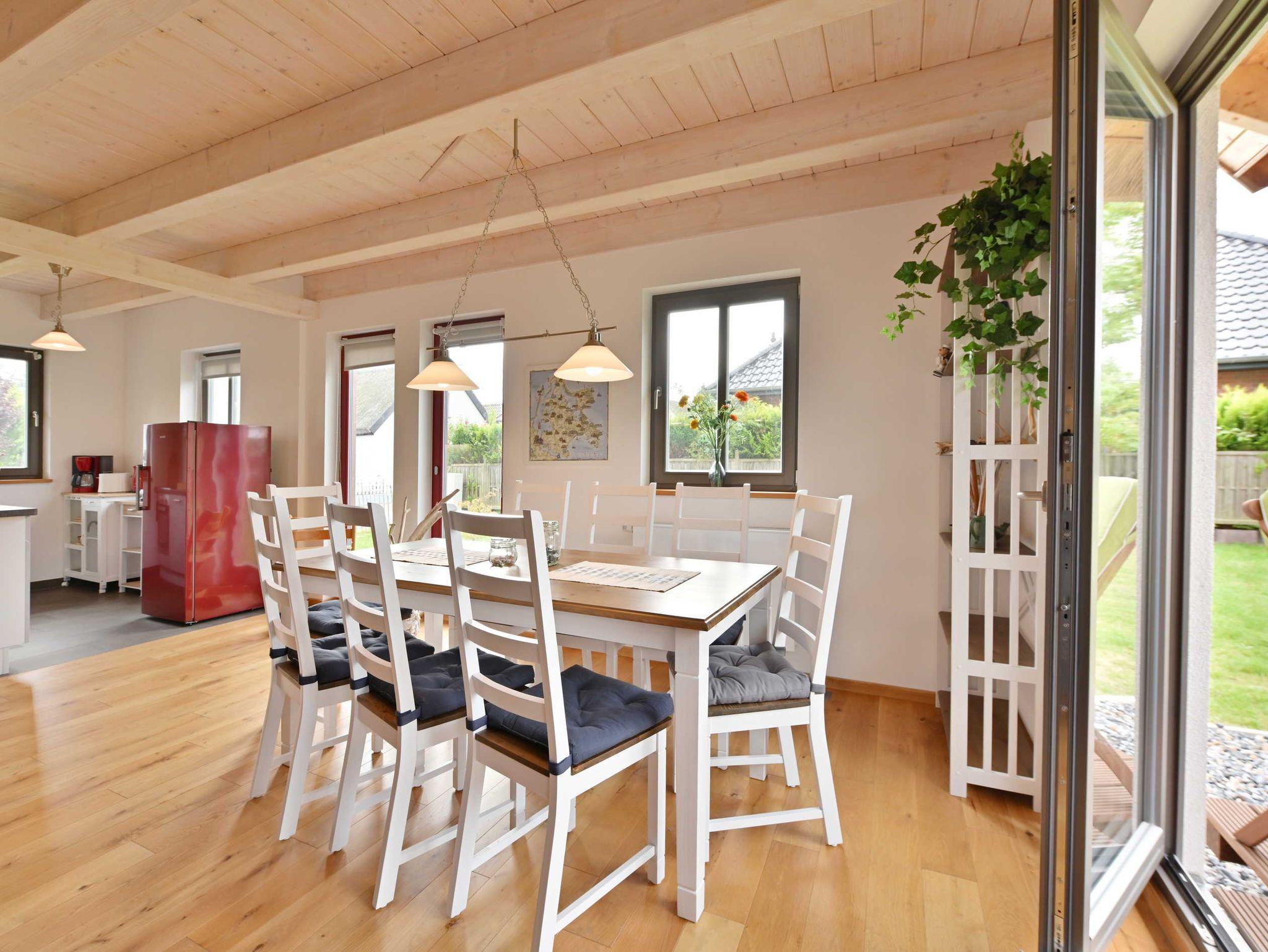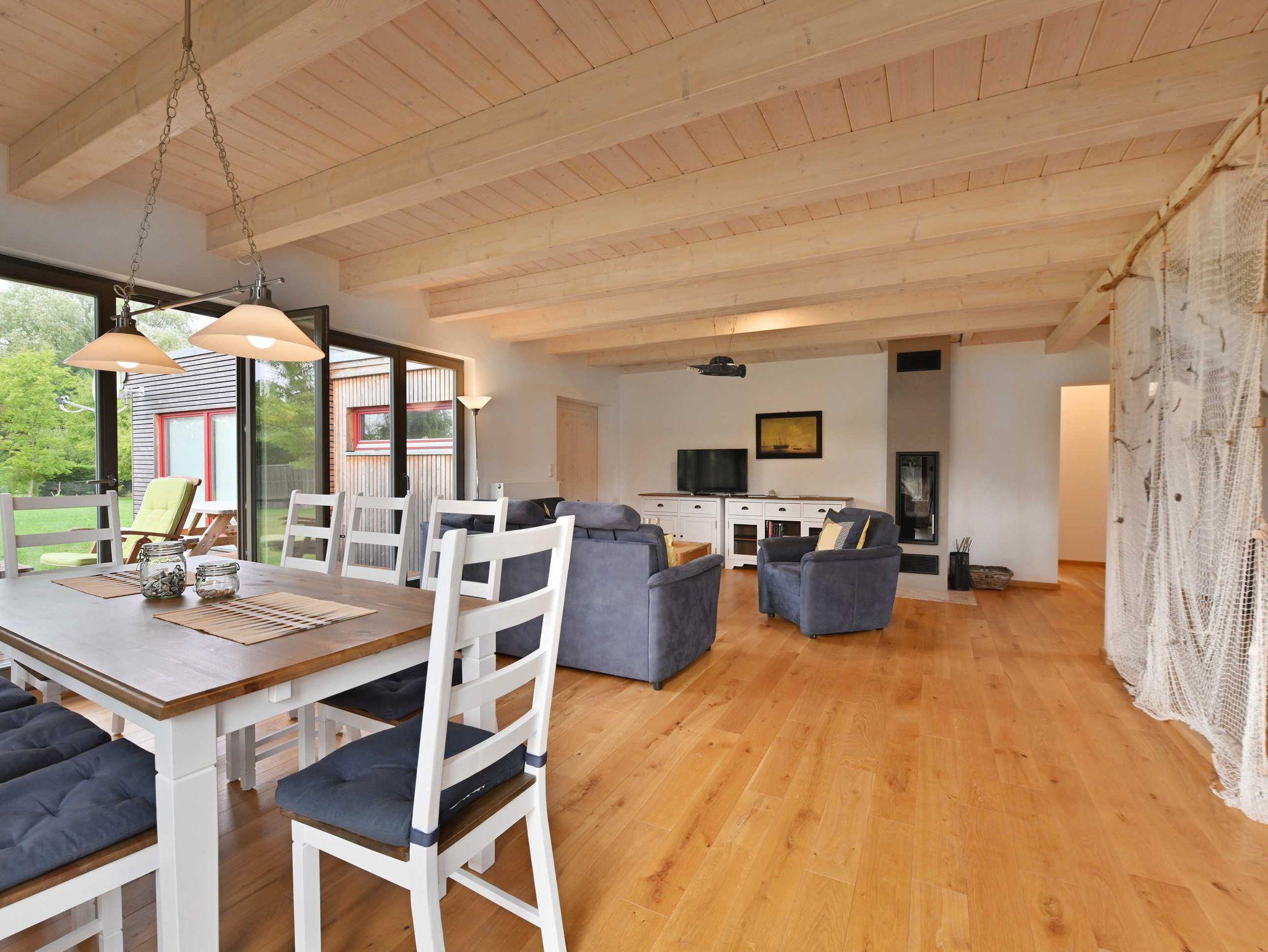 Das Haus ist großzügig mit angenehmem Raumklima durch Eichenholzdielen, Holzdecke und ökologische Zellulosedämmung.