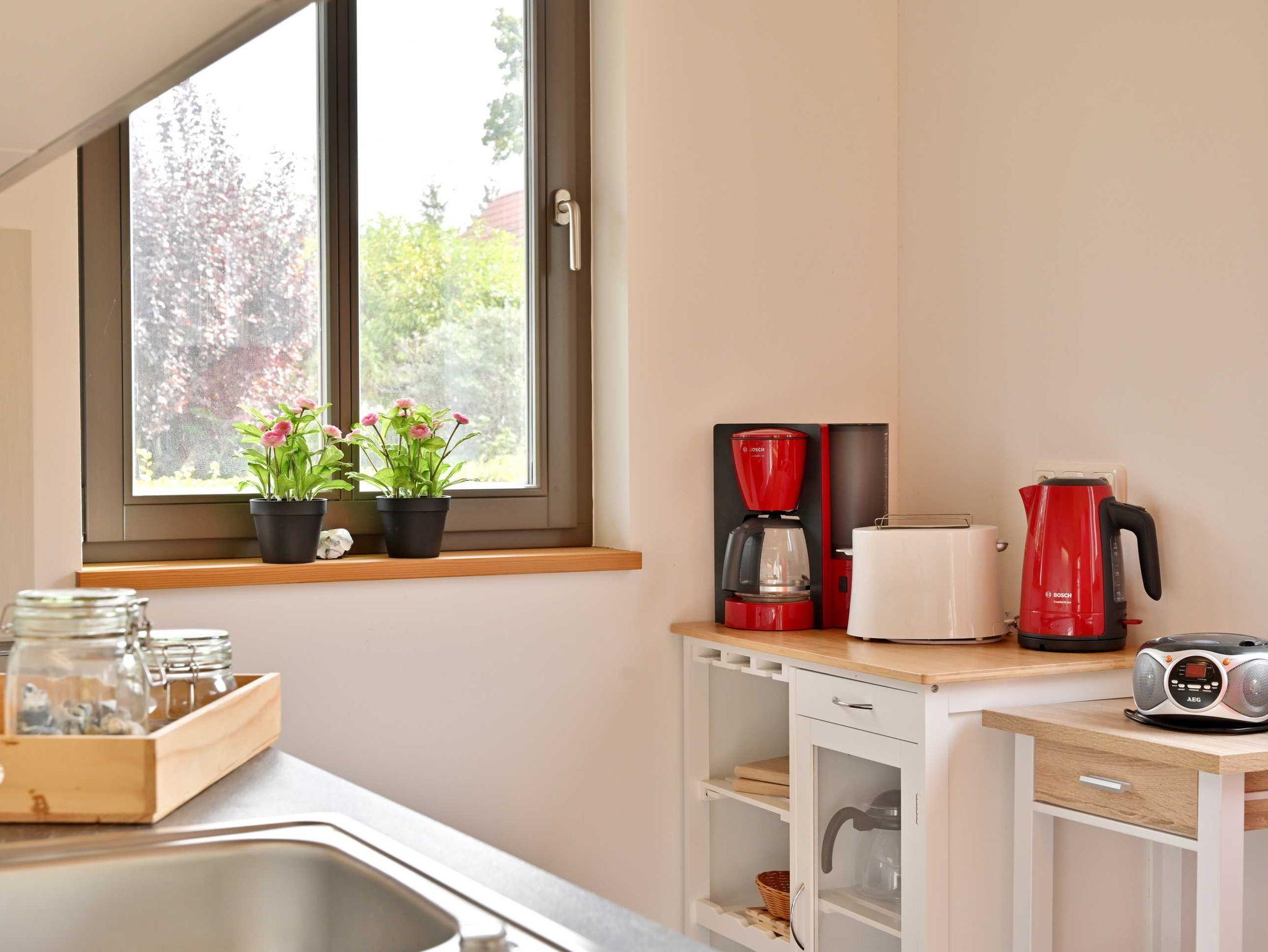 Küche mit Spülmaschine, Kaffeemaschine, Toaster, Wasserkocher