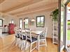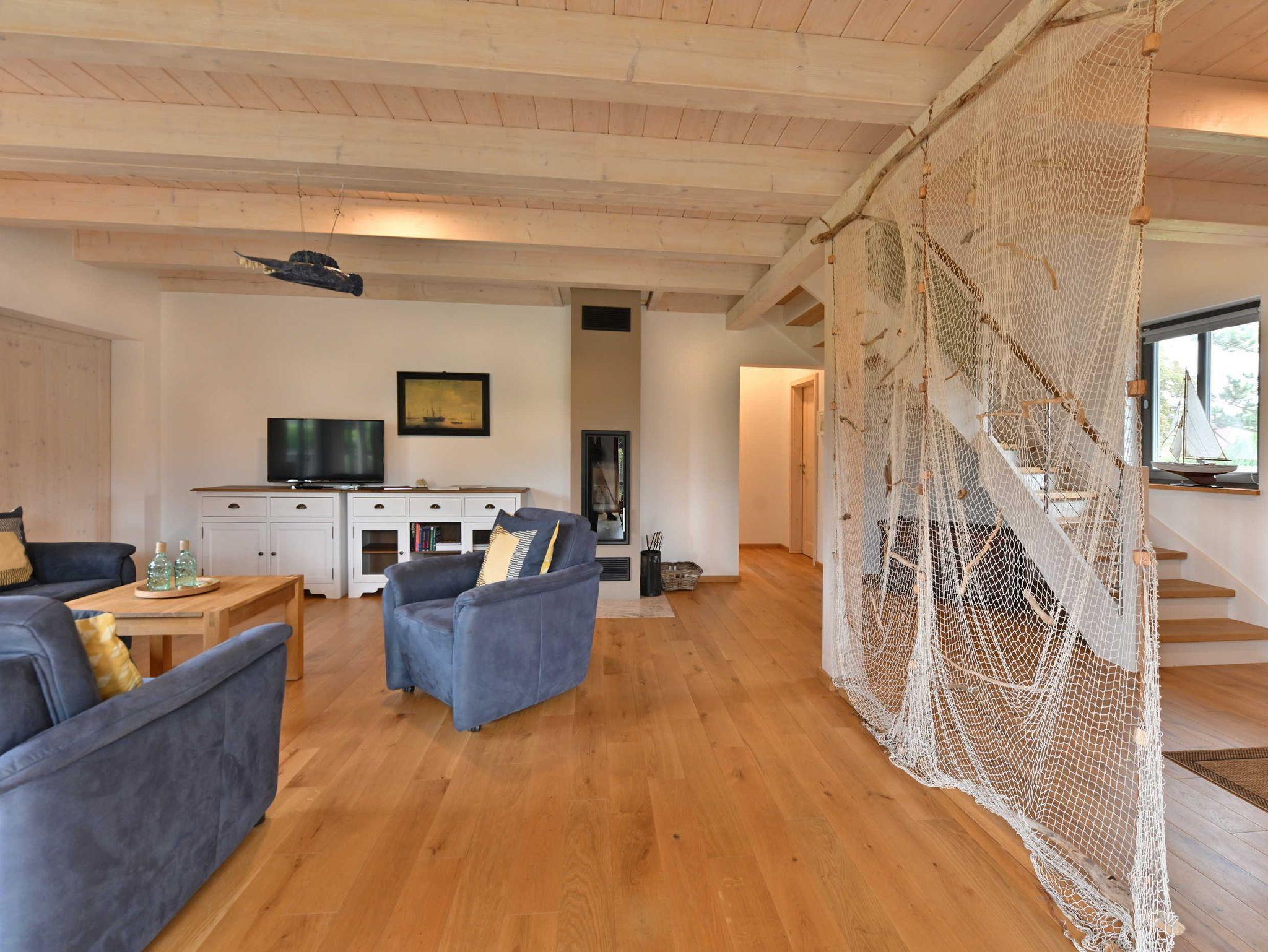 Der große Wohnbereich mit Holzmöbeln und Kamin sowie die Sonnenterrasse laden zum fröhlichen Beieinandersein ein!