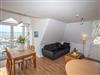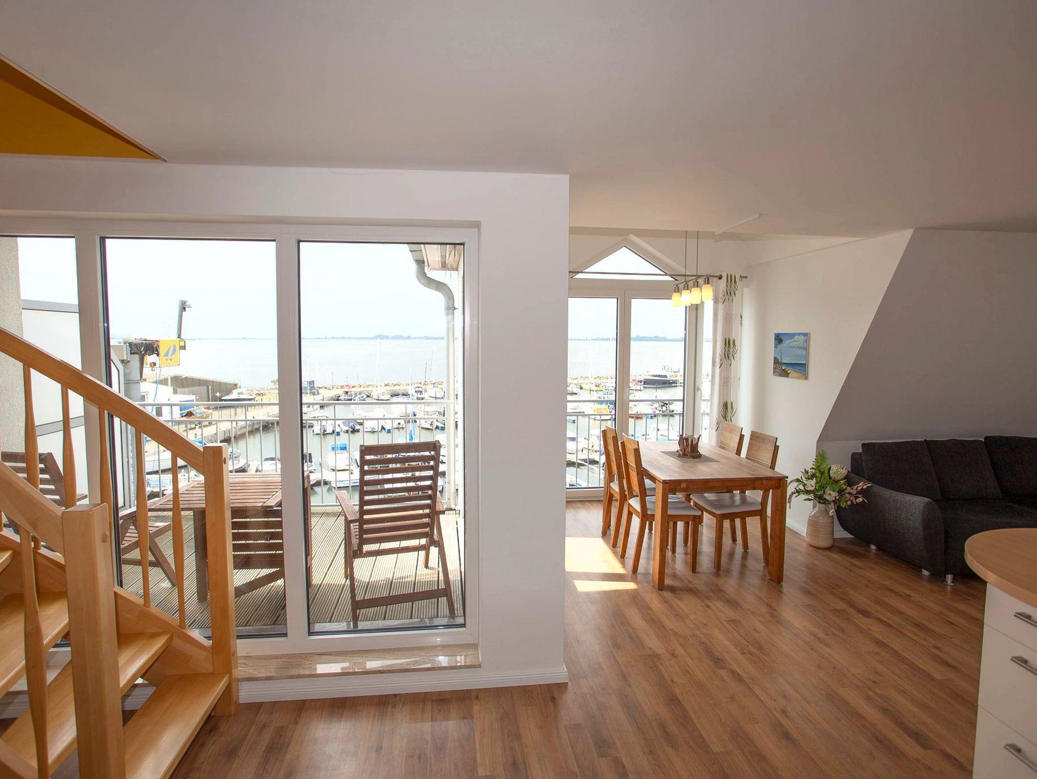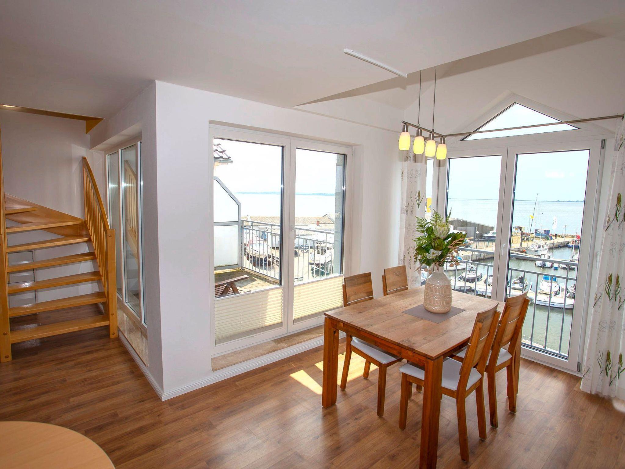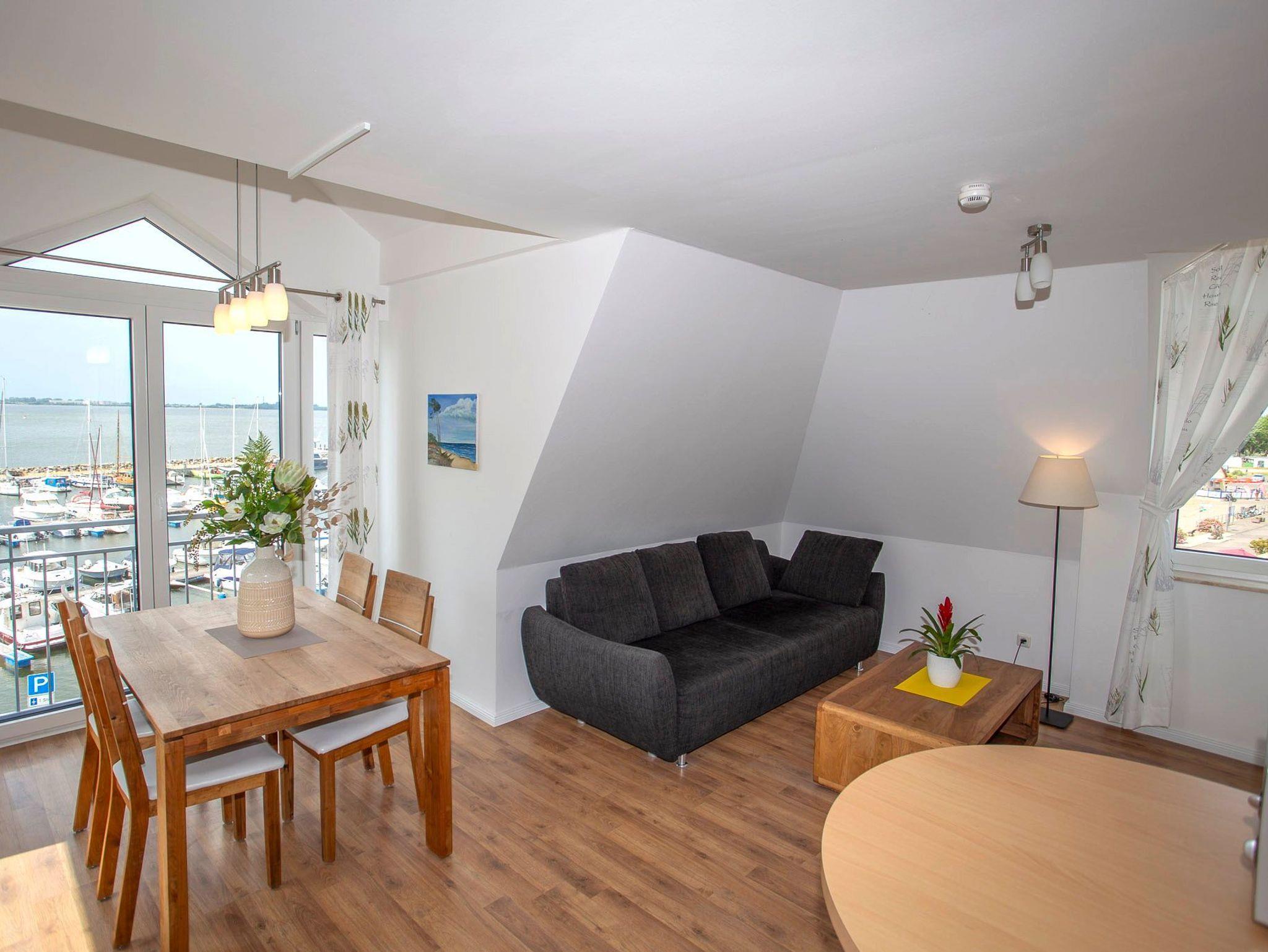 Der Wohnraum und die Küche sind offen gestaltet. Der Wohnraum ist modern eingerichtet und verfügt über einen großen Flachbild-TV, einer dunklen Couch und großen Couchtisch, sowie einem großen massiven Esstisch mit passenden Stühlen, von wo Sie aus einen fantastischen Blick über den Wieker Hafen haben. Vom Wohnraum ist der Zugang zum großen Balkon gegeben.