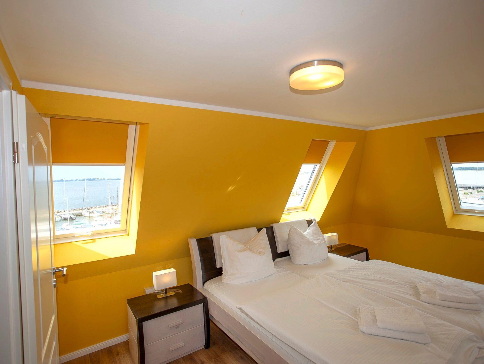 Der Wohnraum und die Küche sind offen gestaltet. Der Wohnraum ist modern eingerichtet und verfügt über einen großen Flachbild-TV, einer dunklen Couch und großen Couchtisch, sowie einem großen massiven Esstisch mit passenden Stühlen, von wo Sie aus einen fantastischen Blick über den Wieker Hafen haben. Vom Wohnraum ist der Zugang zum großen Balkon gegeben. Die Ferienwohnung verfügt über zwei separate Schlafzimmer mit jeweils einem Doppelbett (2,00 x 1,80m, einzelnen 21cm dicken Komfort-Kaltschaum-Matratzen sowie sehr guten Lattenrosten). Ein Schlafzimmer mit großem Kleiderschrank befindet sich auf der Wohnebene und ist separat.