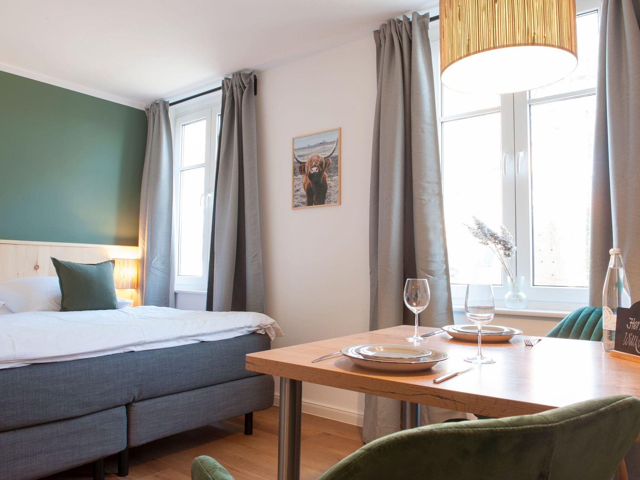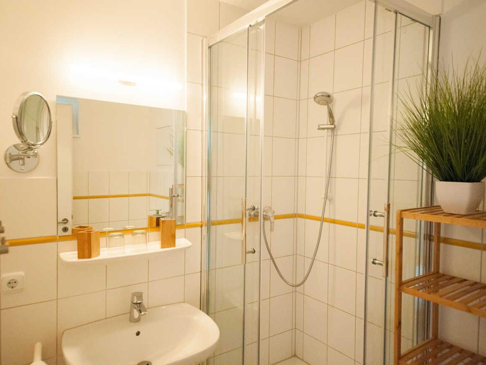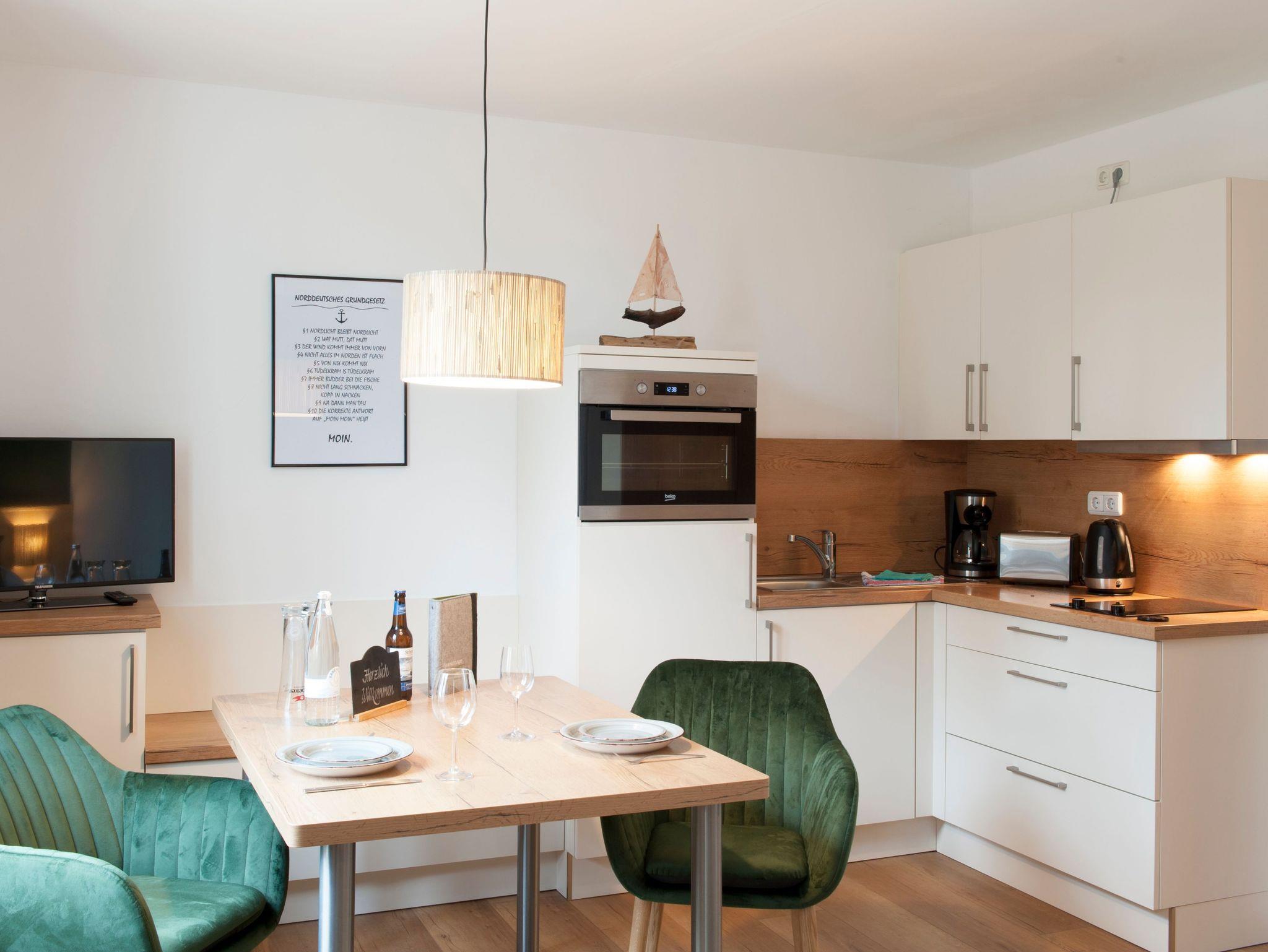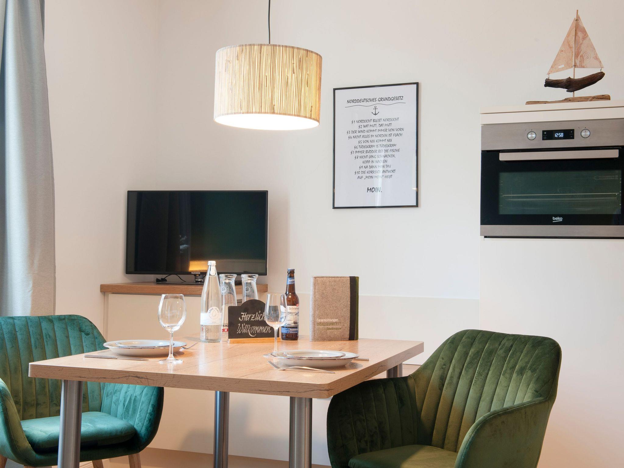 Die Küche verfügt über ein 2-fach Ceranfeld, Mikrowelle oder Backofen, Kühlschrank mit kleiner Gefriermöglichkeit, Kaffeemaschine oder Kaffeepresse, Toaster und Wasserkocher. Das Bad ist mit Dusche ausgestattet. Die Appartements haben selbstverständlich kostenlos WLAN/Internet, ein SMART-TV, sodass Mediatheken/youtube geschaut werden können und mit einer Spielesammlung kann man den Abend gemütlich ausklingen lassen.