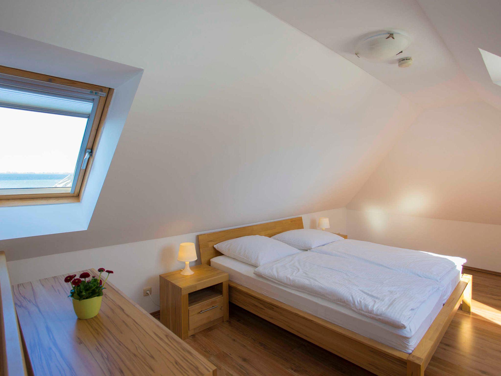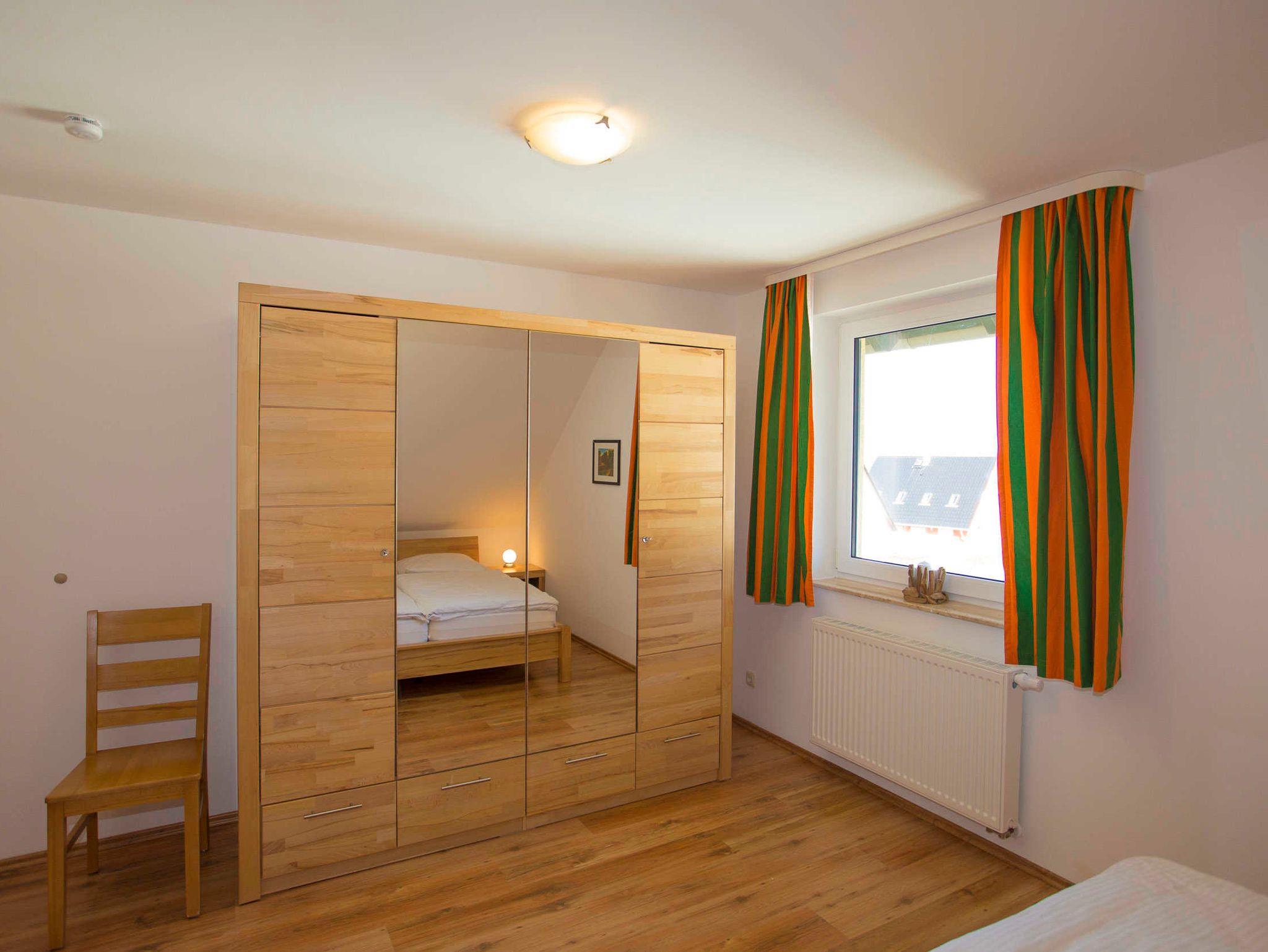 Die Ferienwohnung verfügt über zwei separate Schlafzimmer mit jeweils einem Doppelbett (2,00 x 1,80m, einzelnen 21cm dicken Komfort-Kaltschaum-Matratzen sowie sehr guten Lattenrosten). Ein Schlafzimmer befindet sich im Dachausbau und ist über eine offene Treppe vom Wohnzimmer aus zu erreichen. Es ist mit einem Sideboard ausgestattet. Im zweiten, separaten Schlafzimmer befindet sich ein großer Kleiderschrank.