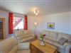 Der Wohnraum ist modern eingerichtet und verfügt über einen großen Flachbild-TV, einem Lowboard und Highboard sowie einer hellen Kunstledercouch (3-er Sofa, 2-er Sofa und verstellbarem Sofasessel) und einem großen massiven Esstisch mit passenden Holzstühlen. Vom Wohnraum ist der Zugang zum Balkon gegeben, von wo aus Sie einen tollen Blick auf den Wieker Bodden haben.