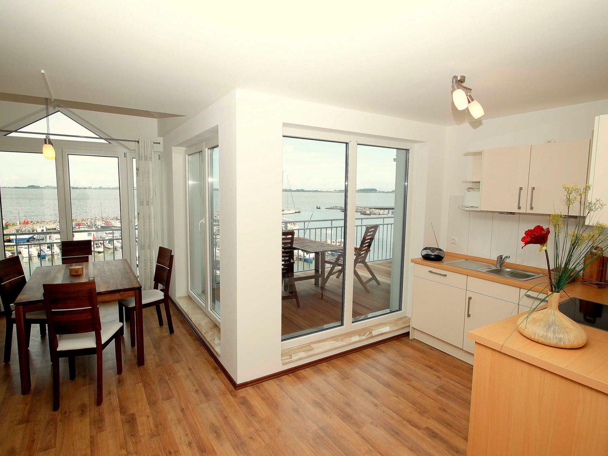 Der Wohnraum und die Küche sind offen gestaltet. Der Wohnraum ist modern eingerichtet und verfügt über einen großen Flachbild-TV, einer dunklen Couch und großen Couchtisch, sowie einem großen massiven Esstisch mit passenden Stühlen, von wo Sie aus einen fantastischen Blick über den Wieker Hafen haben. Vom Wohnraum ist der Zugang zum großen Balkon gegeben.