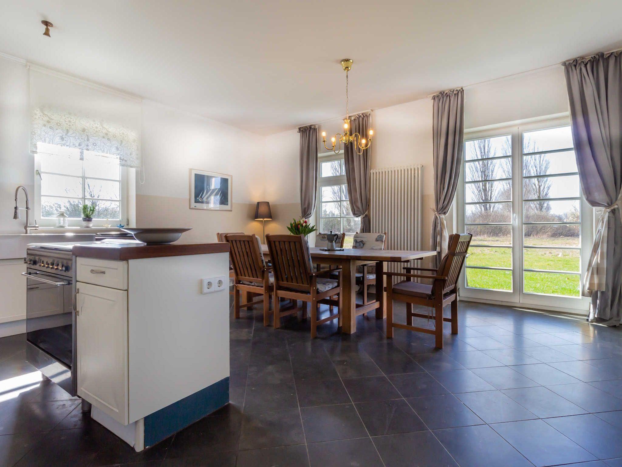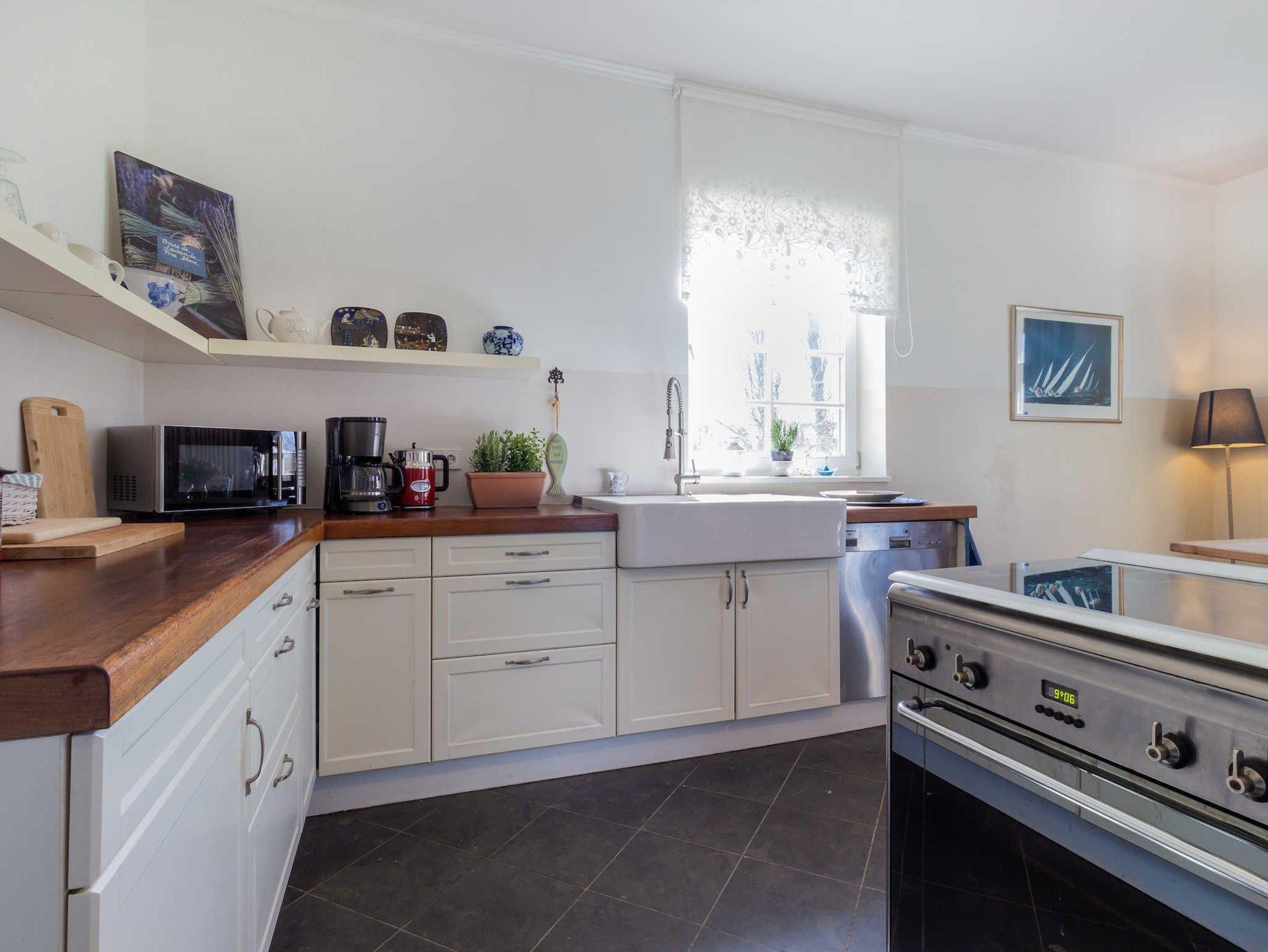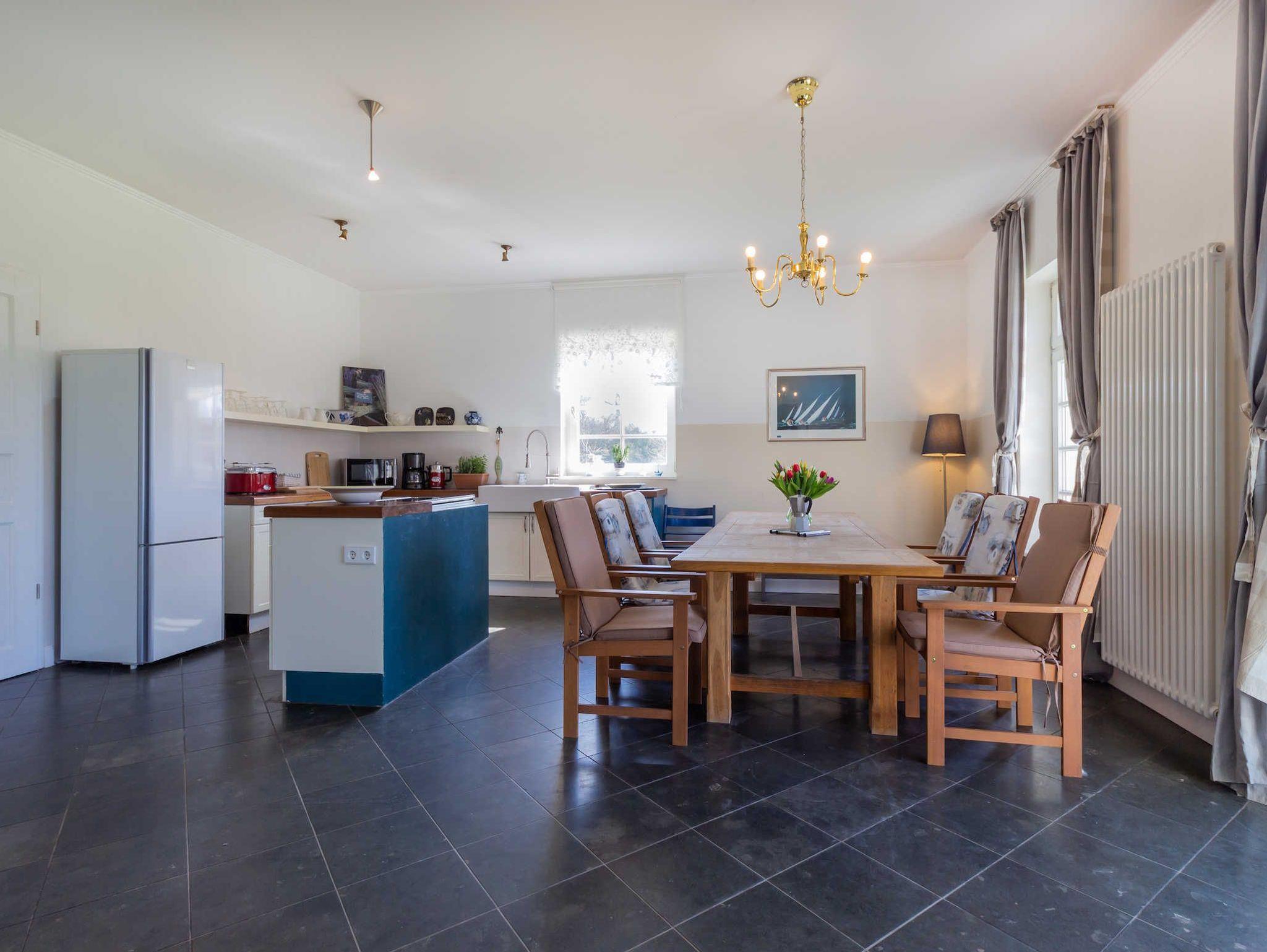 Die Küche ist ca. 30 m² groß, hat Platz für 12 Personen und verfügt über Kühlschrank mit Gefrierfach, Gasherd (5 Flammen) mit Elektrobackofen, Geschirrspülmaschine sowie über ausreichend Geschirr. Weiterhin gibt es einen Wasserkocher, Toaster und Mikrowelle. Kinderhochstühle sind vorhanden und werden kostenfrei zur Verfügung gestellt. Von der Küche aus kommt man direkt in den Garten. Das 30 m² große Wohnzimmer hat ebenfalls Zugang zum Garten, einen offenen Kamin.