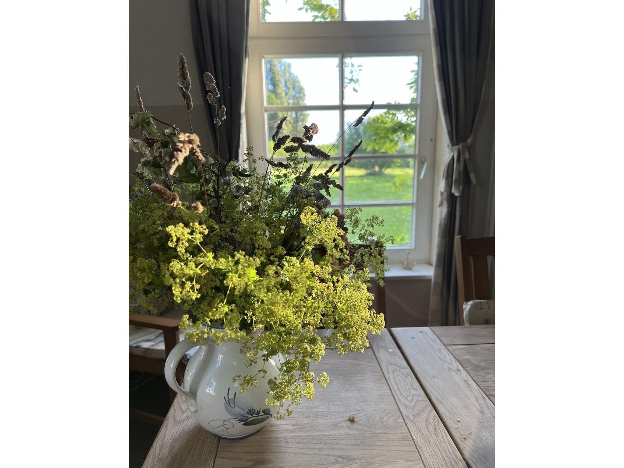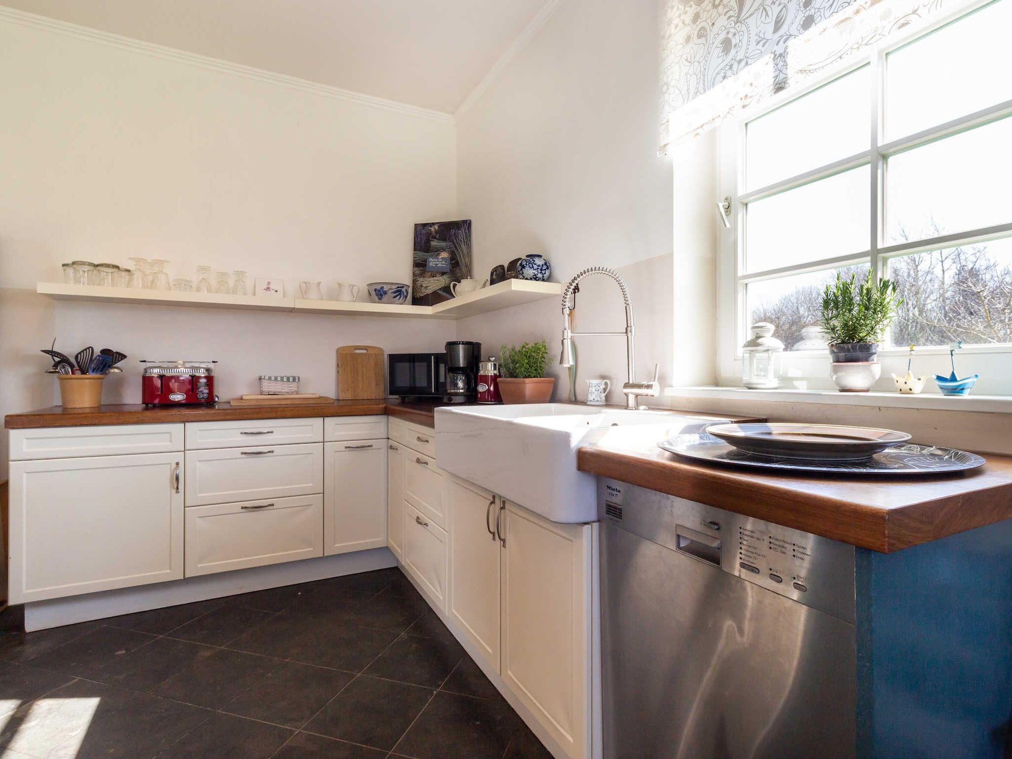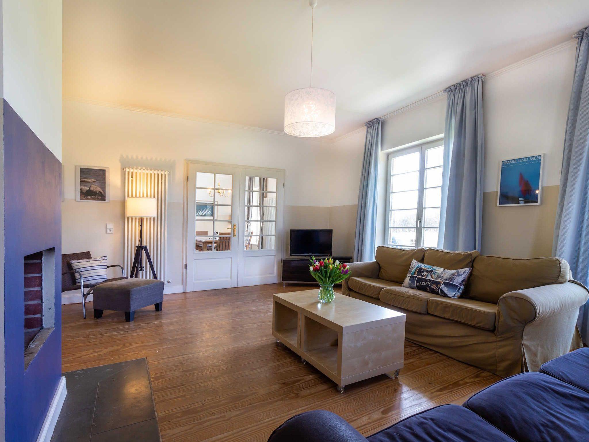 Die Küche ist ca. 30 m² groß, hat Platz für 12 Personen und verfügt über Kühlschrank mit Gefrierfach, Gasherd (5 Flammen) mit Elektrobackofen, Geschirrspülmaschine sowie über ausreichend Geschirr. Weiterhin gibt es einen Wasserkocher, Toaster und Mikrowelle. Kinderhochstühle sind vorhanden und werden kostenfrei zur Verfügung gestellt. Von der Küche aus kommt man direkt in den Garten. Das 30 m² große Wohnzimmer hat ebenfalls Zugang zum Garten, einen offenen Kamin.