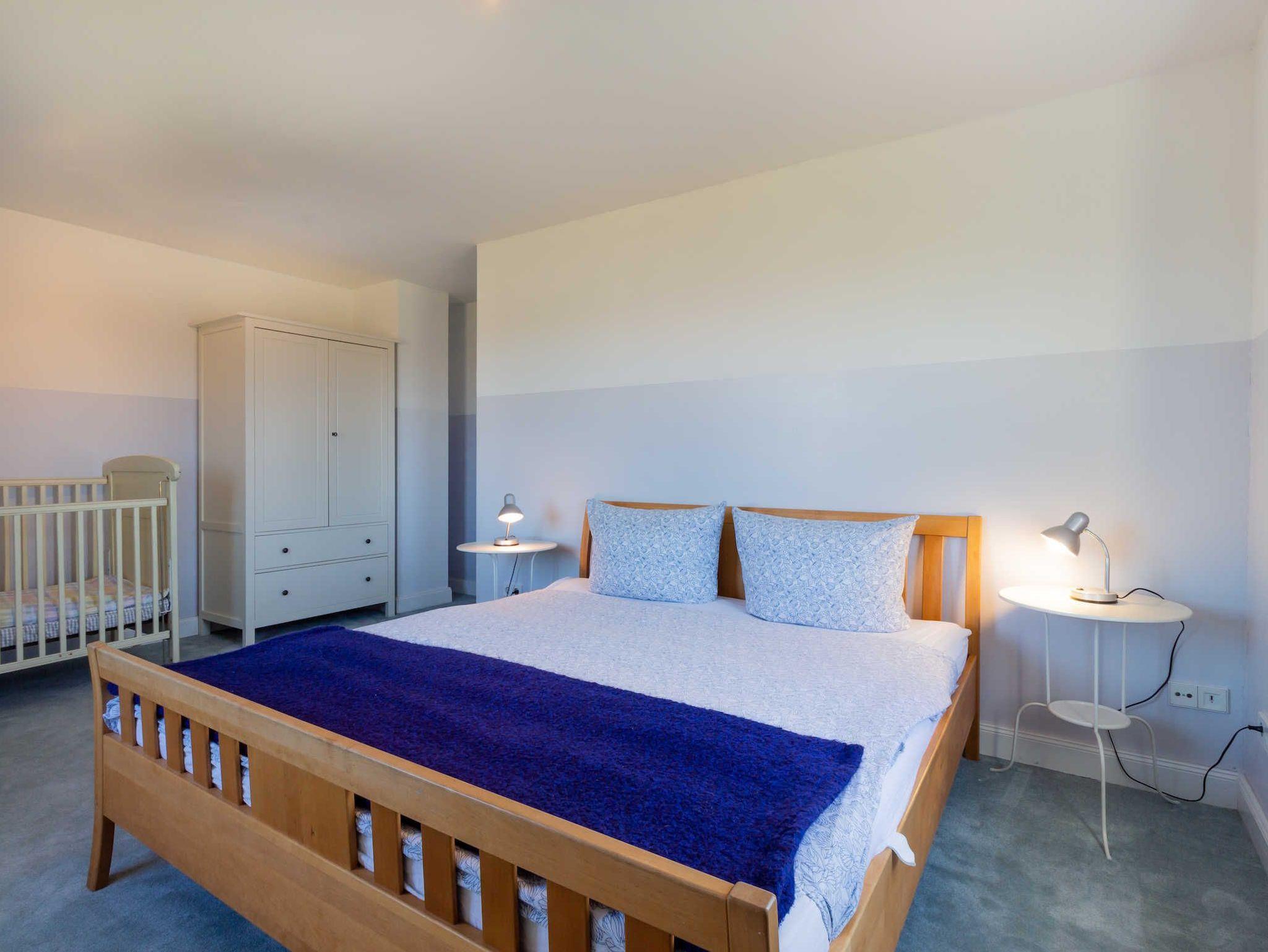 Die Schlafzimmer verfügen über Doppelbetten mit 160 cm (3 Schlafzimmer), 180 cm Breite (2 Schlafzimmer) sowie 2 Einzelbetten 90 cm (1 Schlafzimmer). Es gibt ein Kinderbett und ein Kinderreisebett. Die Schlafzimmer sind zwischen 14 und 22 m² groß. Ein Schlafzimmer hat sogar einen Balkon.