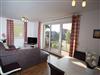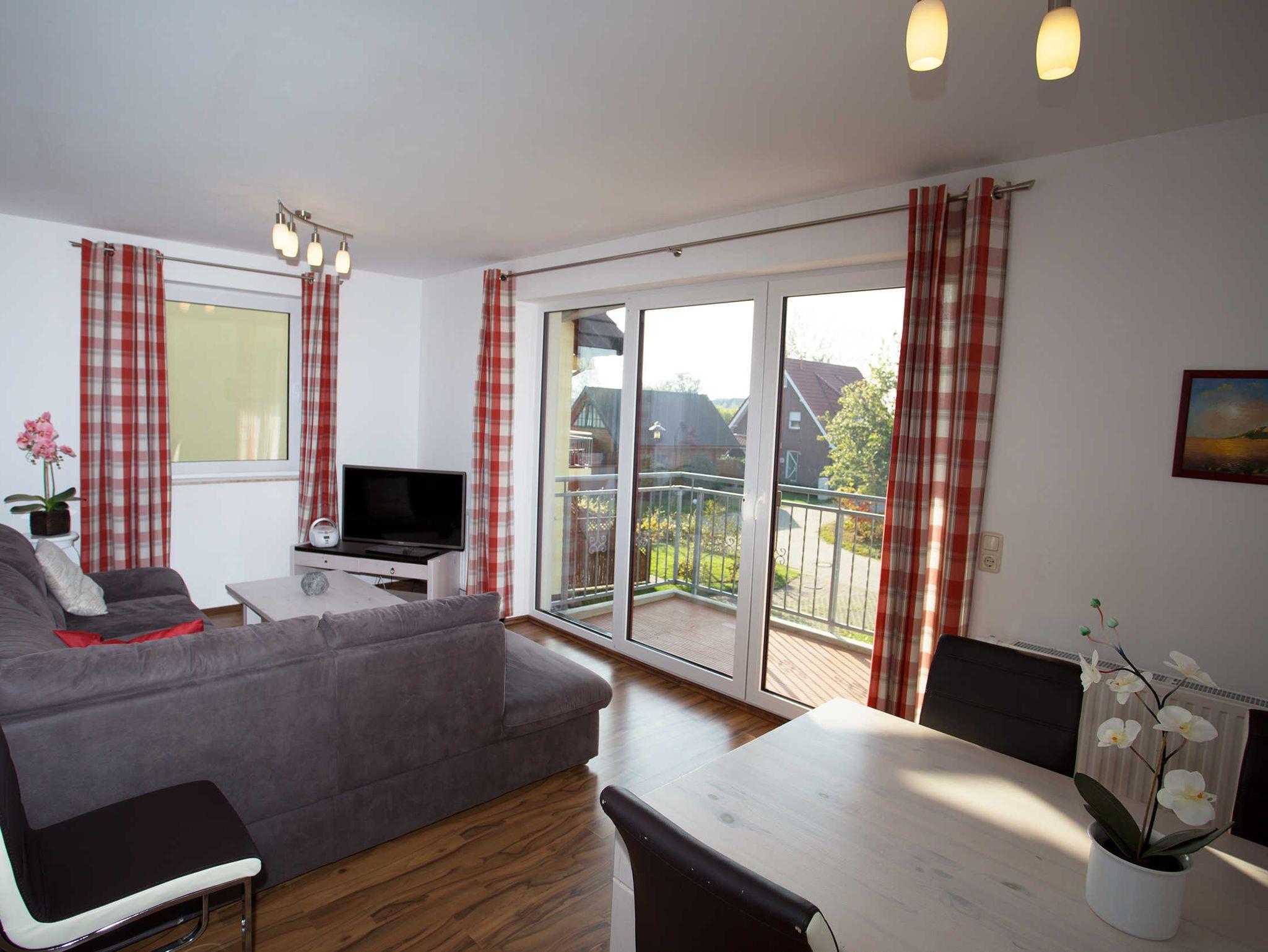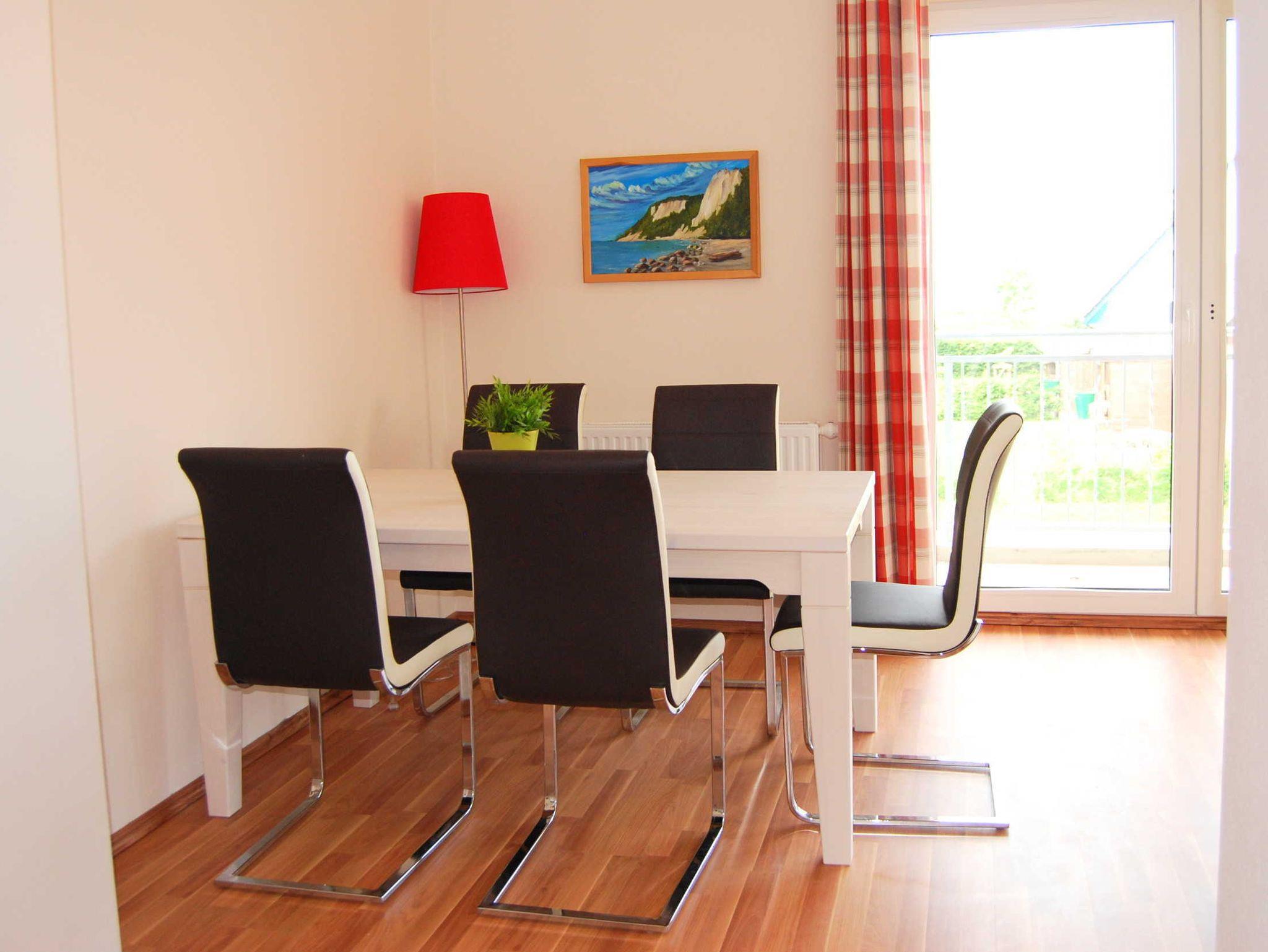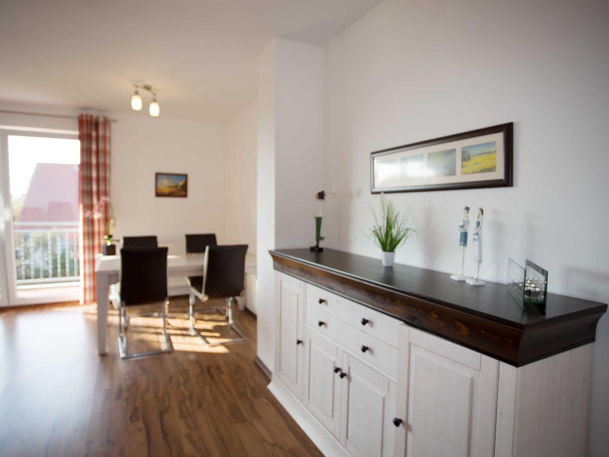Die modern, hell und individuell ausgestattete 63 qm große 3-Raum-Ferienwohnung in Wiek befindet sich im 1. Obergeschoss in der Villa Wittow im Ort Wiek auf der Insel Rügen. Der Wohnraum ist geschmackvoll eingerichtet und verfügt über einen Flachbild-TV, einem Lowboard und Sideboard sowie einer ausziehbaren braunen Ledercouch und einem großen massiven Holzesstisch mit 6 Schwingstühlen aus weiß/braunem Kunstleder. Vom Wohnraum ist der Zugang zum Balkon gegeben.