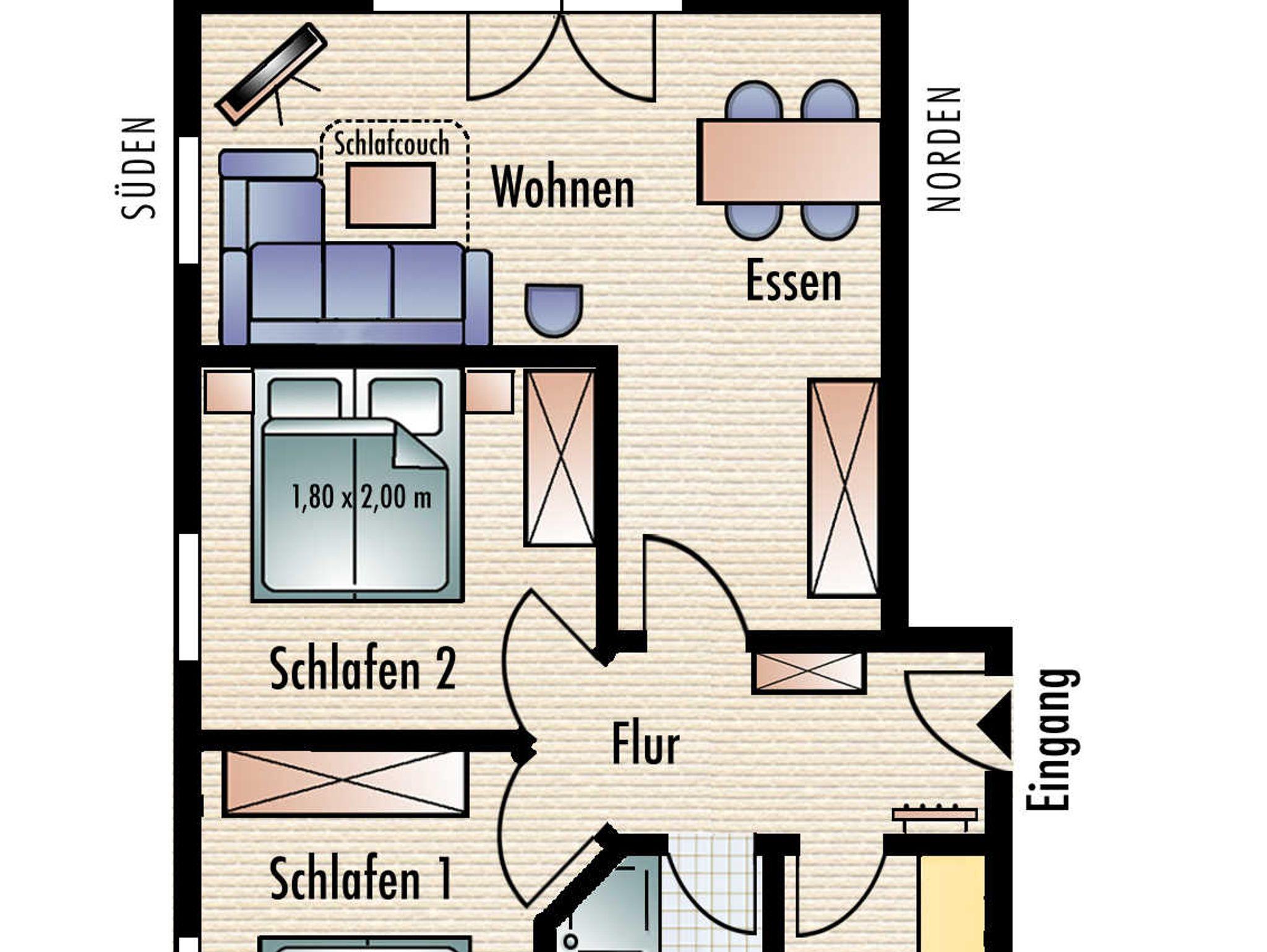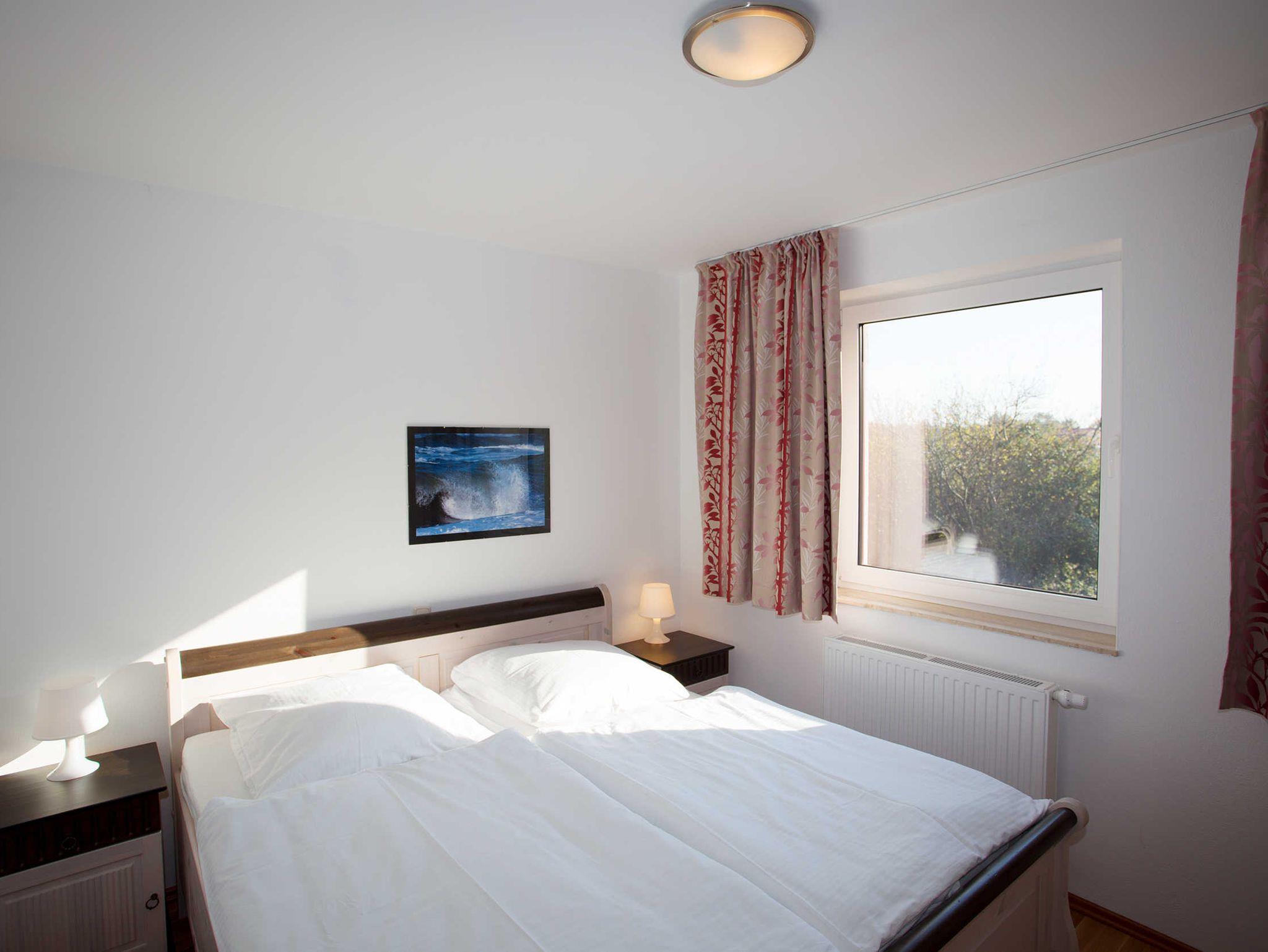Die Ferienwohnung verfügt über zwei separate Schlafzimmer mit jeweils einem Doppelbett (2,00 x 1,80m, einzelnen 21cm dicken Komfort-Kaltschaum-Matratzen sowie sehr guten Lattenrosten) und jeweils einen großen Kleiderschrank.