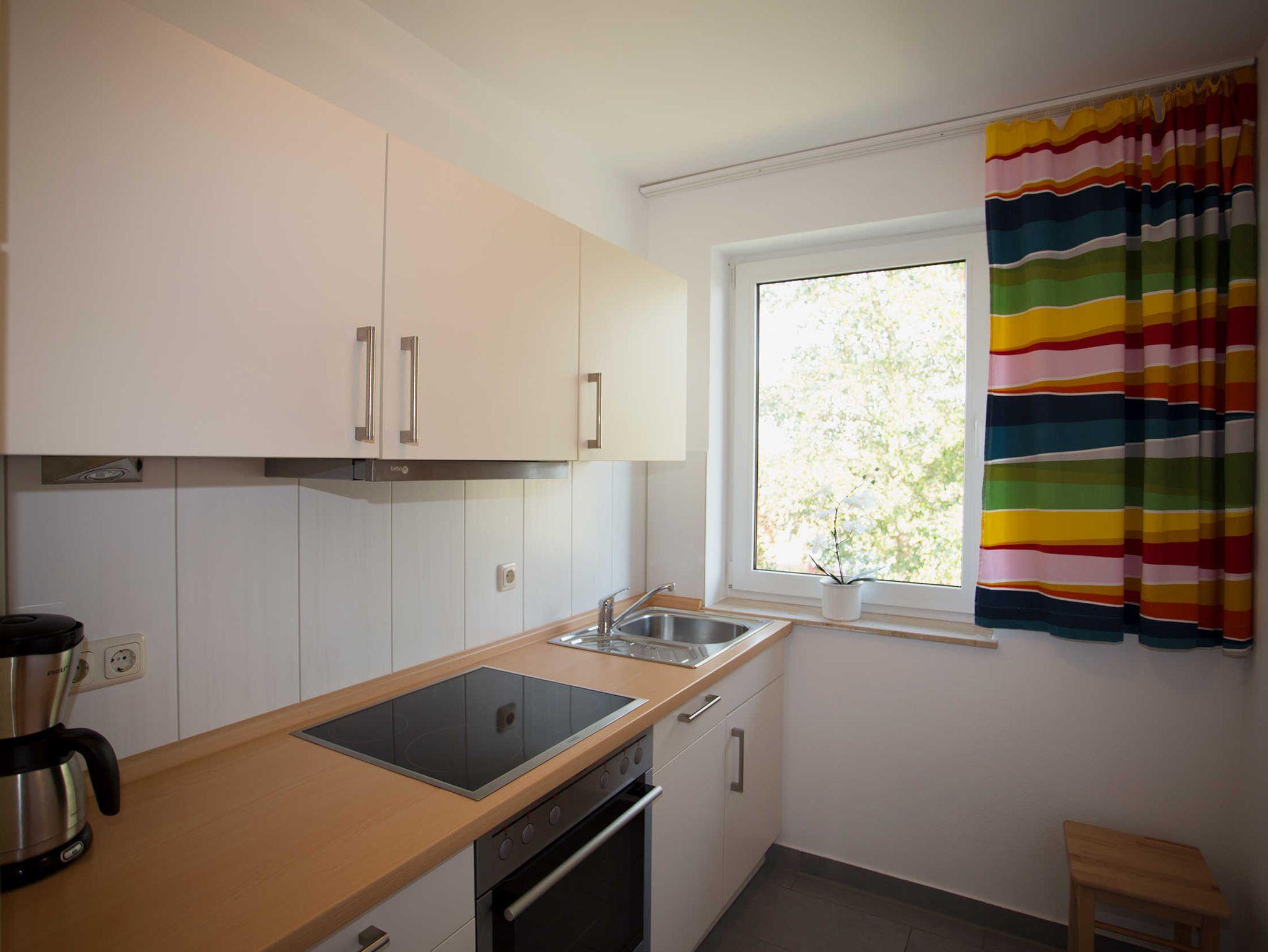 Das Bad hat eine ebenerdige Dusche und ein Fenster mit Blick ins Grüne (siehe Beispielbild bei den Außenansichten). Die separate Küche hat ebenfalls ein großes Fenster mit Blick ins Grüne. Die Ferienwohnungen 1 und 3 sind barrierefrei und rollstuhlgerecht.
