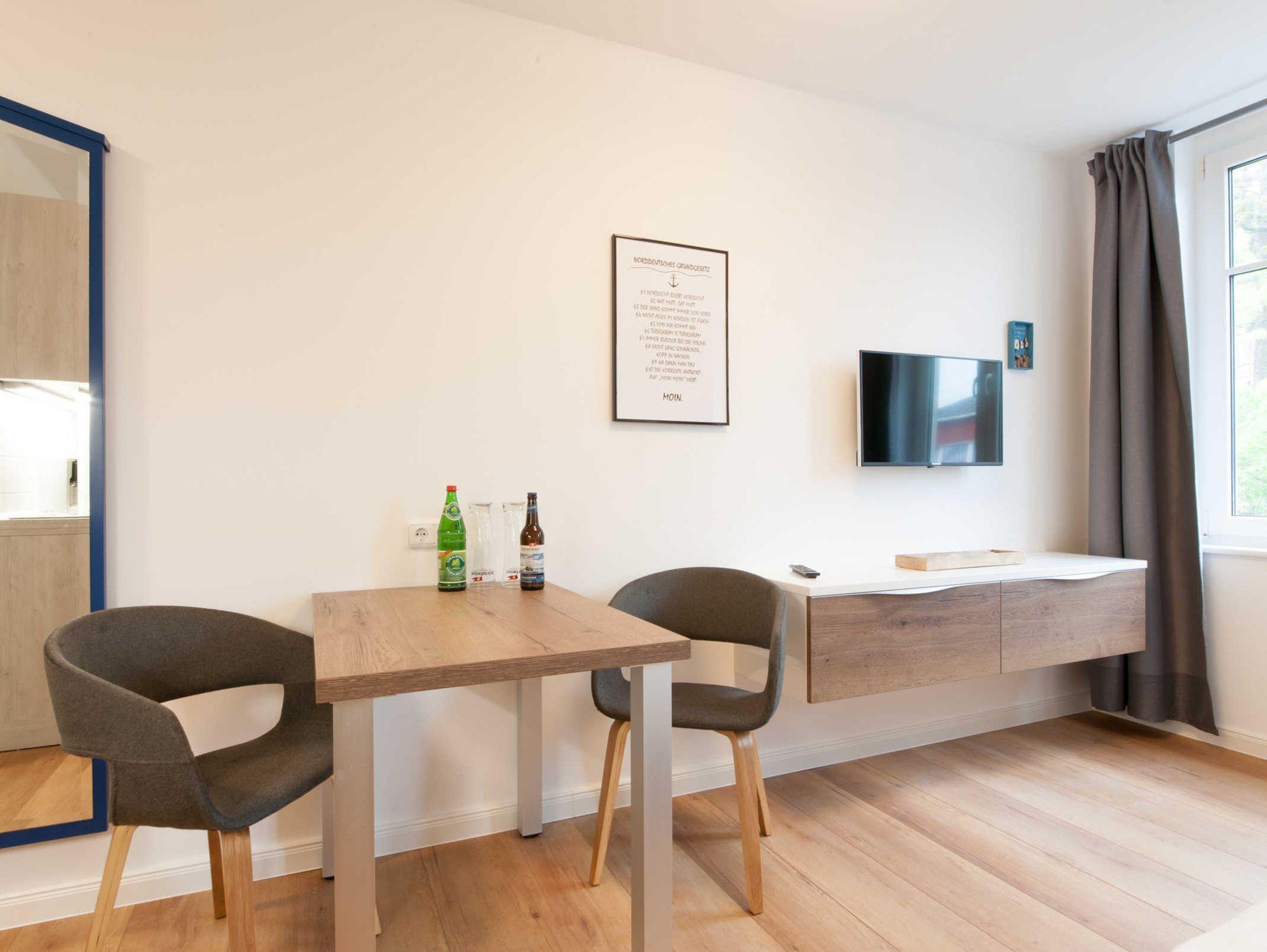 Die Küche verfügt über ein 2-fach Ceranfeld, Mikrowelle oder Backofen, Kühlschrank mit kleiner Gefriermöglichkeit, Kaffeemaschine oder Kaffeepresse, Toaster und Wasserkocher. Das Bad ist mit Dusche ausgestattet. Die Appartements haben selbstverständlich kostenlos WLAN/Internet, ein SMART-TV, sodass Mediatheken/youtube geschaut werden können und mit einer Spielesammlung kann man den Abend gemütlich ausklingen lassen.