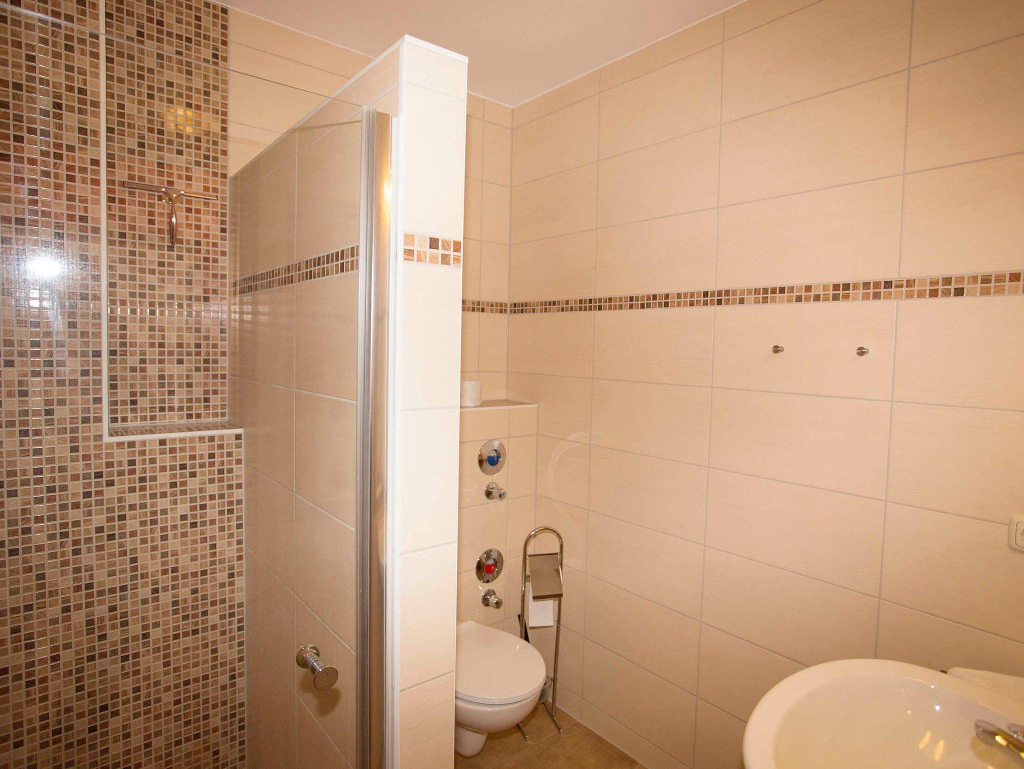 Die Küche (offen) ist mit AEG-Geräten ausgestattet: Geschirrspüler, Backofen, 4-Platten-Ceranfeld. Der große Kühlschrank mit Gefrierfach ist von Privileg. Die Küche ist weiterhin mit Toaster, Kaffeemaschine, Wasserkocher, Messerblock, Töpfe, Pfanne sowie ausreichend Geschirr und Besteck ausgestattet. Das Bad mit ebenerdiger Glasdusche, WC, Waschbecken und großem Spiegel ist inneliegend.