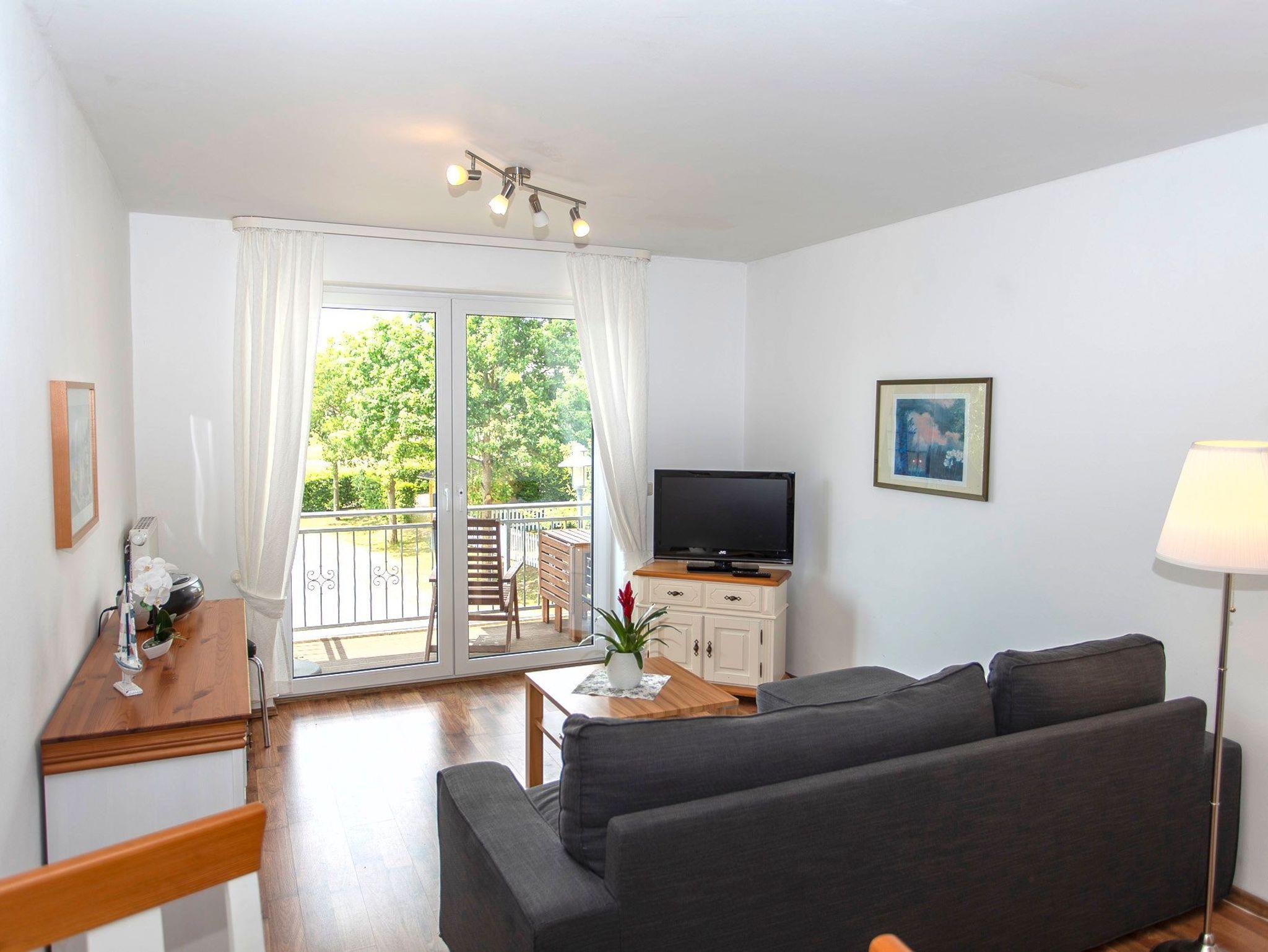 Die modern und individuell eingerichtete 2-Raum Ferienwohnung in Wiek auf der Insel Rügen befindet sich im 1. Obergeschoss im Haus Boddenblick. Sie hat eine Grundfläche von ca. 40qm. Vom Wohn- und Schlafraum gibt es direkten Zugang zum großen Balkon, von den aus man einen Blick durch die Gärten der benachbarten Wohnhäuser bis zum Bodden hat.