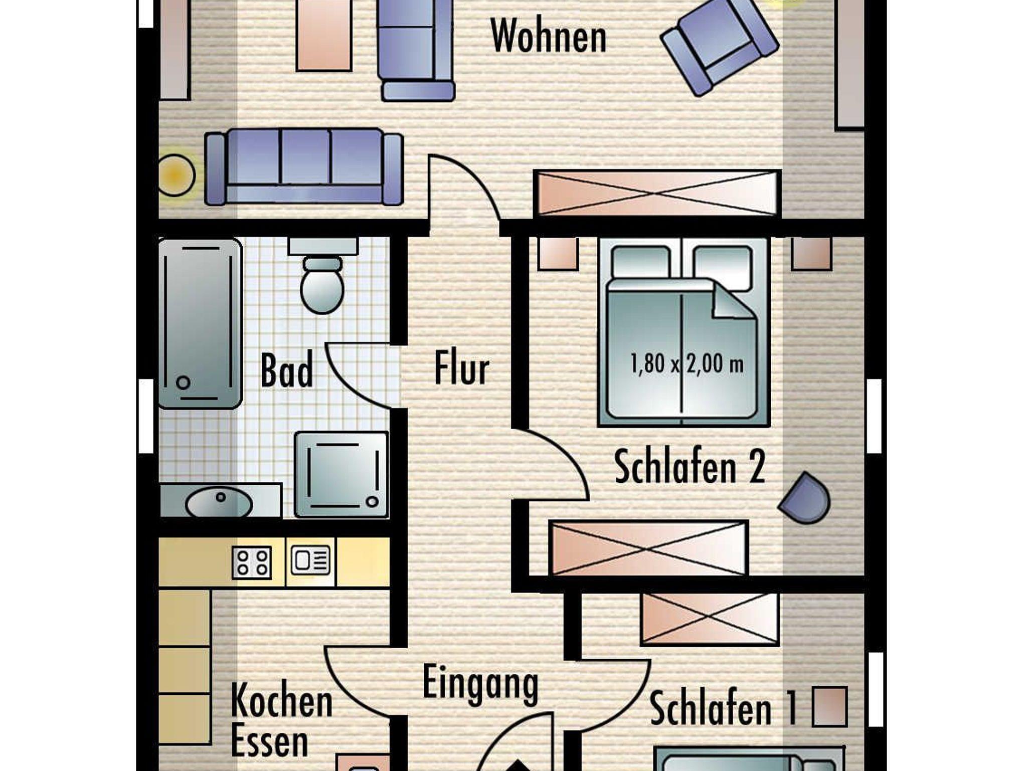 Die Ferienwohnung verfügt über zwei separate Schlafzimmer mit jeweils einem Doppelbett (2,00 x 1,80m, einzelnen 21cm dicken Komfort-Kaltschaum-Matratzen sowie sehr guten Lattenrosten). In einem Schlafzimmer befindet sich ein großer Kleiderschrank und in anderem ein Sideboard.