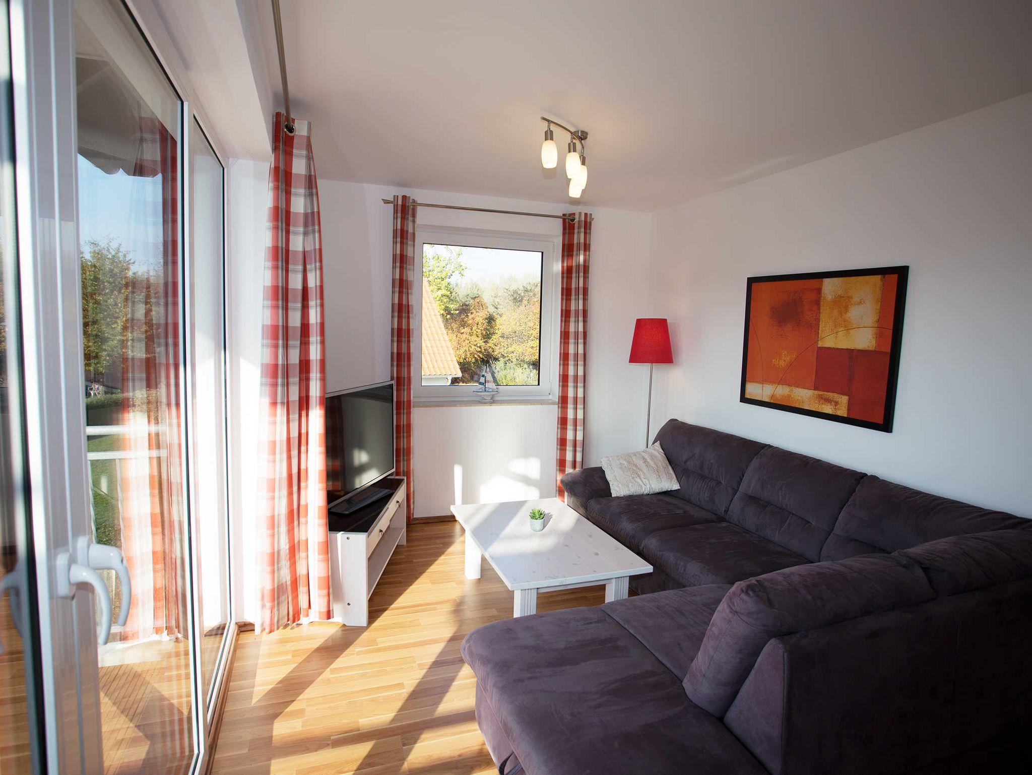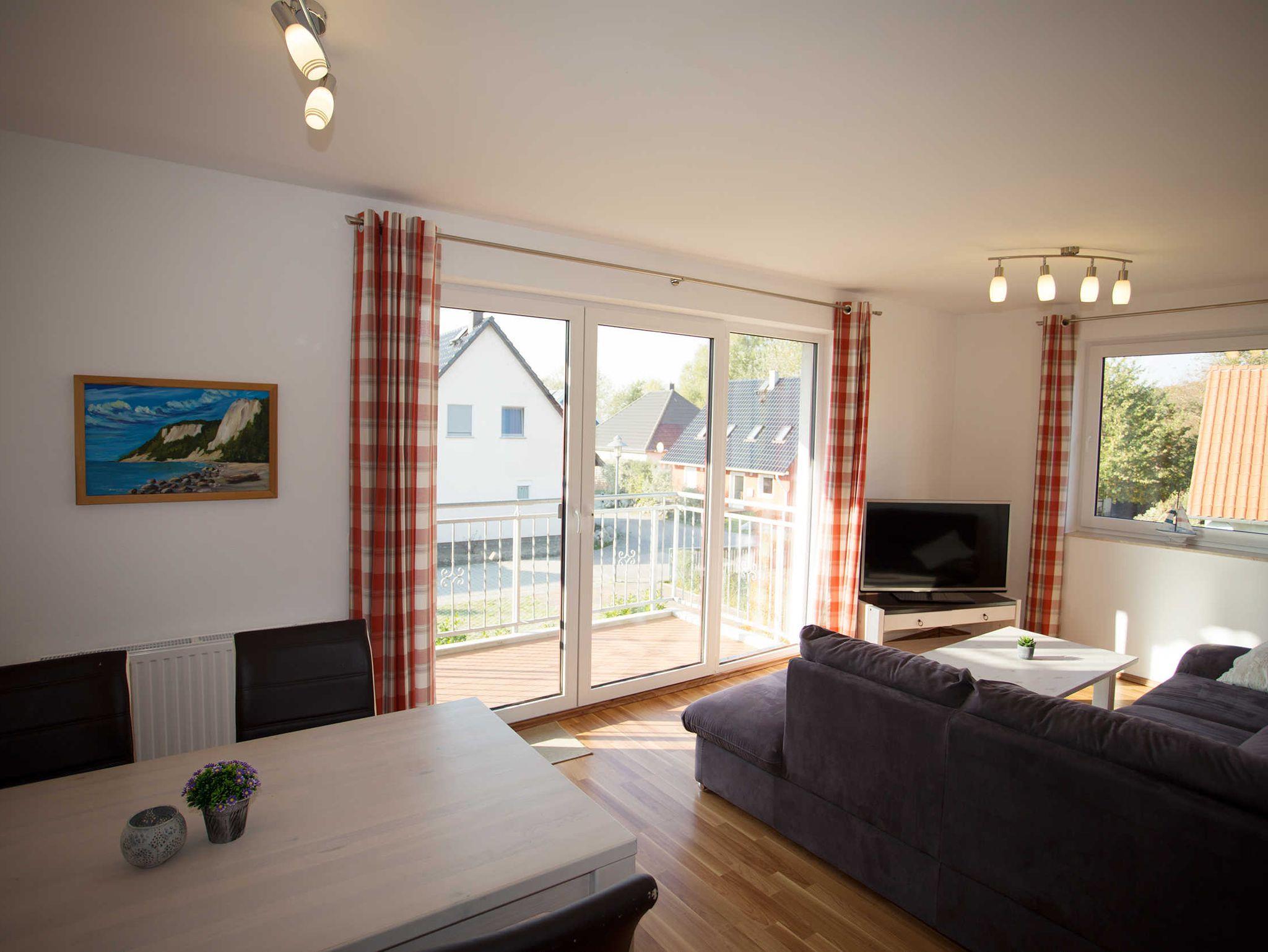 Die modern, hell und individuell ausgestattete 63 qm große 3-Raum-Ferienwohnung in Wiek befindet sich im 1. Obergeschoss in der Villa Wittow im Ort Wiek auf der Insel Rügen. Der Wohnraum ist geschmackvoll eingerichtet und verfügt über einen Flachbild-TV, einem Lowboard und Sideboard sowie einer ausziehbaren braunen Ledercouch und einem großen massiven Holzesstisch mit 6 Schwingstühlen aus weiß/braunem Kunstleder. Vom Wohnraum ist der Zugang zum Balkon gegeben.