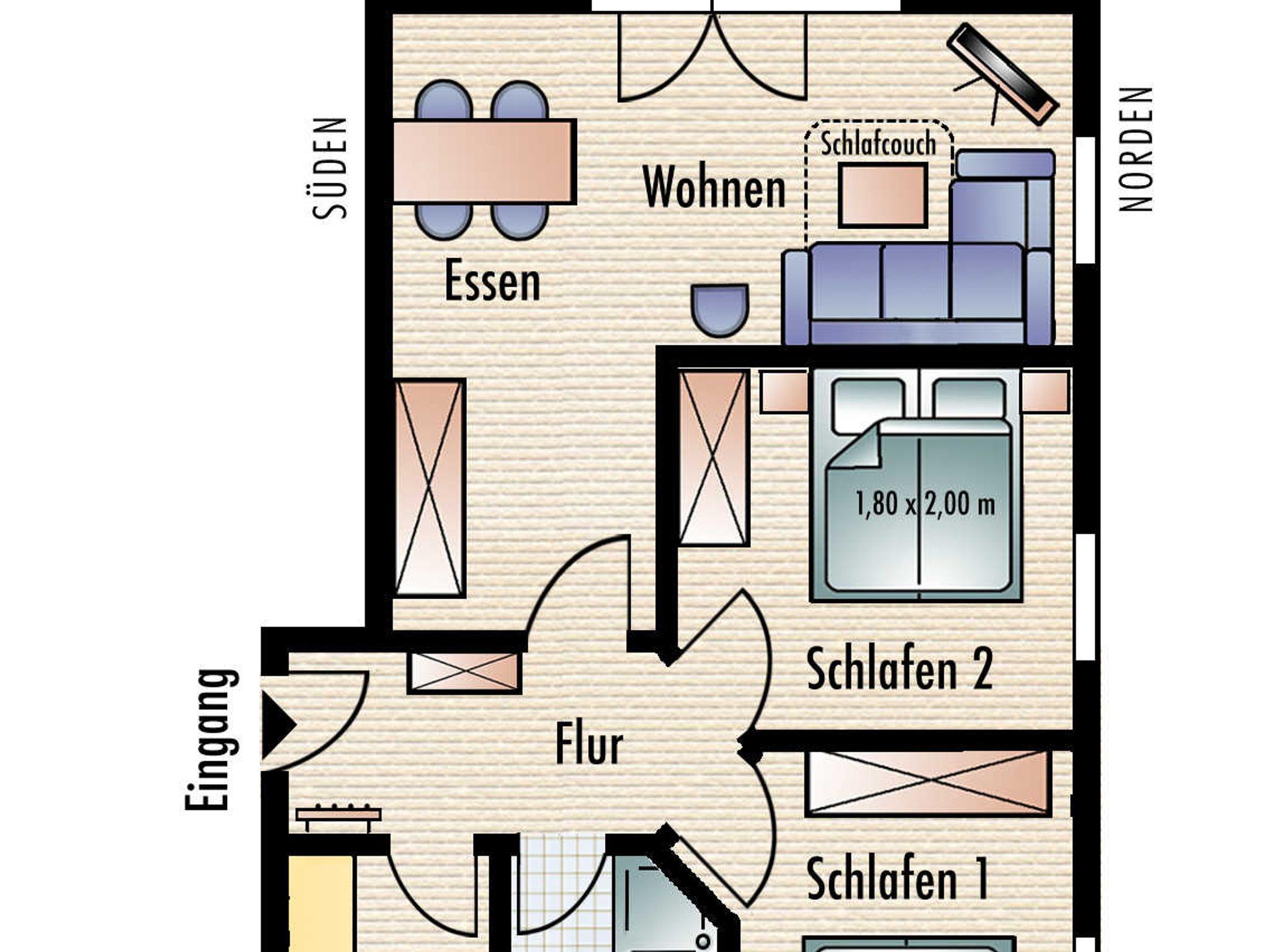 Die Ferienwohnung verfügt über zwei separate Schlafzimmer mit jeweils einem Doppelbett (2,00 x 1,80m, einzelnen 21cm dicken Komfort-Kaltschaum-Matratzen sowie sehr guten Lattenrosten) und jeweils einen großen Kleiderschrank.