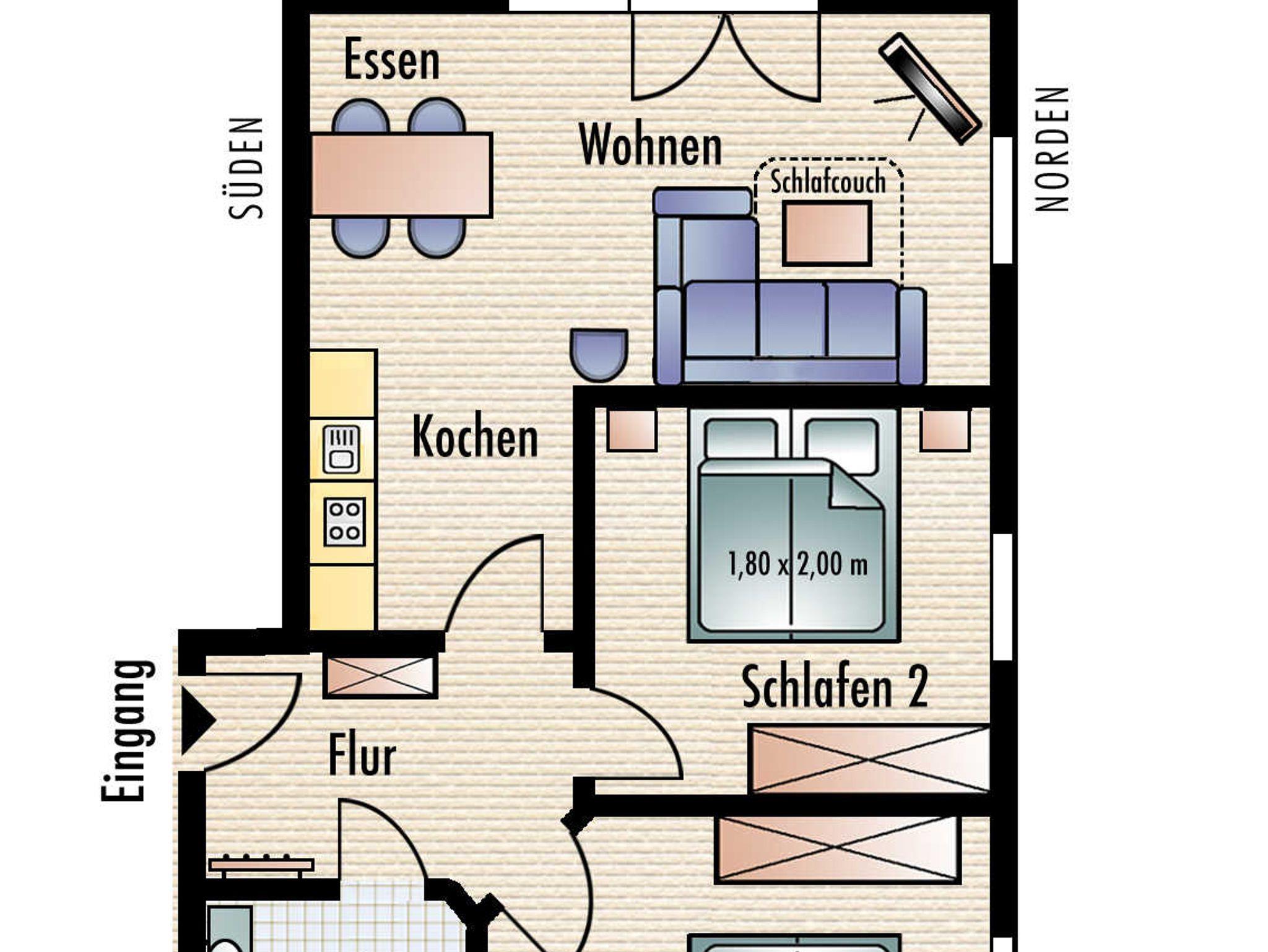Die Ferienwohnung verfügt über zwei separate Schlafzimmer mit jeweils einem Doppelbett (2,00 x 1,80m, einzelnen 21cm dicken Komfort-Kaltschaum-Matratzen sowie sehr guten Lattenrosten) und jeweils einen großen Kleiderschrank.