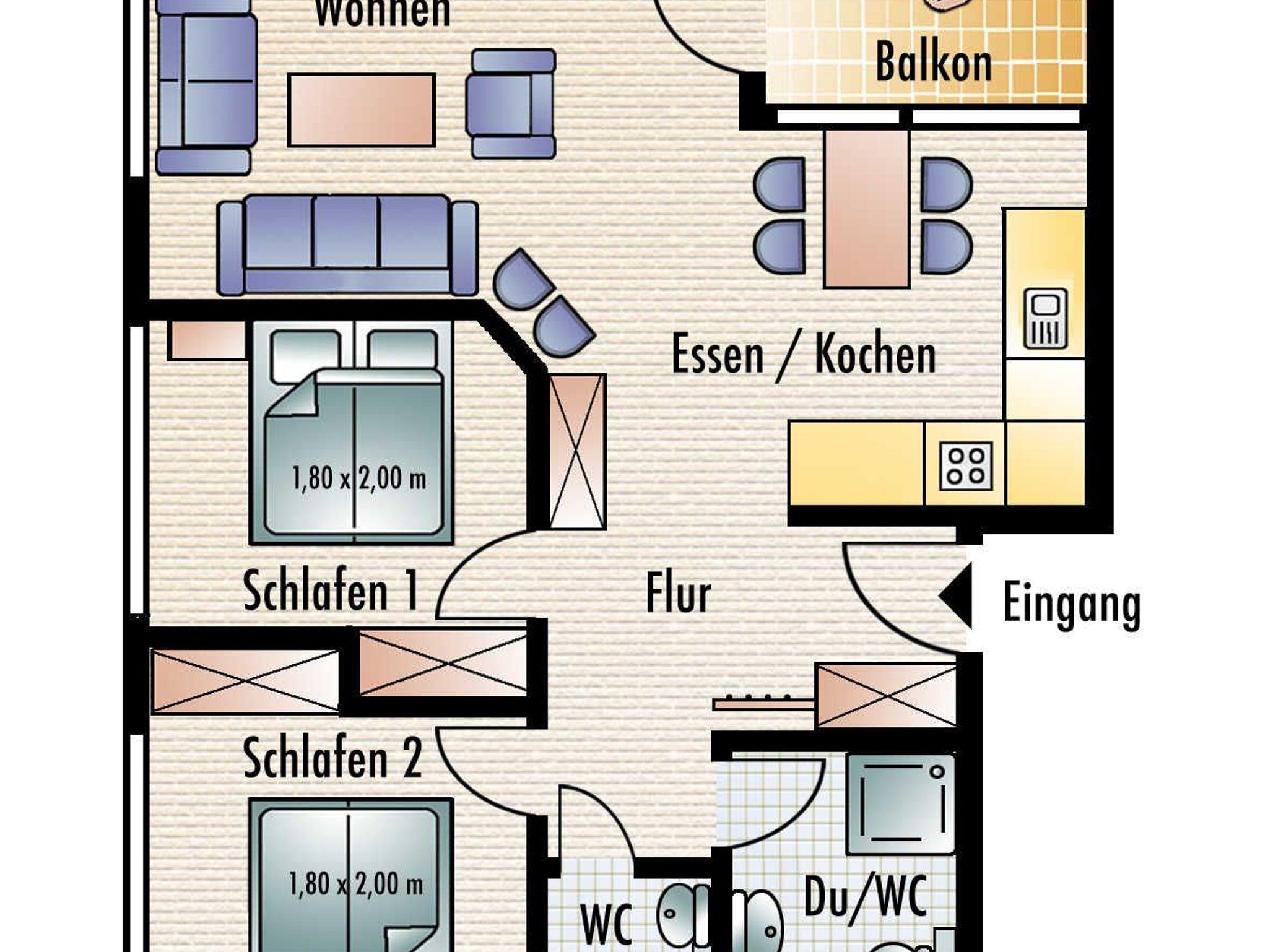 Der Wohnraum ist modern eingerichtet und verfügt über einen großen Flachbild-TV, einem Lowboard, einem Highboard und einer stilvollen Couch (3-er Sofa, 2-er Sofa und verstellbarem Sofasessel) sowie einem großen massiven Esstisch mit passenden Stühlen. Vom Wohnraum ist der Zugang zum großen Balkon gegeben. Die Ferienwohnung verfügt über zwei separate Schlafzimmer mit jeweils einem Doppelbett (2,00 x 1,80m, einzelnen 21cm dicken Komfort-Kaltschaum-Matratzen sowie sehr guten Lattenrosten) und jeweils einen großen Kleiderschrank.