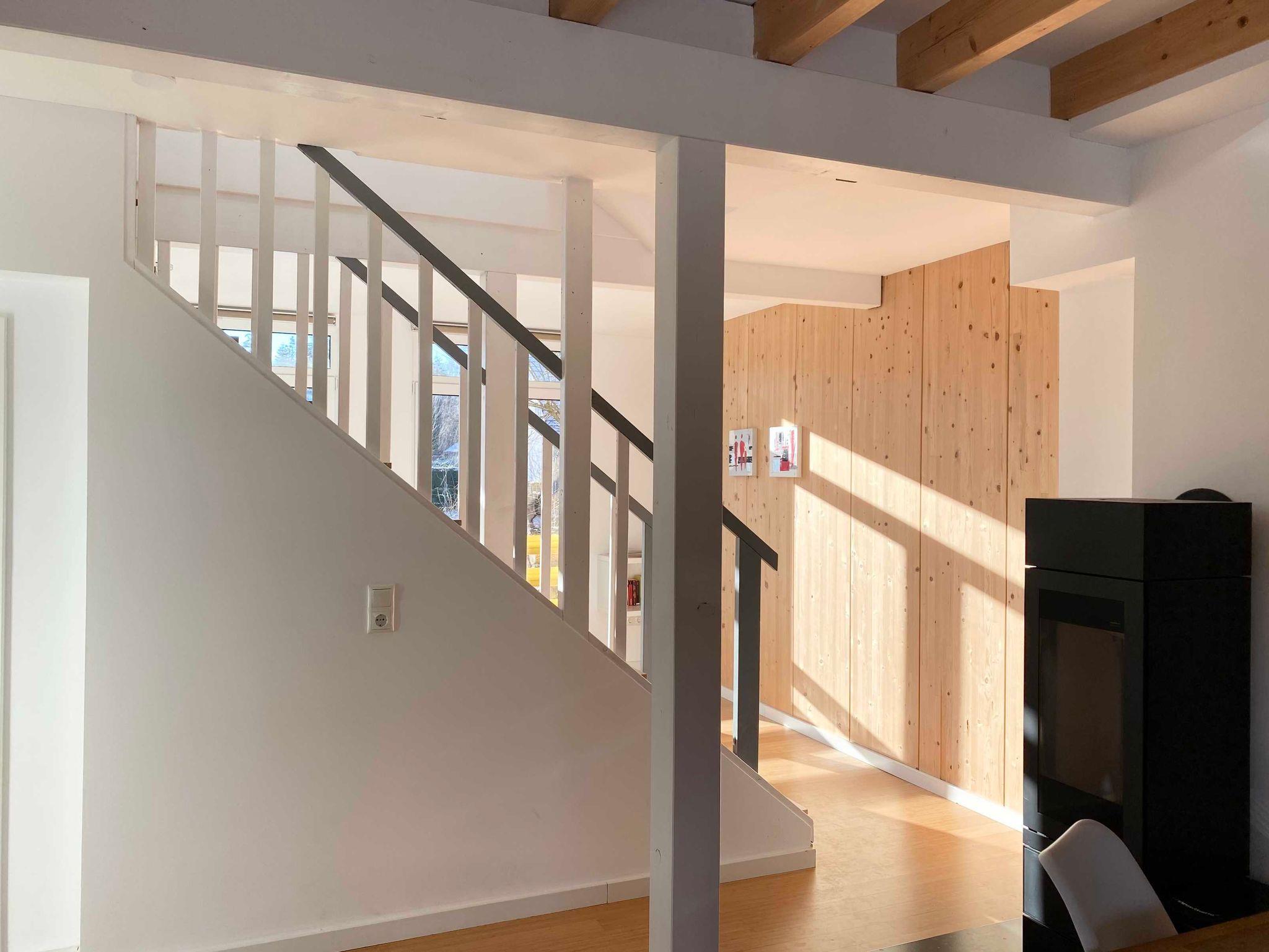 Das behagliche, offene Wohnzimmer mit bodentiefen Fenstern und direktem Zugang zum Garten, ein großer Smart-TV mit Blu-ray-Player, eine Bluetooth-Stereoanlage und der Essbereich mit Kaminofen und offener Küche sind Kommunikationsmittelpunkte des Hauses. Die Ausstattung der Küche bietet: eine Spülmaschine, Kaffeemaschine, Nespressomaschine, Milchaufschäumer, Mikrowelle, Wasserkocher, Toaster sowie umfangreiche Küchenutensilien. Im EG ist ein zusätzliches Bad mit Dusche, Waschmaschine und Trockner vorhanden. Zwei Schlafzimmer mit Doppelbett im Obergeschoss, jeweils mit Flachbild-TV und jeweils eigenem En-Suite-Bad und eine kleine Sauna, die von beiden Badezimmern aus zu betreten ist, bilden zusammen mit der Loggia ein weiteres Highlight.