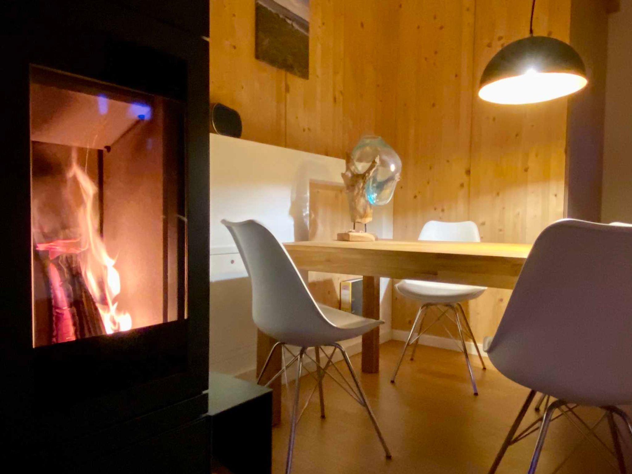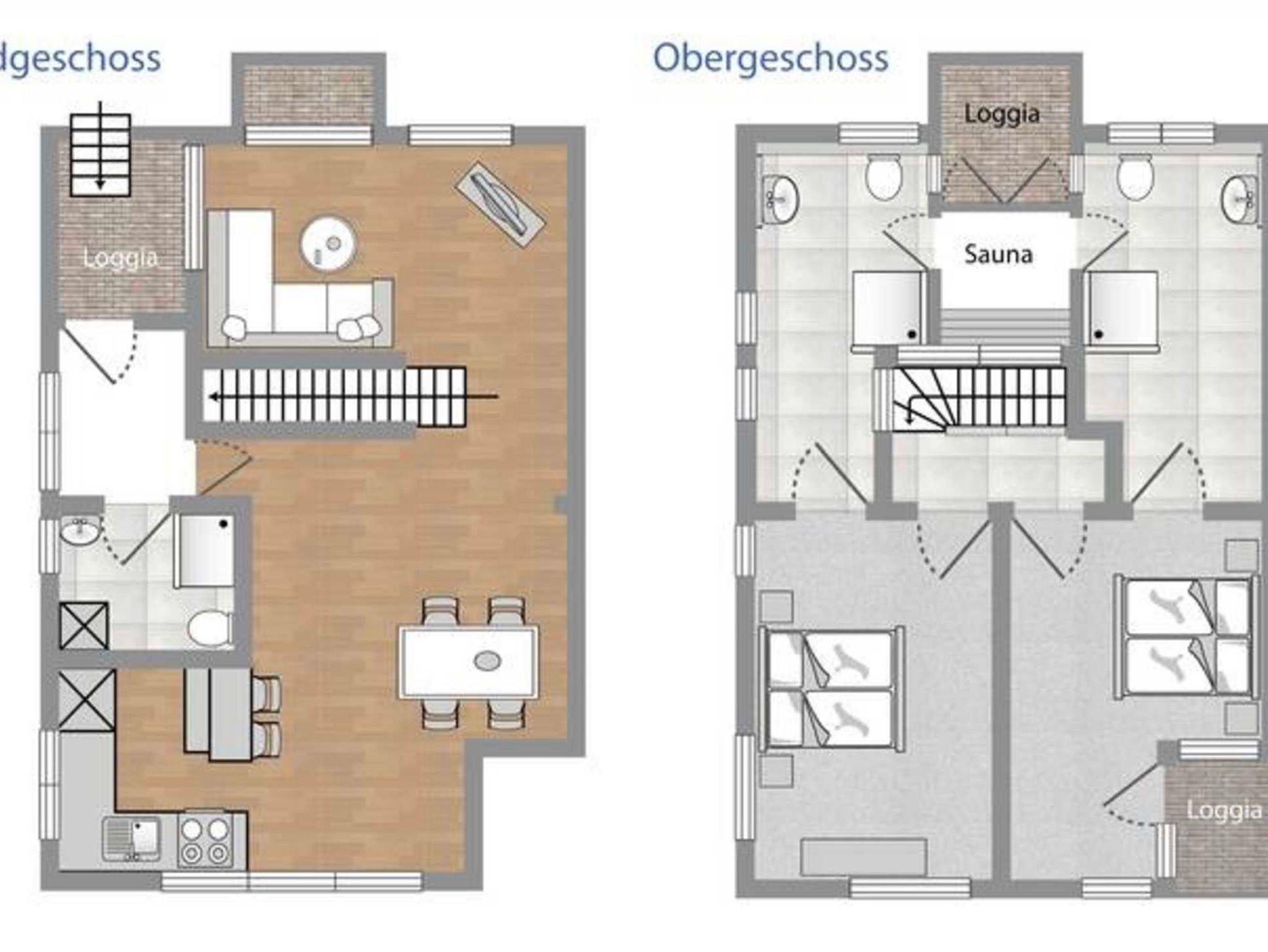 Behagliches, offenes Wohnzimmer mit bodentiefen Fenstern. Kommunikationsmittelpunkt ist der Essbereich mit Kaminofen und offener Küche. Ausstattung der Küche: Spülmaschine, Kaffee- und Nespressomaschine, Milchaufschäumer, Mikrowelle, Wasserkocher, Toaster sowie umfangreiche Küchenutensilien. Im EG befindet sich ein zusätzliches Bad mit Dusche und Waschmaschine, sowie Trockner. 2 Schlafzimmer mit Doppelbett, Flachbild-TV und jeweils eigenem En-Suite-Bad. Eine kleine Sauna, die von beiden Badezimmern aus zu betreten ist, bildet zusammen mit der Loggia ein weiteres Highlight.