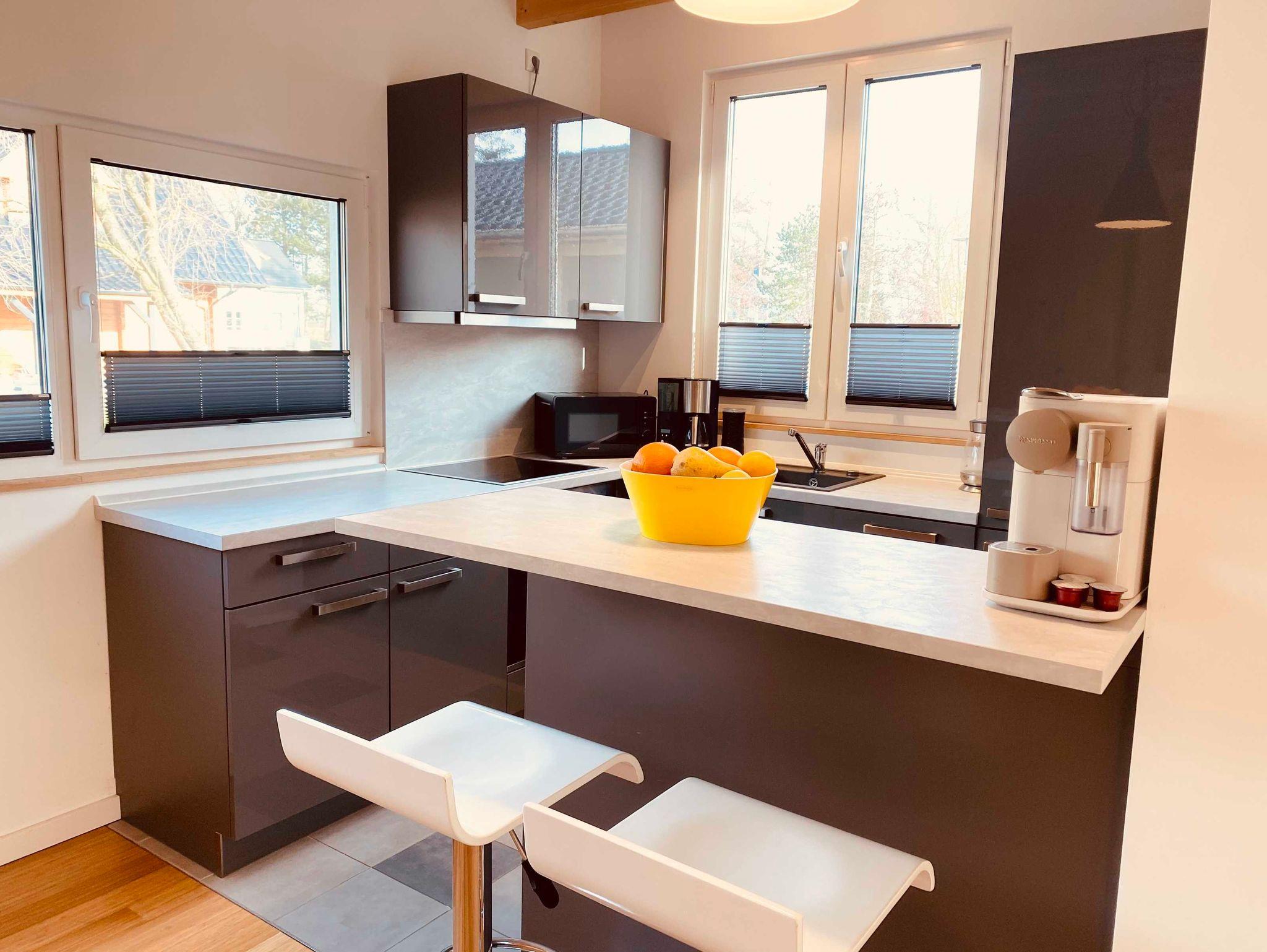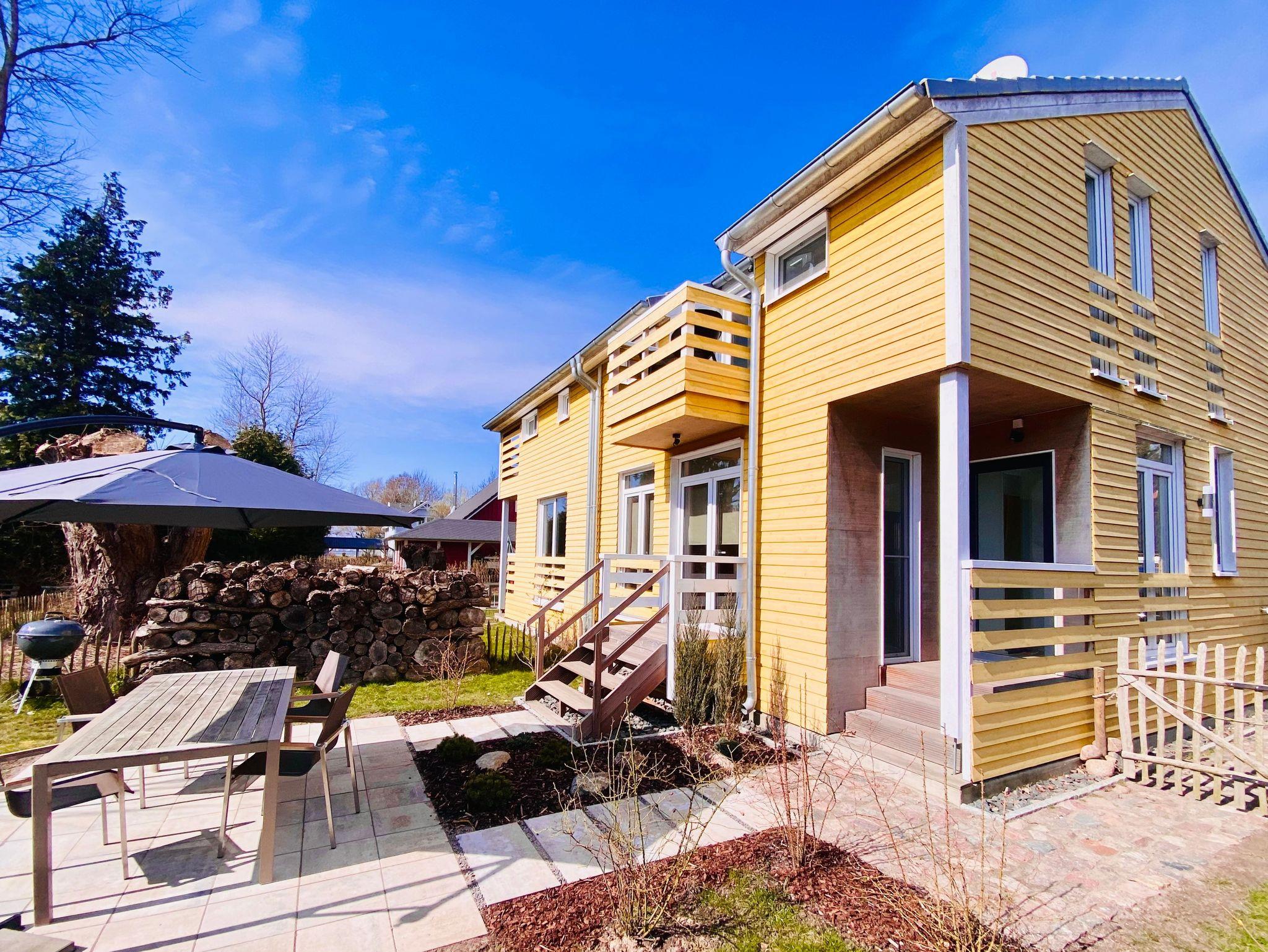 Erwärmung über Fußbodenheizung. Bluetooth Stereo-Anlage, Wlan, 2 PKW-Stellplätze und eine Waschmaschine zur kostenfreien Benutzung. Über die Balkone, Loggien und den Garten seitlicher Blick auf die Ostsee (Wieker Bodden).