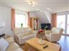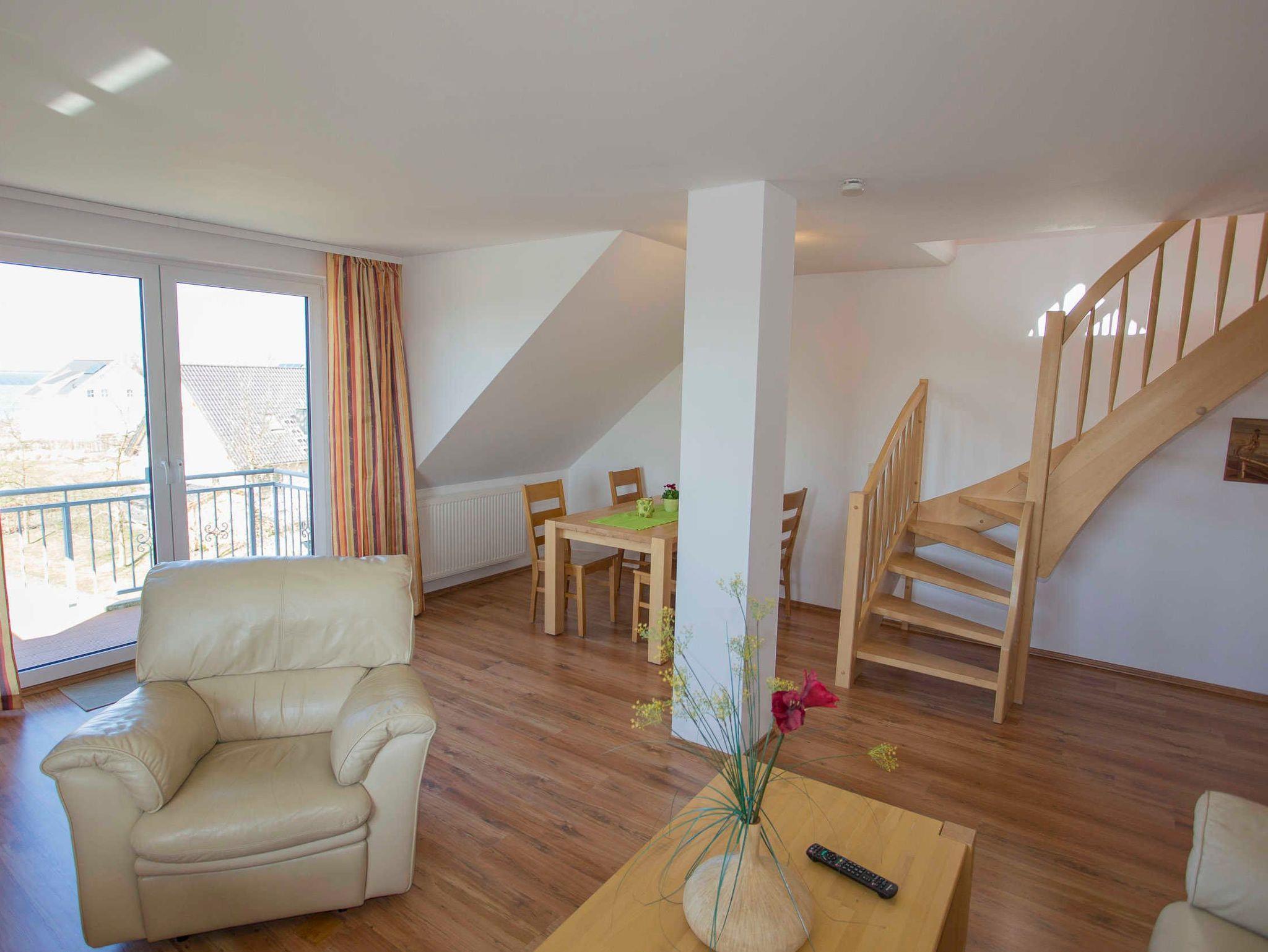 Der Wohnraum ist modern eingerichtet und verfügt über einen großen Flachbild-TV, einem Lowboard und Highboard sowie einer hellen Kunstledercouch (3-er Sofa, 2-er Sofa und verstellbarem Sofasessel) und einem großen massiven Esstisch mit passenden Holzstühlen. Vom Wohnraum ist der Zugang zum Balkon gegeben, von wo Sie aus einen tollen Blick auf den Wieker Bodden haben.