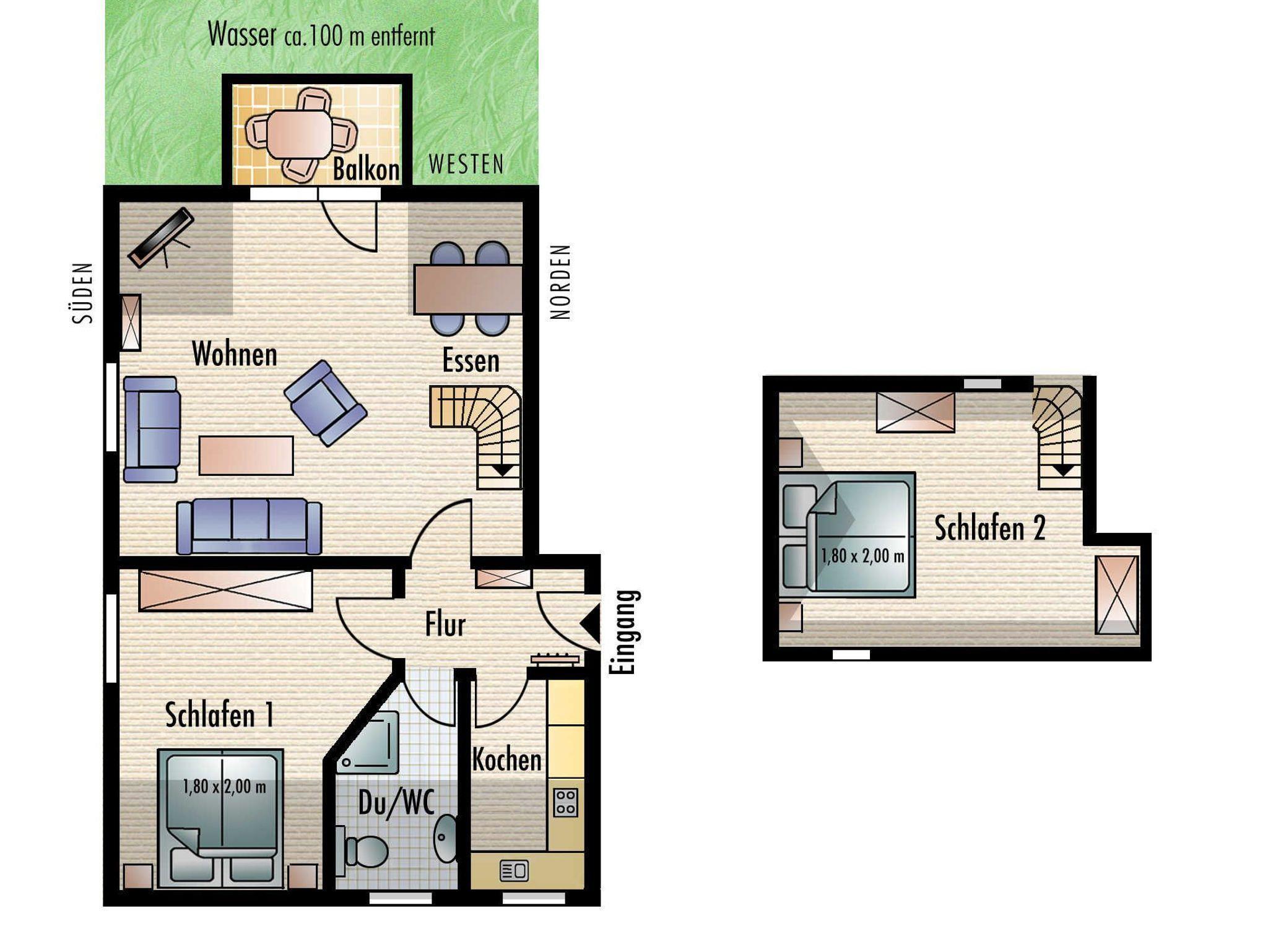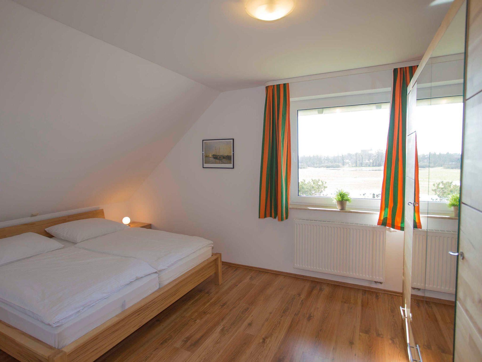 Die Ferienwohnung verfügt über zwei separate Schlafzimmer mit jeweils einem Doppelbett (2,00 x 1,80m, einzelnen 21cm dicken Komfort-Kaltschaum-Matratzen sowie sehr guten Lattenrosten). Ein Schlafzimmer befindet sich im Dachausbau und ist über eine offene Treppe vom Wohnzimmer aus zu erreichen. Es ist mit einem Sideboard ausgestattet. Im zweiten Schlafzimmer befindet sich ein großer Kleiderschrank.