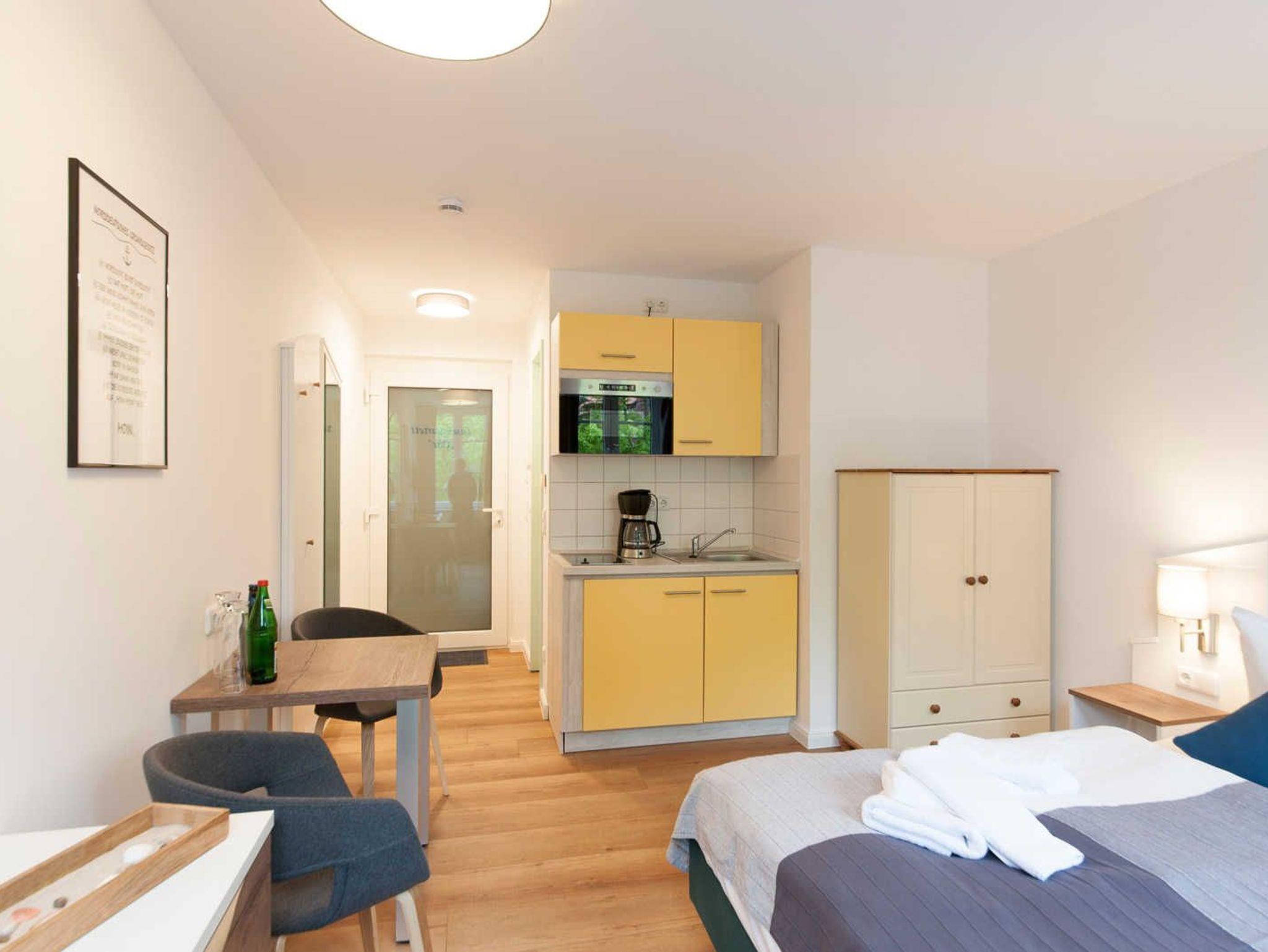 Die 1-Raum Appartements Vilm, Öhe und Ummanz befinden sich in dem Fischerdorf Wiek und sind nur 100m vom Hafen und ca. 5 Gehminuten von der AOK-Kurklinik entfernt. Sie sind zwischen 20 m² und 23 m² groß, im 1. Obergeschoss und jede hat einen eigenen PKW-Stellplatz.