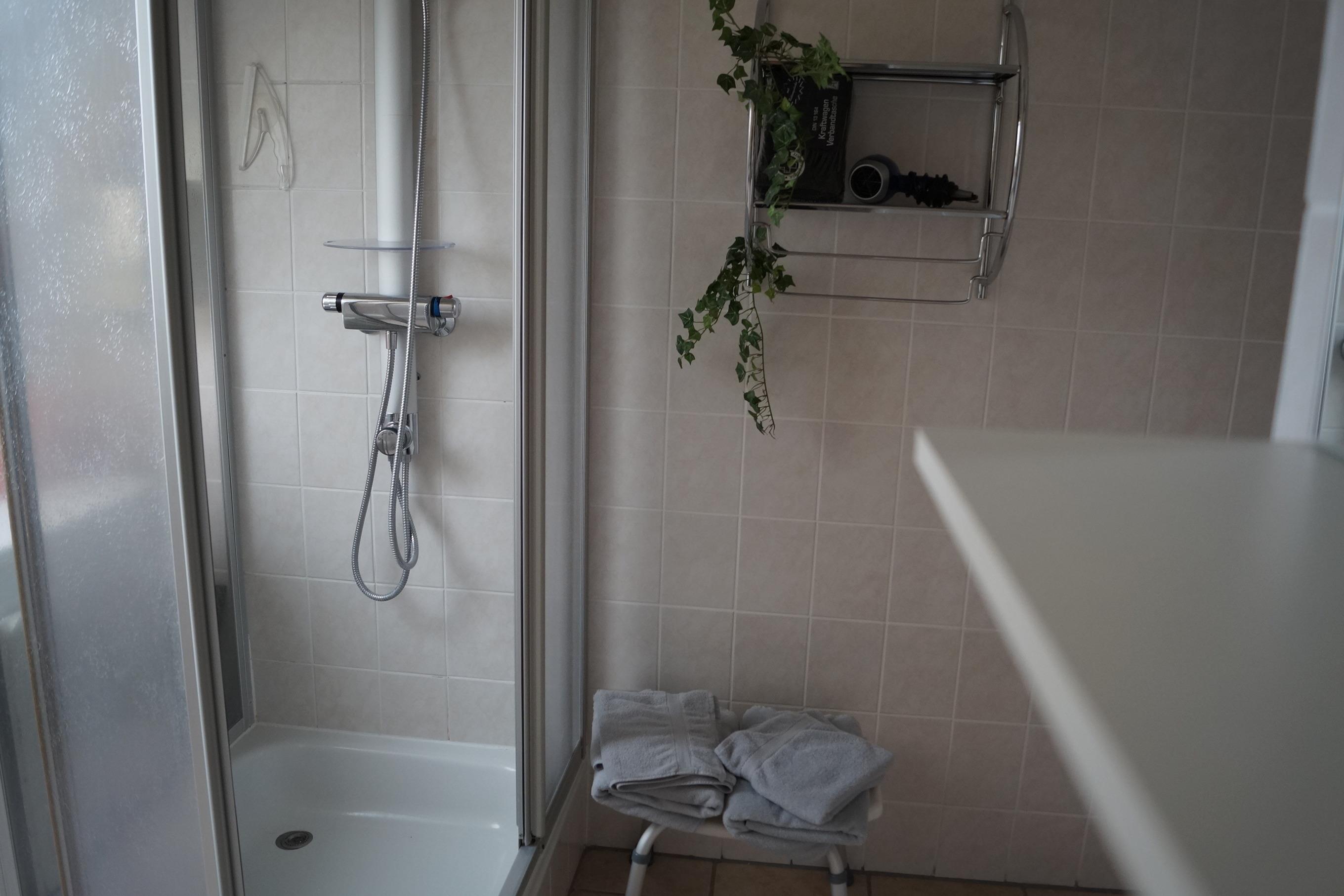 Das moderne, großzügige Bad ist mit Dusche, WC und Waschmaschine ausgestattet.