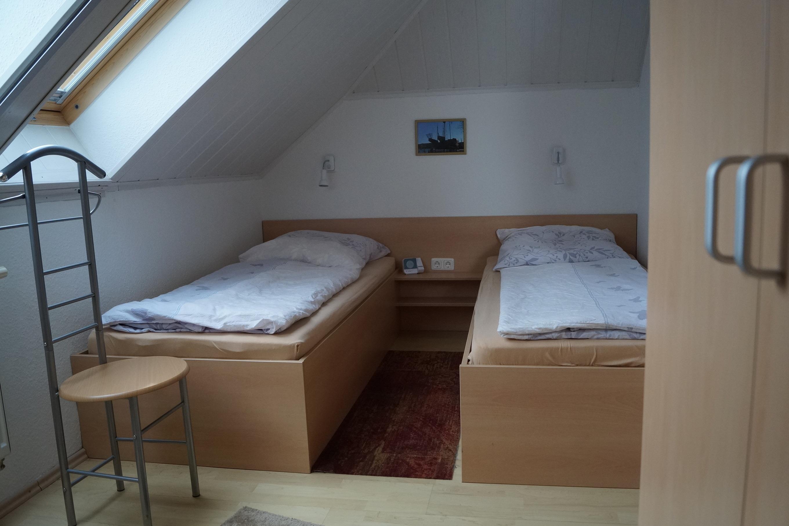 Im Schlafzimmer stehen zwei bequeme Einzelbetten mit Nachttisch und Leselampe; sowie ein Kleiderschrank und Sideboard.