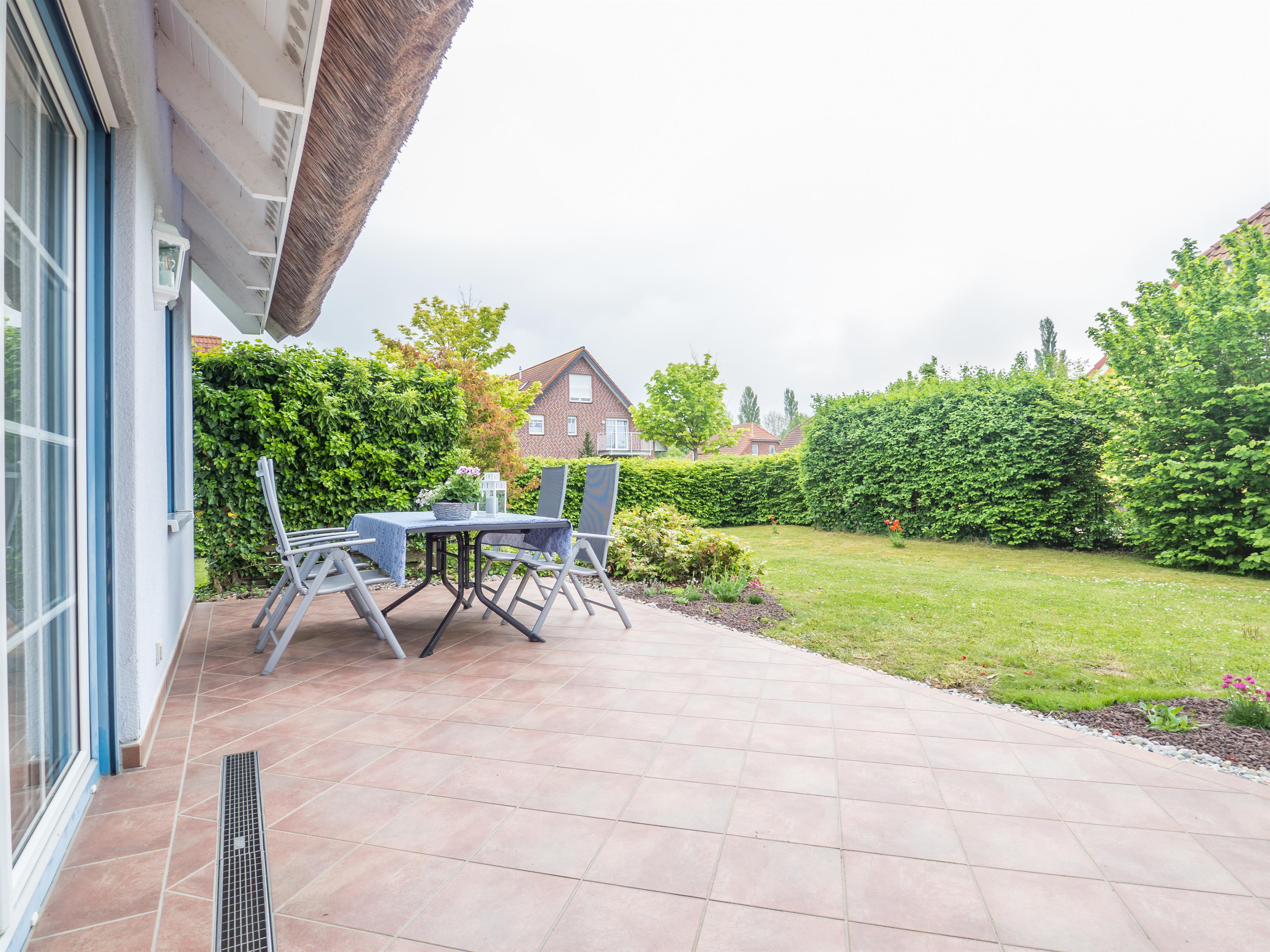 Über die große Terrassentür im Wohnzimmer gelangen Sie zur Süd-Terrasse mit eingezäuntem Gartenanteil, wo Hunde nach Herzenslust toben können. Hier finden Sie unter anderem einen großen Tisch mit Sitzgelegenheiten für bis zu 4 Personen, 1 Sonnenliege, einen großen Sonnenschirm sowie einen Holzkohlegrill. Der Tag kann bei einem Frühstück in der Sonne perfekt beginnen oder ein gemütlicher Grillabend den Tag ausklingen lassen.