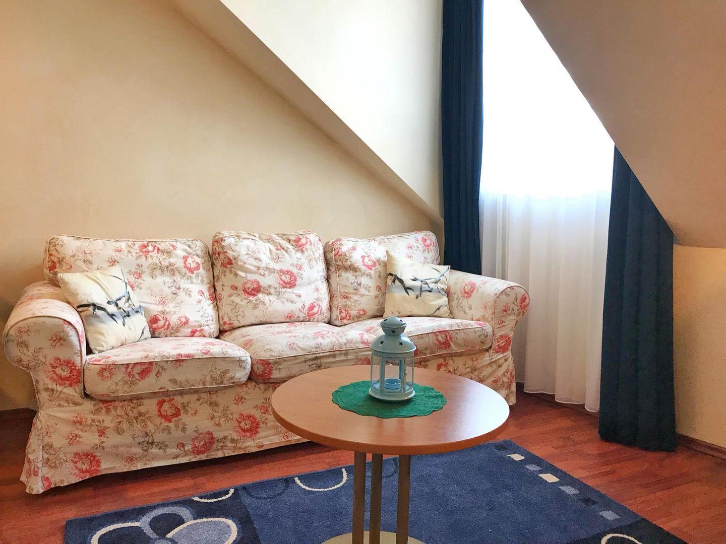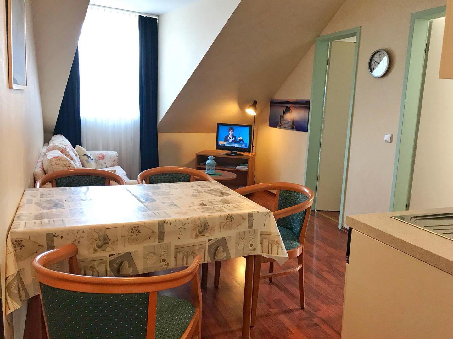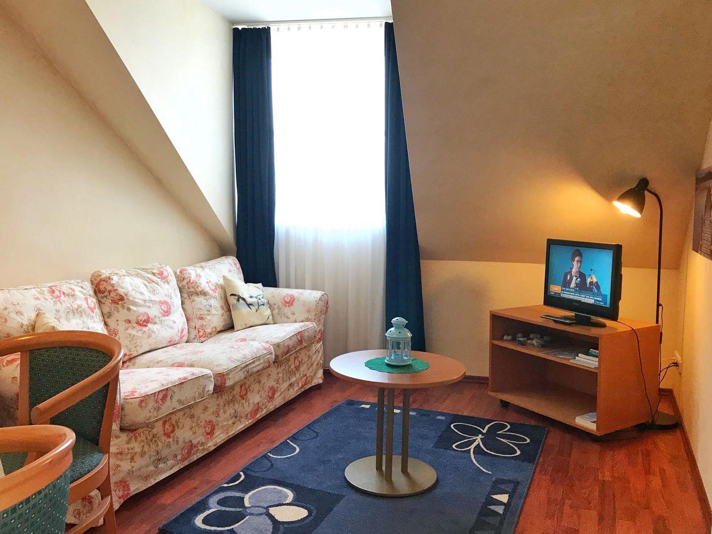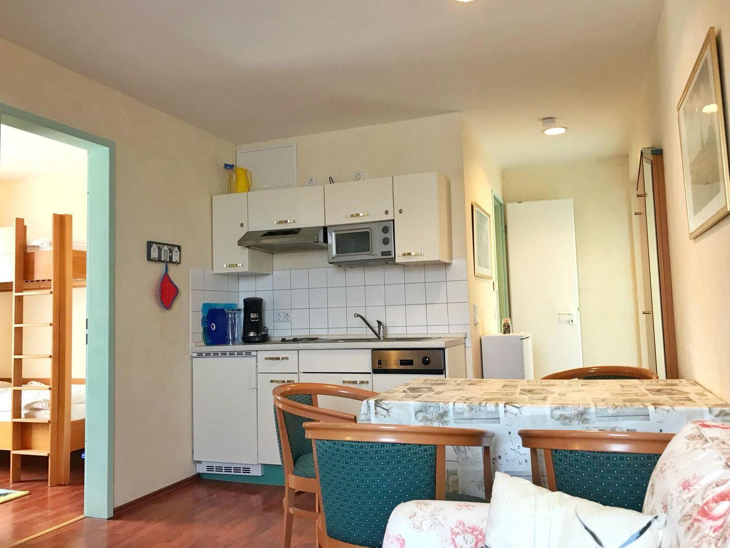 Die gemütliche, kleine 3-Raum-Wohnung befindet sich im Dachgeschoss des gepflegten Appartementhauses Yachhafenresidenz. Sie verfügt über Schlafmöglichkeiten für bis zu 4 Personen. Die Wohnung ist aufgeteilt in ein Wohnzimmer mit Flachbild-TV, ein Schlafzimmer mit Doppelbett sowie ein weiteres Schlafzimmer mit Etagenbett. Das Bad verfügt über Toilette, Dusche und Fön. Im Wohnbereich ist eine kleine Küche integriert mit 2-Platten-Herd, Mikrowelle und einer Senseo Kaffeemaschine. Aus dem Wohnzimmer und einem Schlafzimmer haben Sie Blick auf´s Wasser. Zum Appartement gehört der Pkw-Stellplatz Nr. 17 direkt am Haus. Der Garten am Haus kann gemeinschaftlich genutzt werden. Außerdem gibt es zur gemeinschaftlichen Nutzung eine Waschmaschine und einen Trockner als Münzautomaten sowie Fahrradunterstellmöglichkeiten.