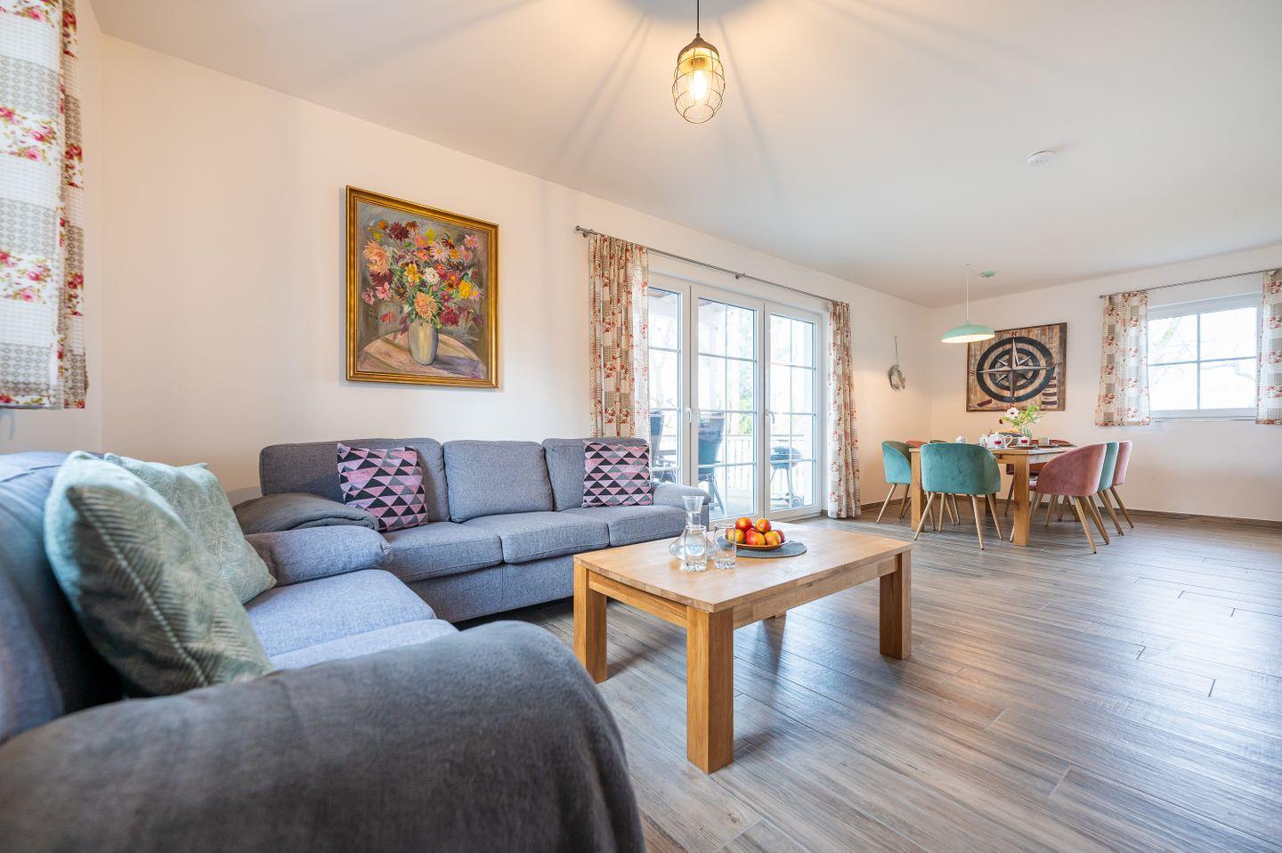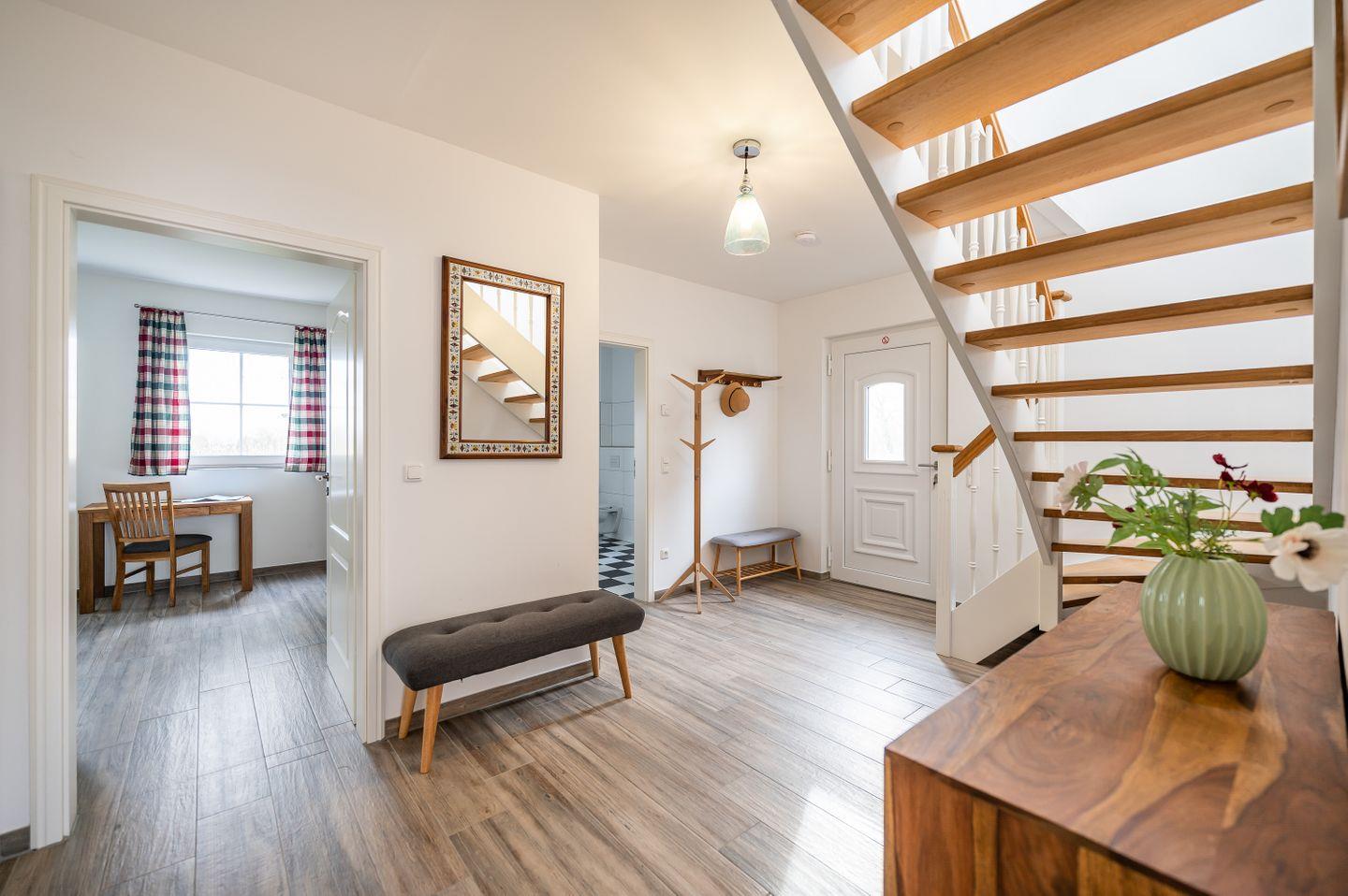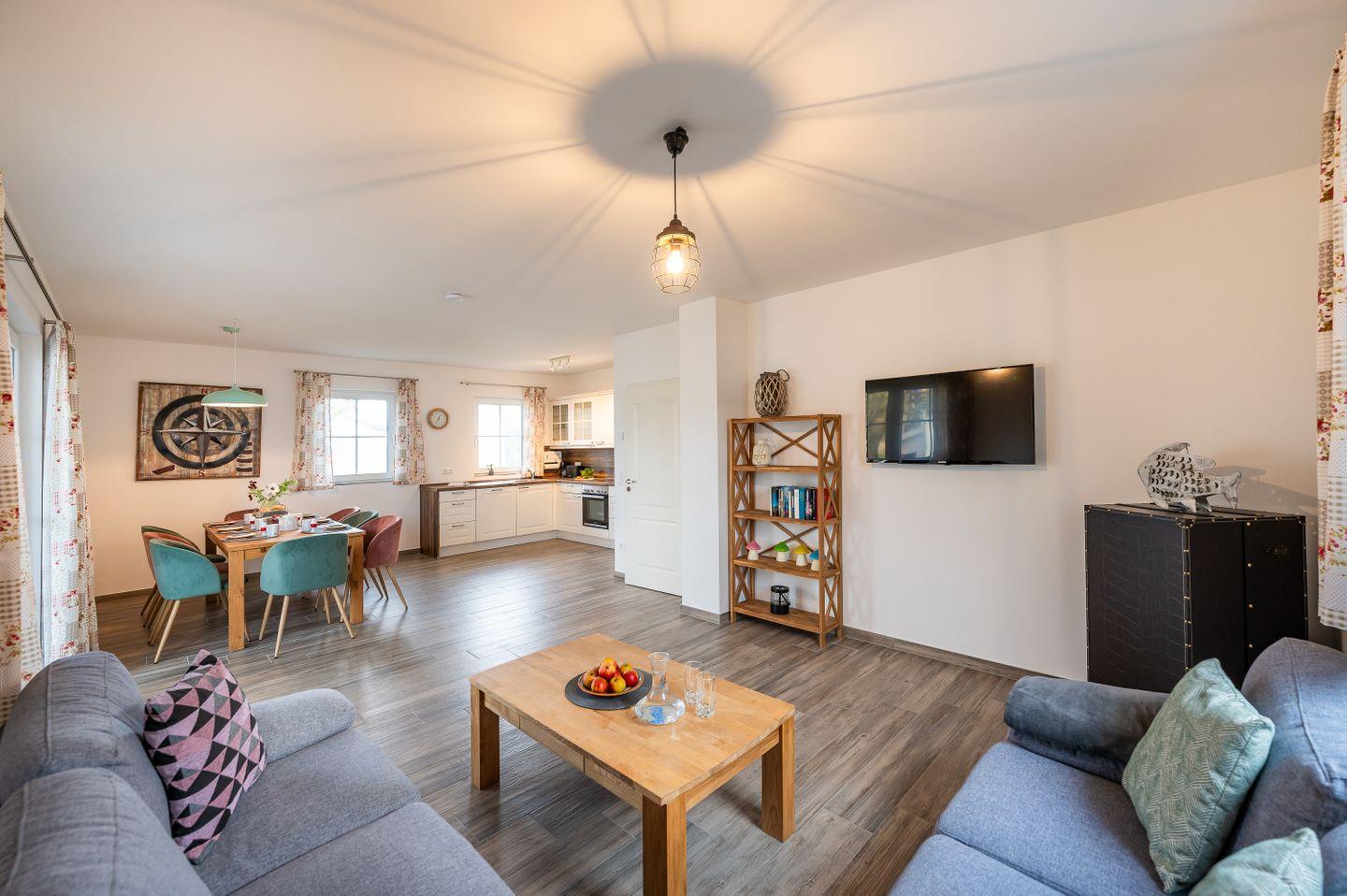 Das skandinavisch inspirierte Ferienhaus “Marianne & Heinrich” bietet mit 135 m² genug Platz, um mit Familie und Freunden eine besondere Auszeit zu verbringen. Drei großzügige Schlafzimmer, davon zwei mit eigenem Lounge-Bereich, sowie zwei stilvoll gestaltete Bäder sorgen für höchsten Komfort und Rückzugsmöglichkeiten für alle Gäste. Die offene und komplett ausgestattete Küche geht nahtlos in den gemütlichen Wohnbereich über und lädt zu gemeinsamen Kochabenden ein. Naturliebhaber werden den großen Garten des Eckgrundstücks und den weiten Blick über die Felder zu schätzen wissen. Auf der sonnigen, überdachten Terrasse und dem zusätzlichen Balkon genießen Sie die frische Luft und erholsame Stunden im Freien. Ein PKW-Stellplatz steht direkt am Haus zur Verfügung, und auf Anfrage ist auch Ihr vierbeiniger Begleiter willkommen.