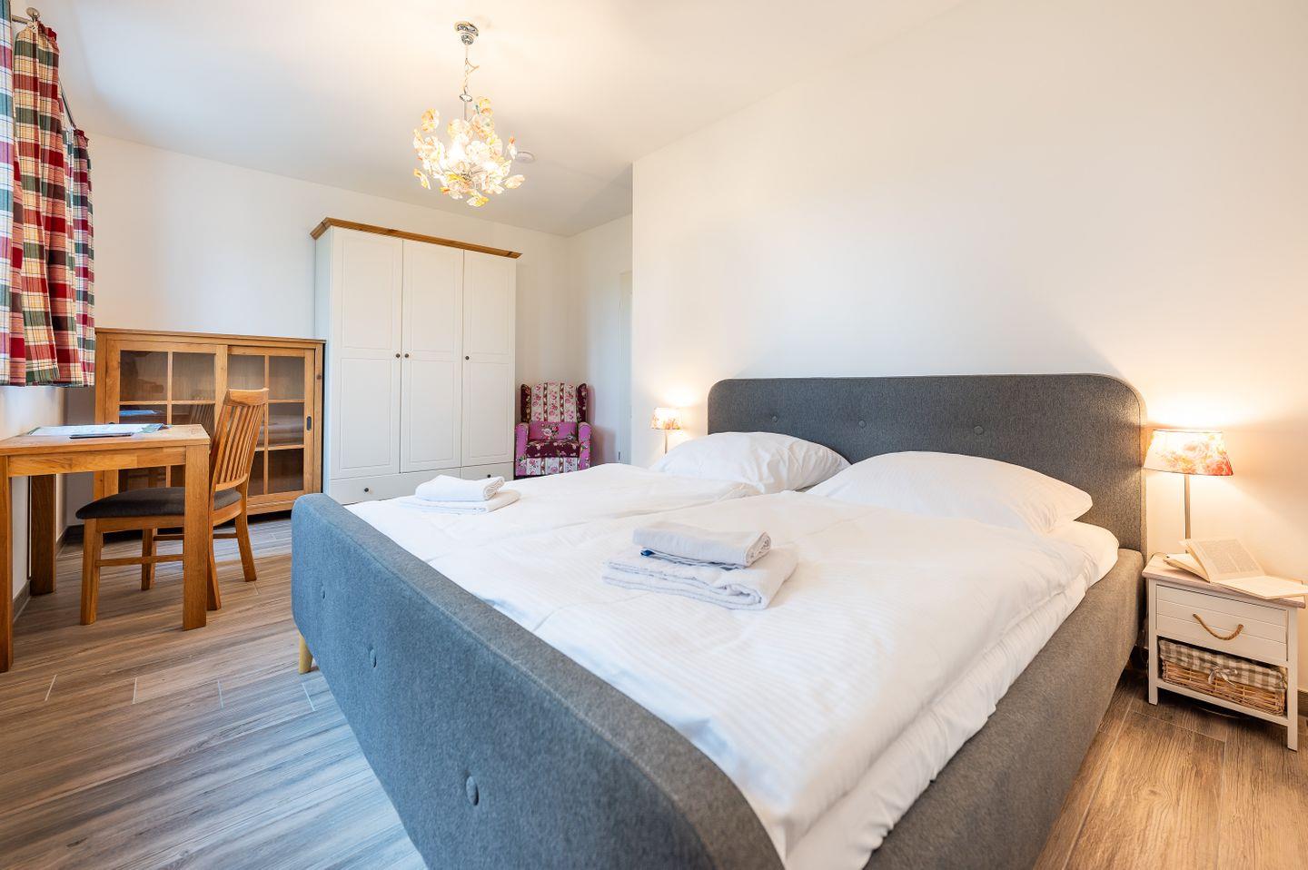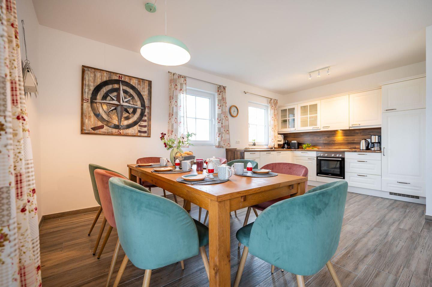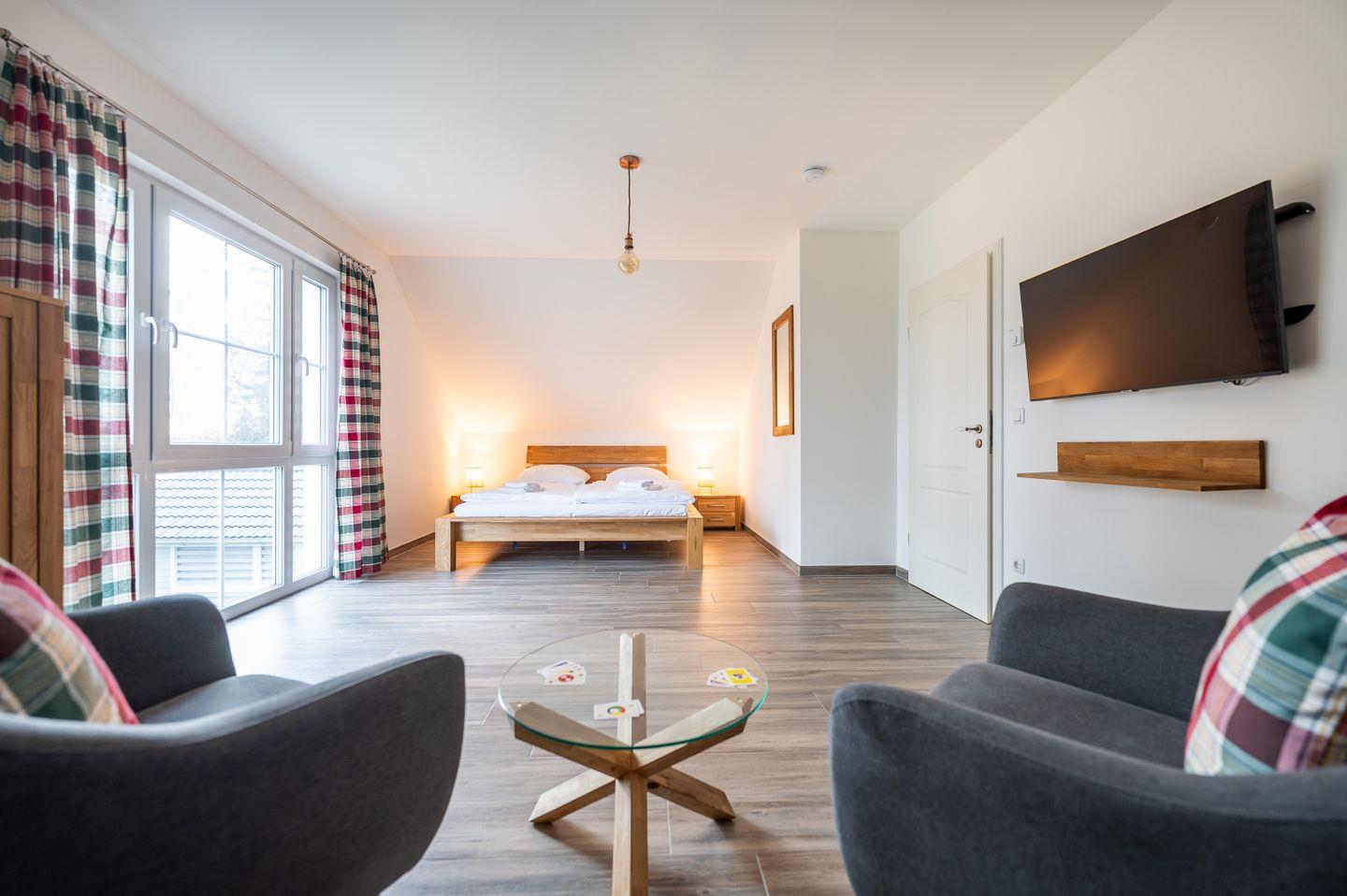 Das skandinavisch inspirierte Ferienhaus “Marianne & Heinrich” bietet mit 135 m² genug Platz, um mit Familie und Freunden eine besondere Auszeit zu verbringen. Drei großzügige Schlafzimmer, davon zwei mit eigenem Lounge-Bereich, sowie zwei stilvoll gestaltete Bäder sorgen für höchsten Komfort und Rückzugsmöglichkeiten für alle Gäste. Die offene und komplett ausgestattete Küche geht nahtlos in den gemütlichen Wohnbereich über und lädt zu gemeinsamen Kochabenden ein. Naturliebhaber werden den großen Garten des Eckgrundstücks und den weiten Blick über die Felder zu schätzen wissen. Auf der sonnigen, überdachten Terrasse und dem zusätzlichen Balkon genießen Sie die frische Luft und erholsame Stunden im Freien. Ein PKW-Stellplatz steht direkt am Haus zur Verfügung, und auf Anfrage ist auch Ihr vierbeiniger Begleiter willkommen.