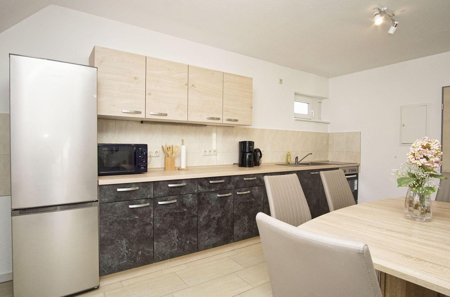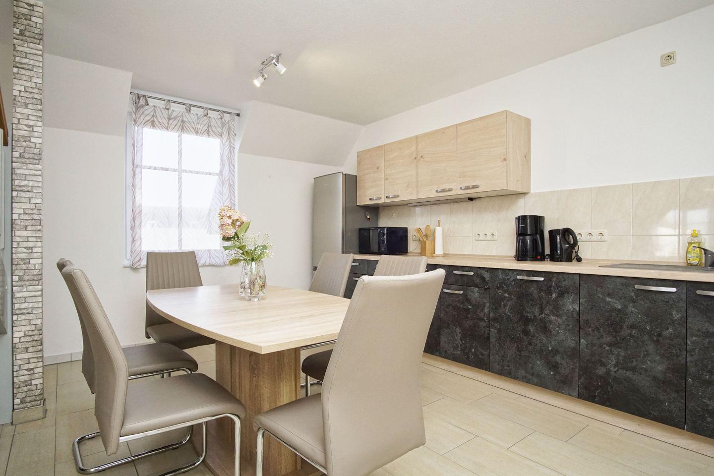 KÜCHE // offene Küche, 4-Platten Ceranfeld, Spülmaschine, Kühlschrank mit Gefrierfach, Backofen, Toaster, Wasserkocher, Kaffeemaschine, reichlich Besteck, Geschirr, großem Esstisch und Küchenutensilien ++