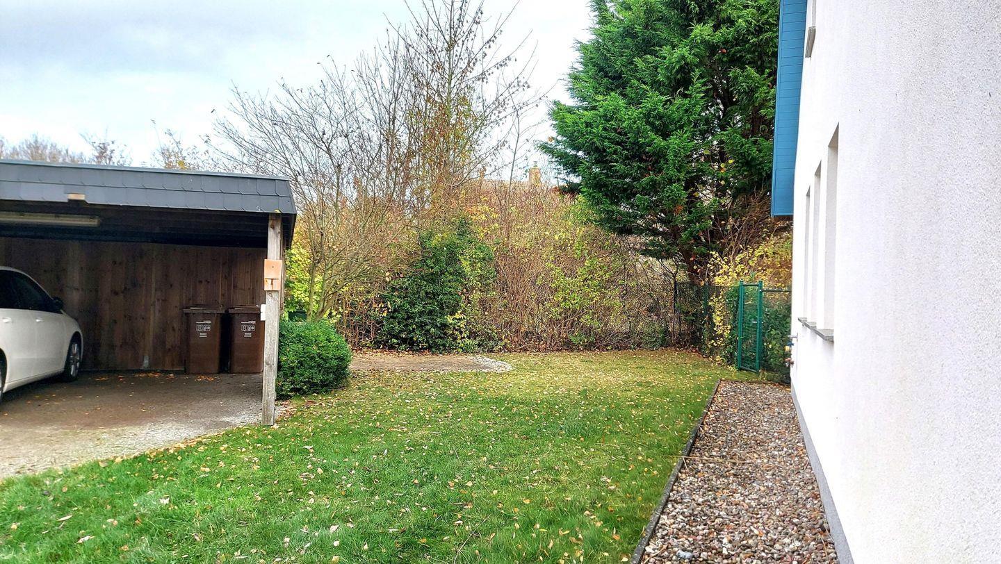 Verfügbar ist eine Gartenterrasse, ein Carport sowie eine gesicherte Unterstellmöglichkeit für Ihre Räder.