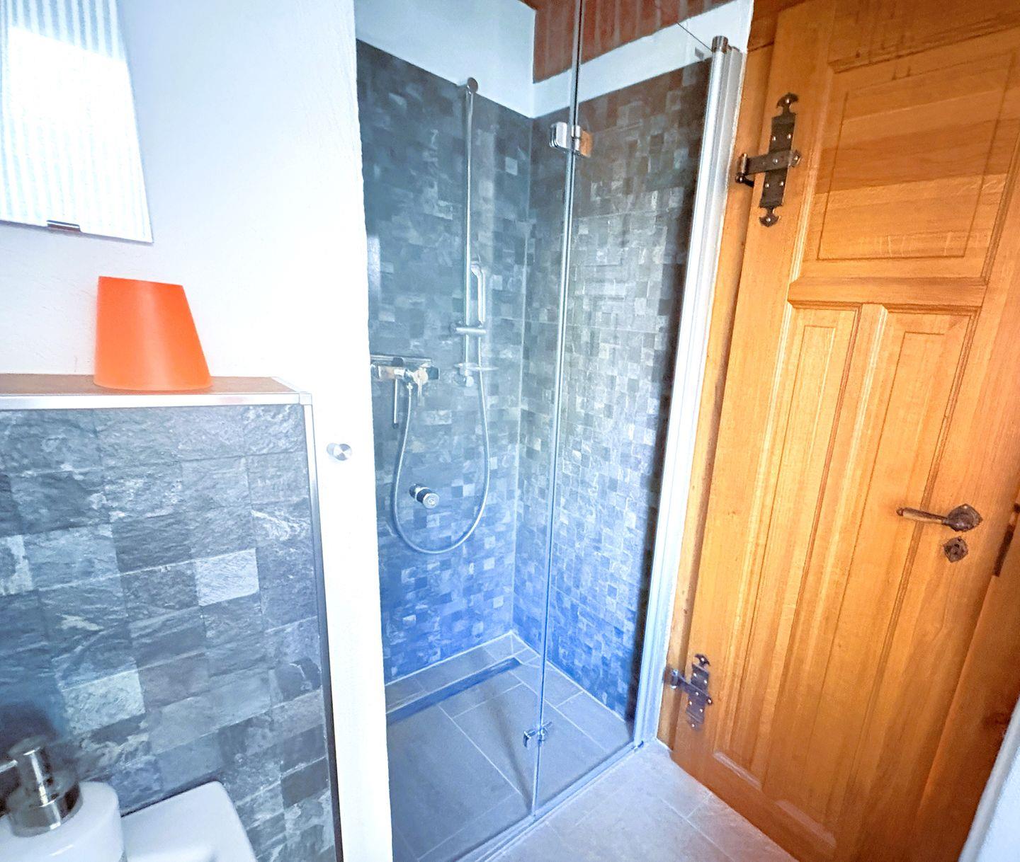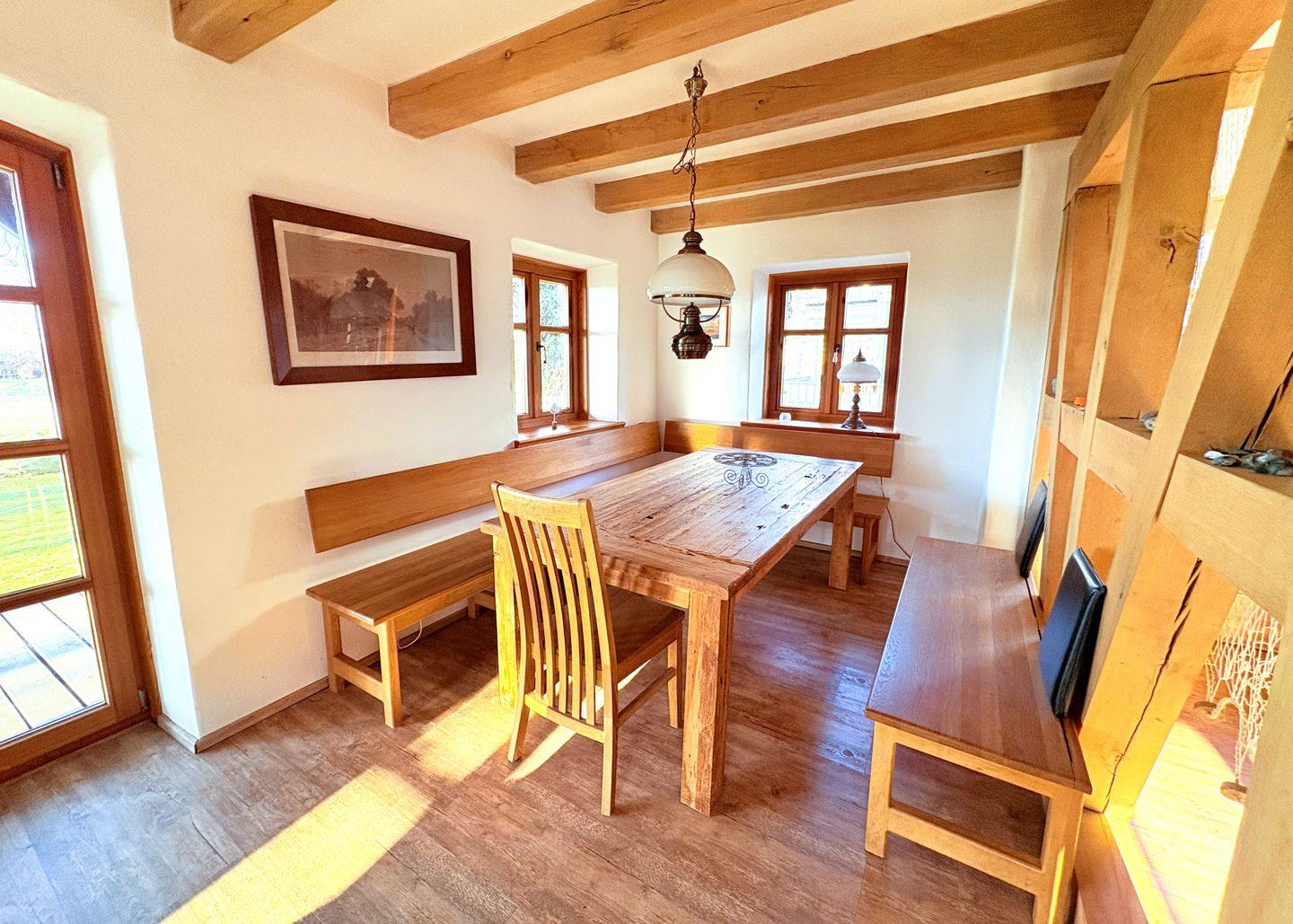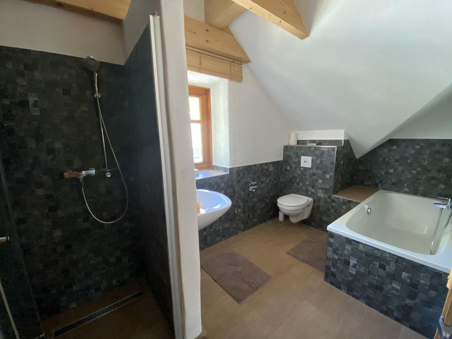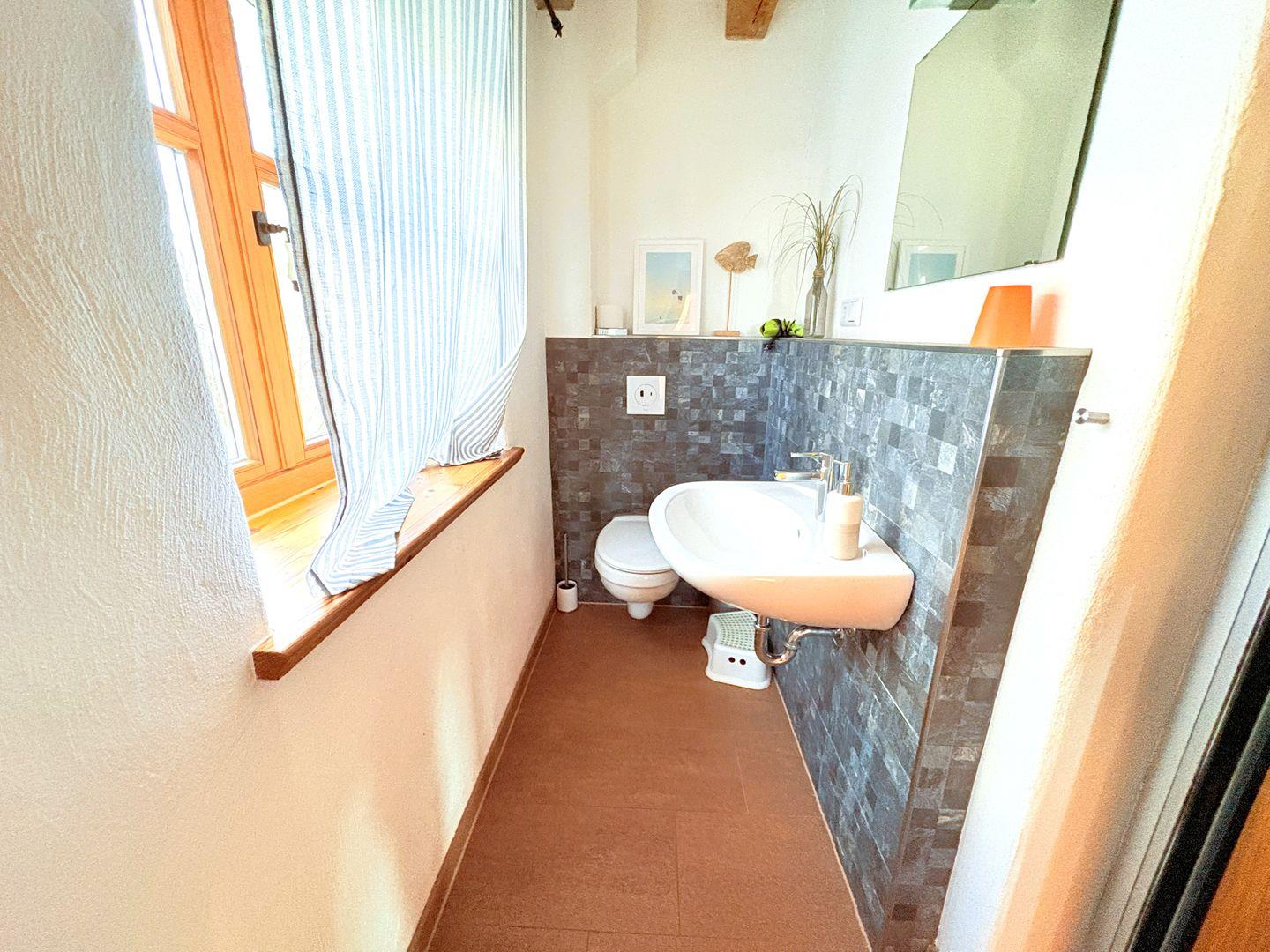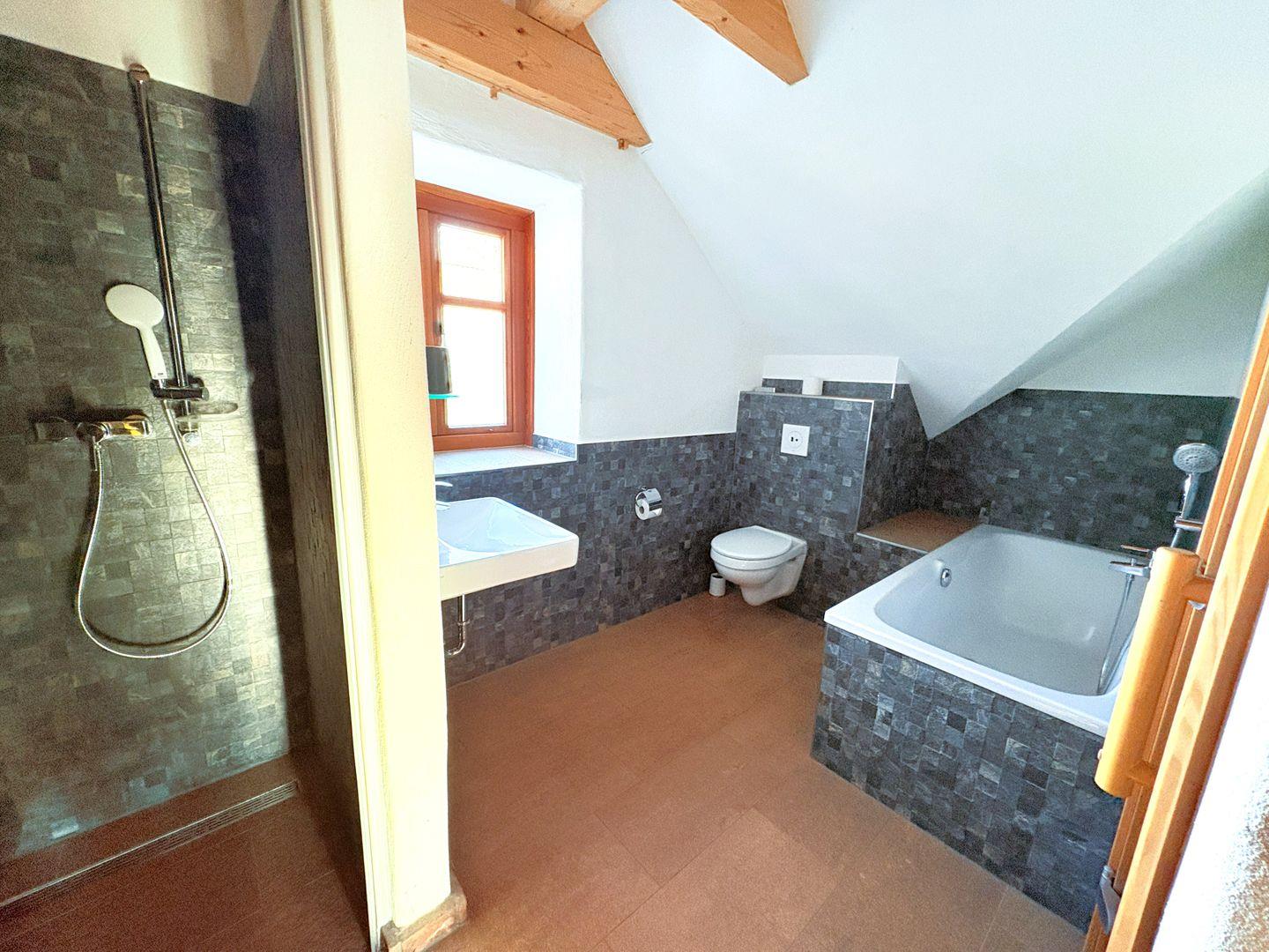 Im Erdgeschoss finden Sie eine moderne, voll ausgestattete Landhausküche, die keine Wünsche offenlässt. Das Esszimmer mit seiner gemütlichen Eichenholzeckbank ist der perfekte Ort für gesellige Mahlzeiten. Der offene Wohnbereich mit Ledercouch und Stressless-Sessel, viel naturbelassenem Eichenholz und Natursteinmauern schafft eine warme und einladende Atmosphäre. Die Küche ist vollständig ausgestattet. Ein Badezimmer mit WC und Dusche sowie ein Hauswirtschaftsraum mit Waschmaschine und Trockner runden das Angebot im Erdgeschoss ab. Von der Terrasse aus haben Sie Zugang zum Garten mit einer schönen Rasenfläche.