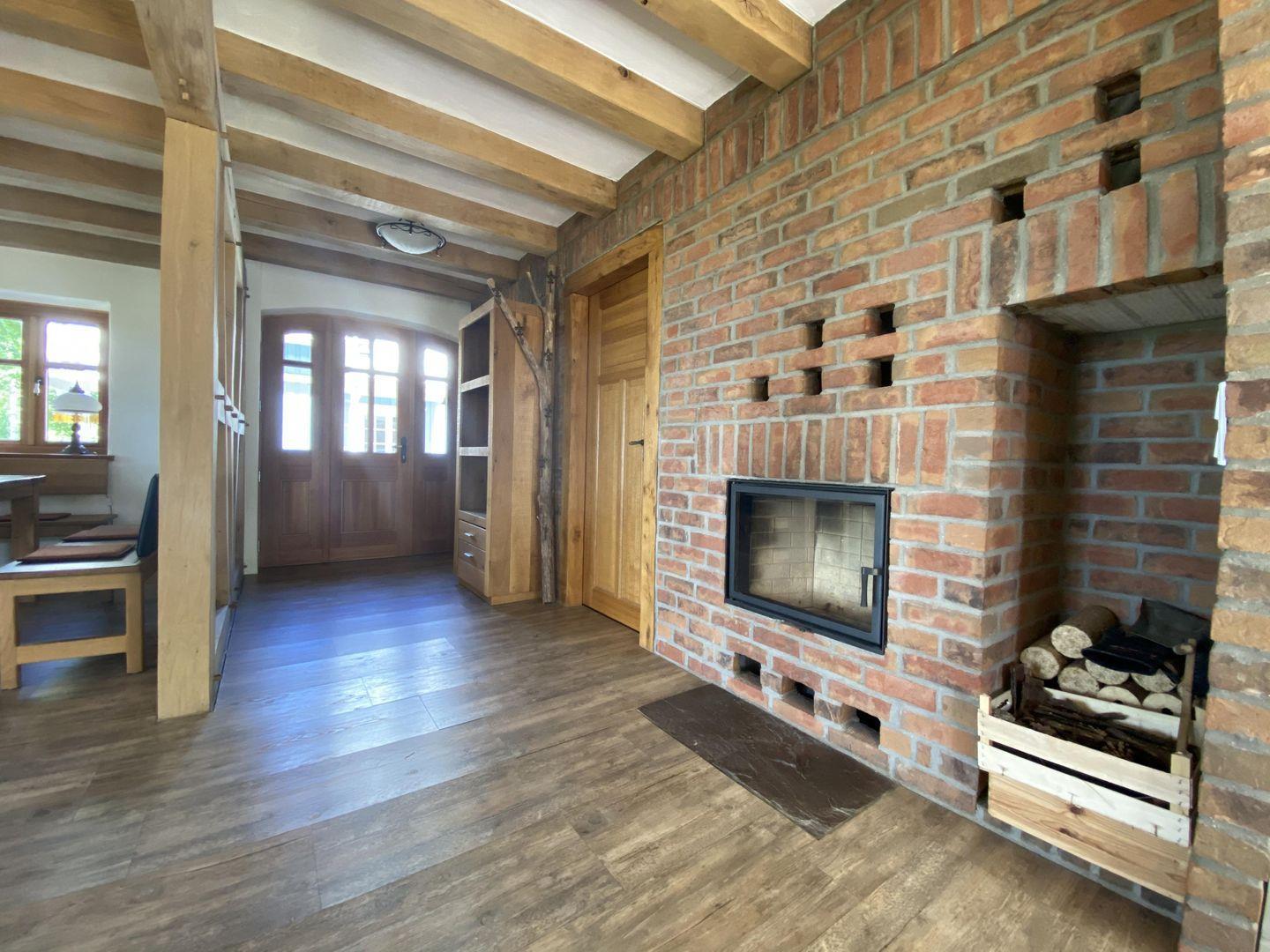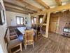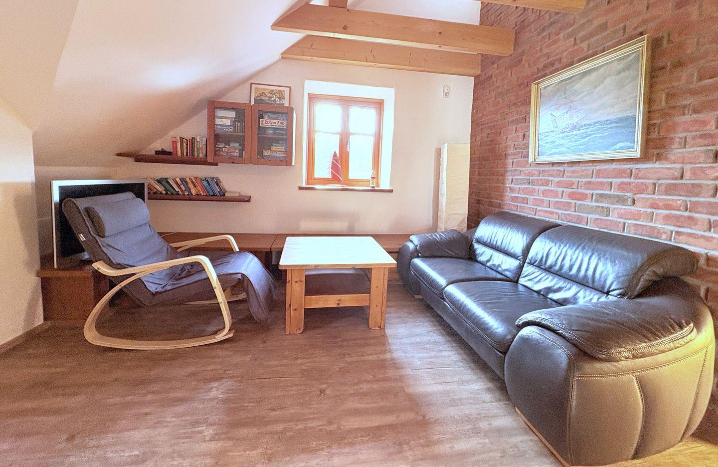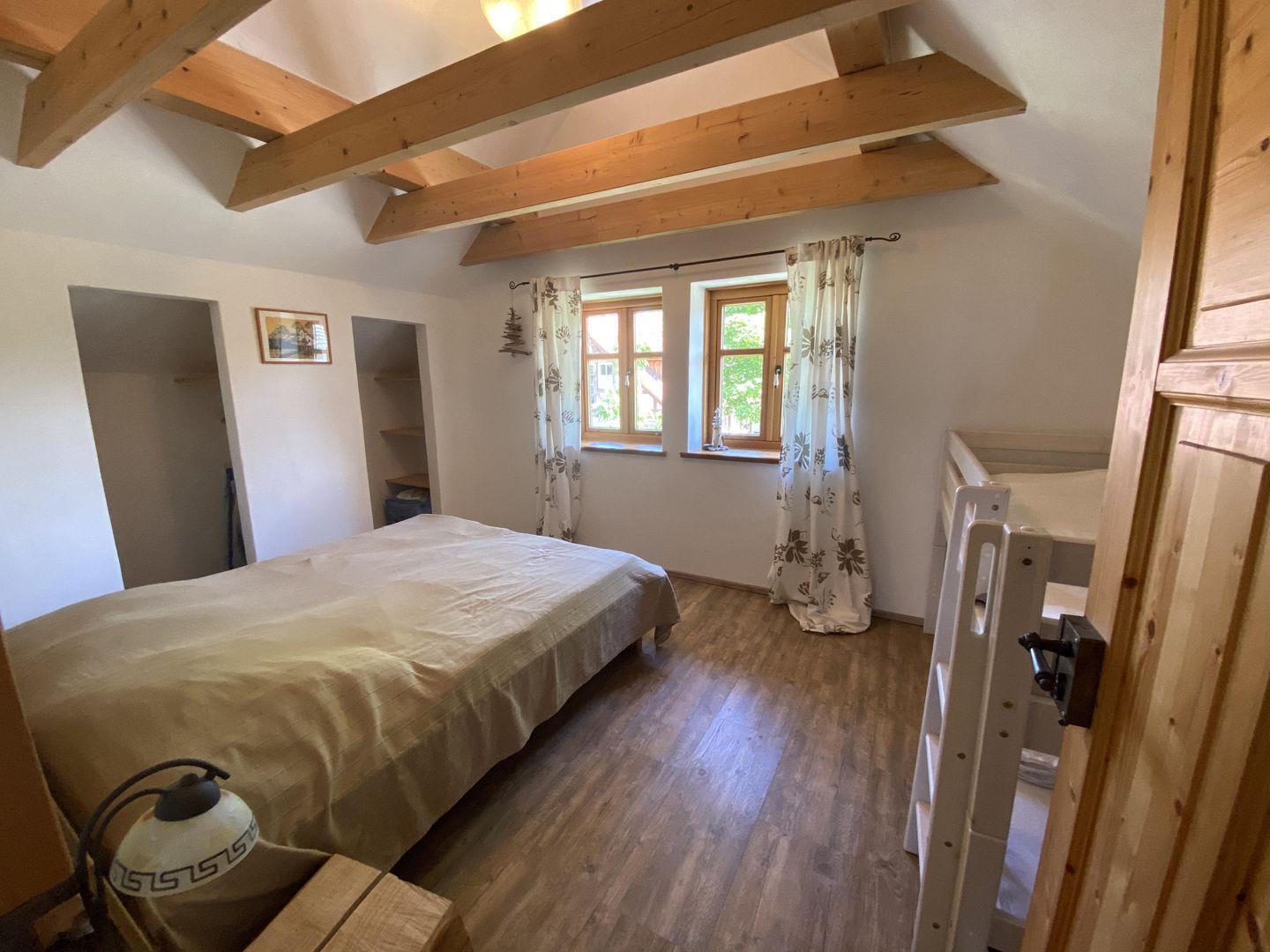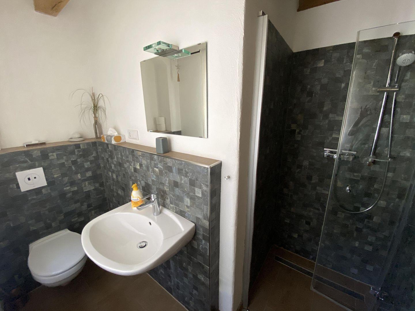 Im Erdgeschoss finden Sie eine moderne, voll ausgestattete Landhausküche, die keine Wünsche offenlässt. Das Esszimmer mit seiner gemütlichen Eichenholzeckbank ist der perfekte Ort für gesellige Mahlzeiten. Der offene Wohnbereich mit Ledercouch und Stressless-Sessel, viel naturbelassenem Eichenholz und Natursteinmauern schafft eine warme und einladende Atmosphäre. Die Küche ist vollständig ausgestattet. Ein Badezimmer mit WC und Dusche sowie ein Hauswirtschaftsraum mit Waschmaschine und Trockner runden das Angebot im Erdgeschoss ab. Von der Terrasse aus haben Sie Zugang zum Garten mit einer schönen Rasenfläche.