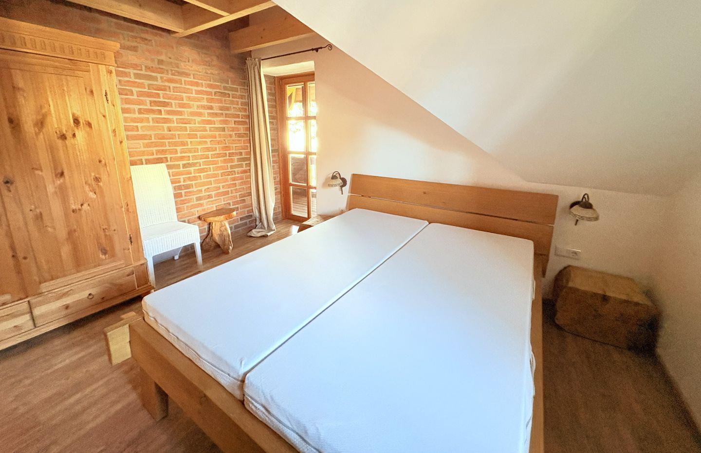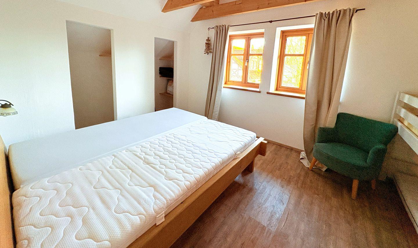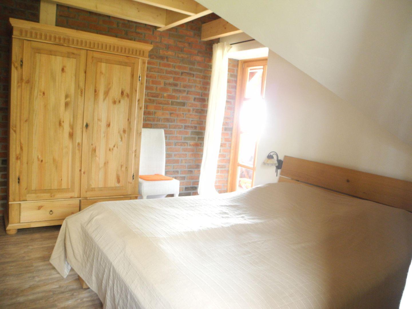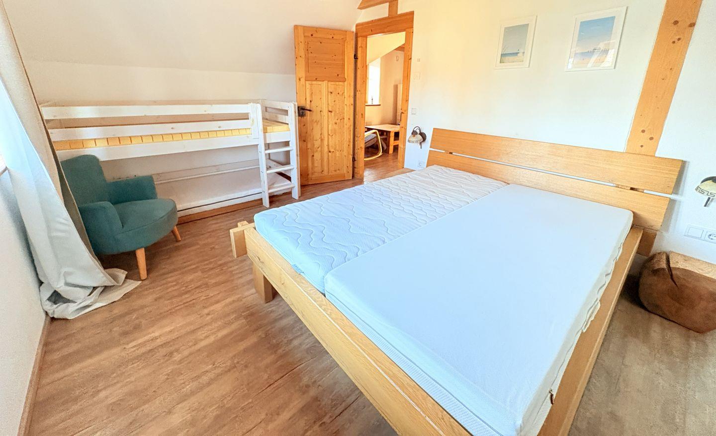 Im Obergeschoss erwarten Sie drei geräumige Schlafzimmer. Das erste Zimmer ist mit einem Doppelbett und einem Kinderstockbett ausgestattet, während die beiden anderen Zimmer jeweils ein Doppelbett und Zugang zum großen Dachbalkon bieten. Der Dachbalkon bietet einen herrlichen Blick über den Bodden bis hinüber zum Leuchtturm Hiddensee. Ein weiteres Badezimmer mit Sauna, Dusche und Badewanne sowie eine Galerie zum Fernsehen, Spielen und Relaxen machen das Obergeschoss komplett.