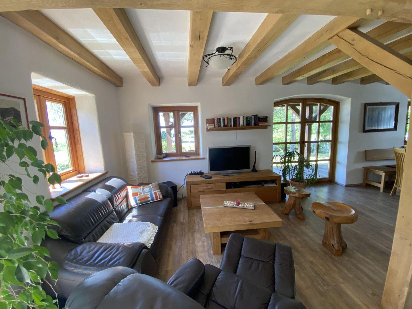 Unser exklusives Fachwerkhaus bietet viel Platz für Ihre Familie oder Freunde. Drei gemütliche Schlafzimmer bieten Platz für bis zu sechs Personen und garantieren erholsame Nächte. Im Wohnzimmer lädt das knisternde Kaminfeuer zum Verweilen ein, während die finnische Holzsauna und der großzügige Balkon mit atemberaubendem Blick auf den Bodden und den Leuchtturm von Hiddensee zum Entspannen einladen.