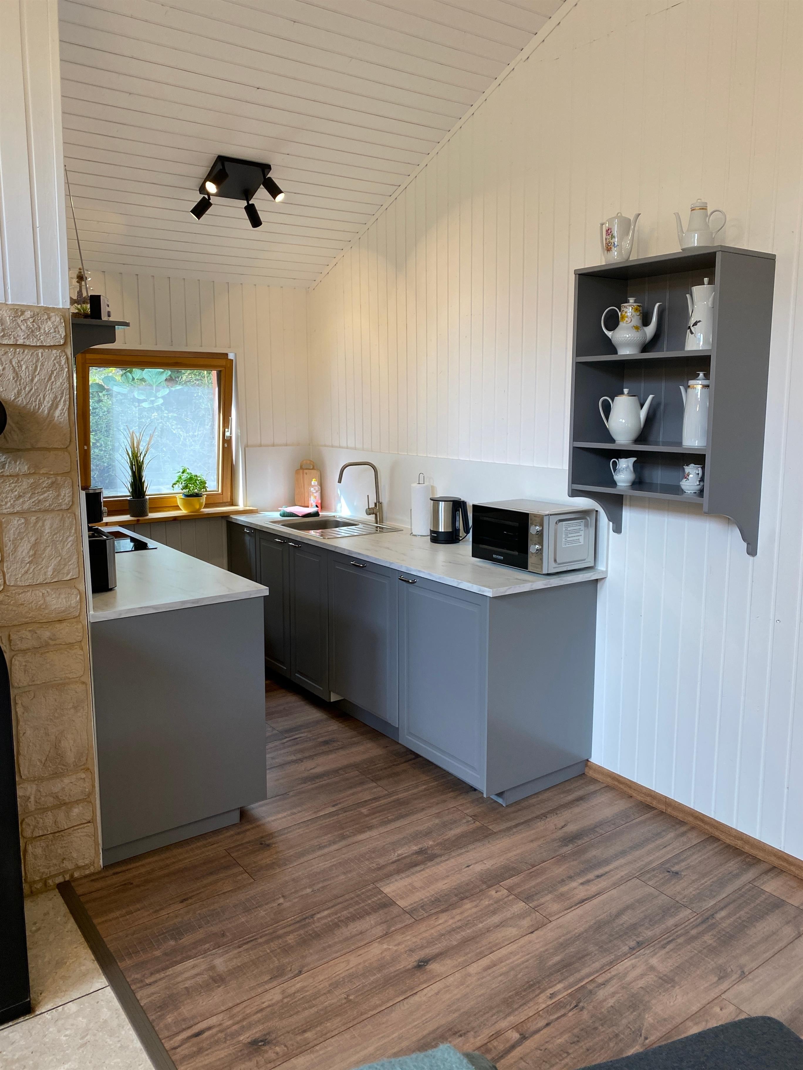 Der 45 qm große Wohnbereich mit offener Küche hat folgende Ausstattung: Ceranfeld Herd, Backofen, Geschirrspüler, Mikrowelle, Toaster, Wasserkocher, Kaffeemaschine, Kühlschrank mit Gefrierfach, Geschirr, Töpfe usw ..