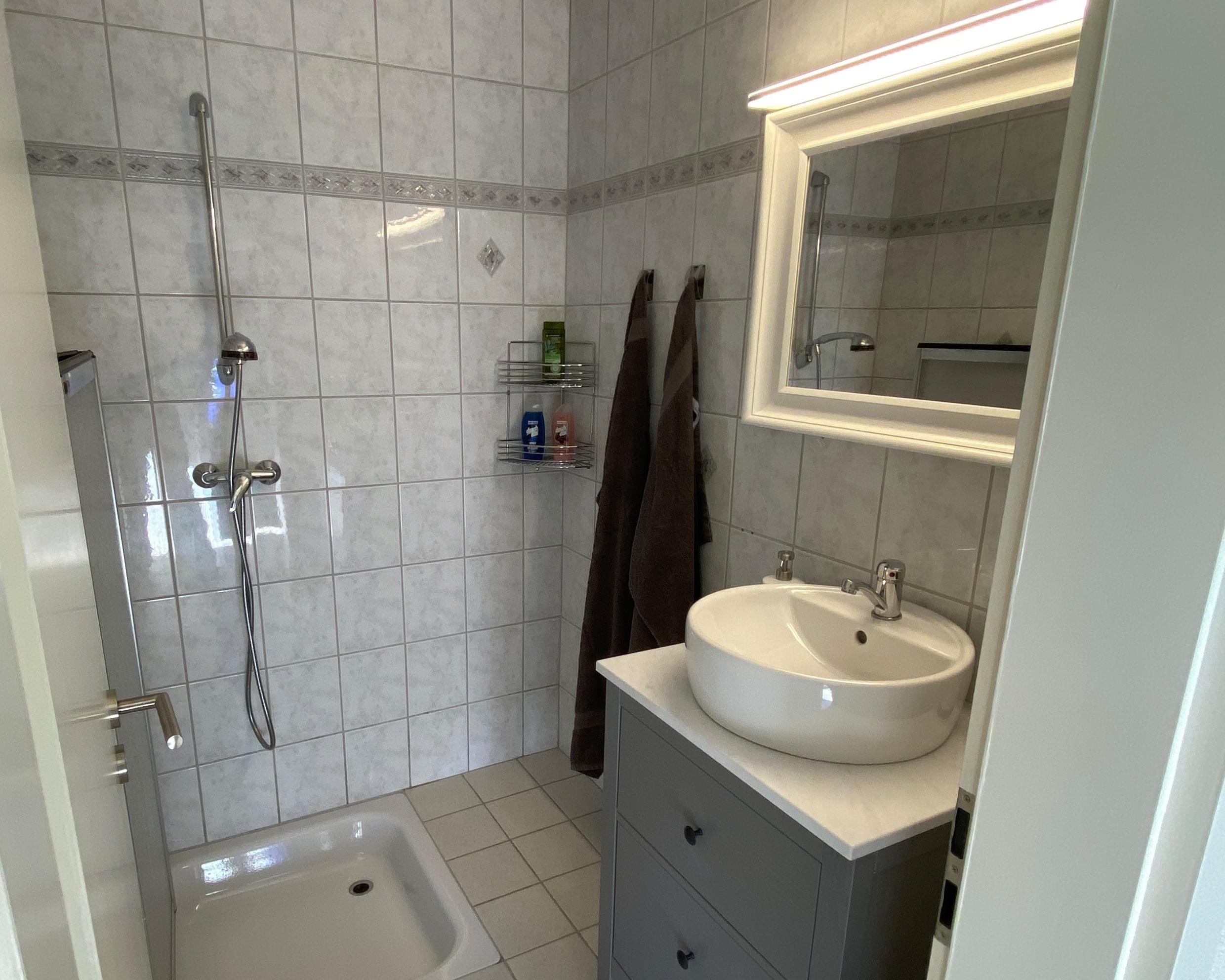 Das Bad hat eine Dusche, und das Wc befindet sich in einem Extra Raum.