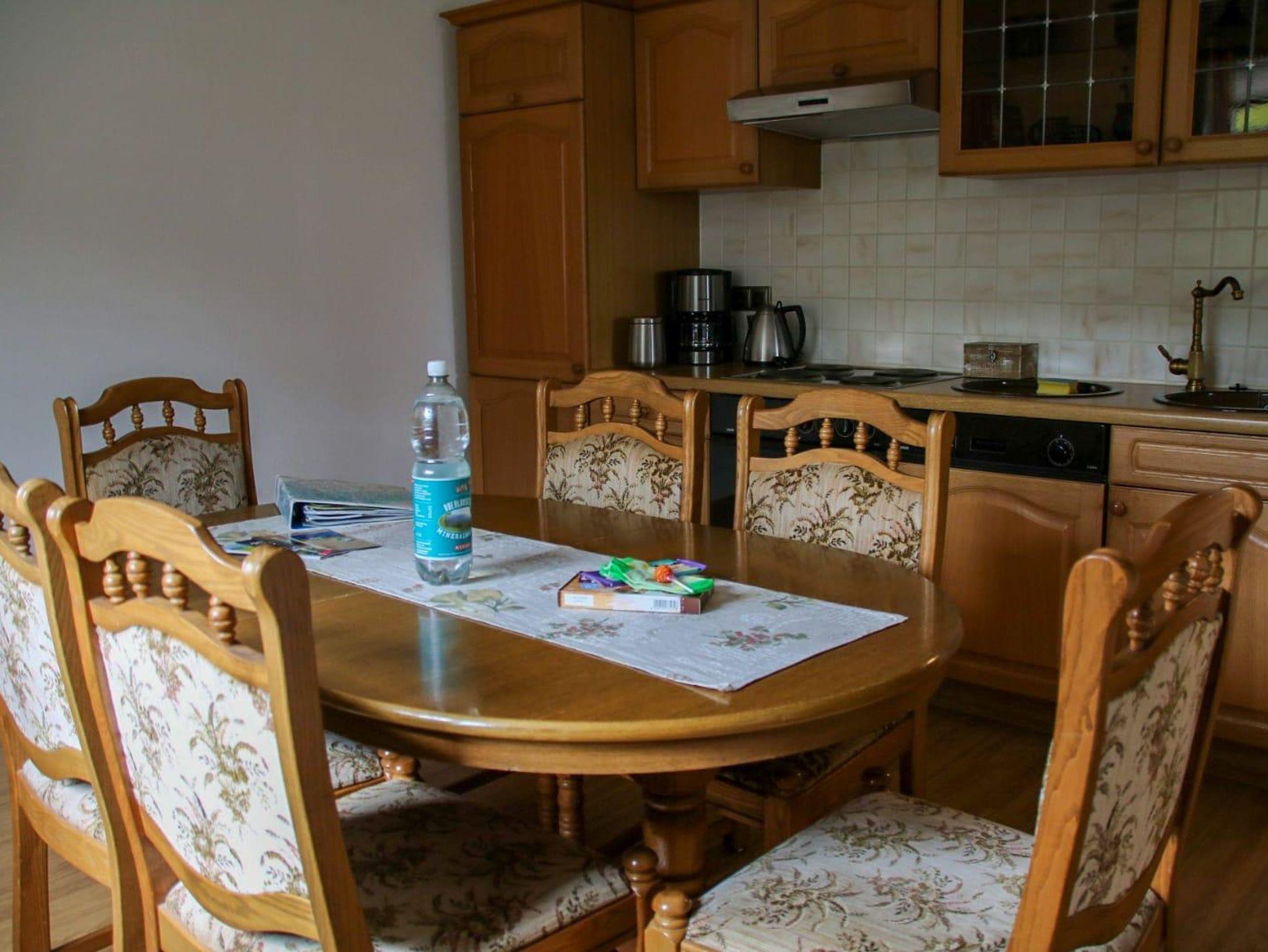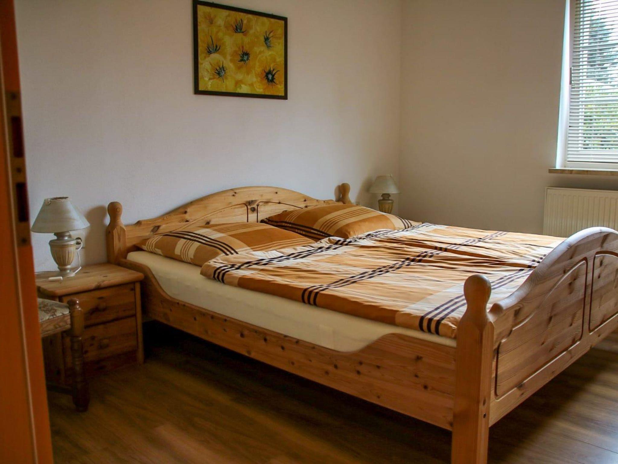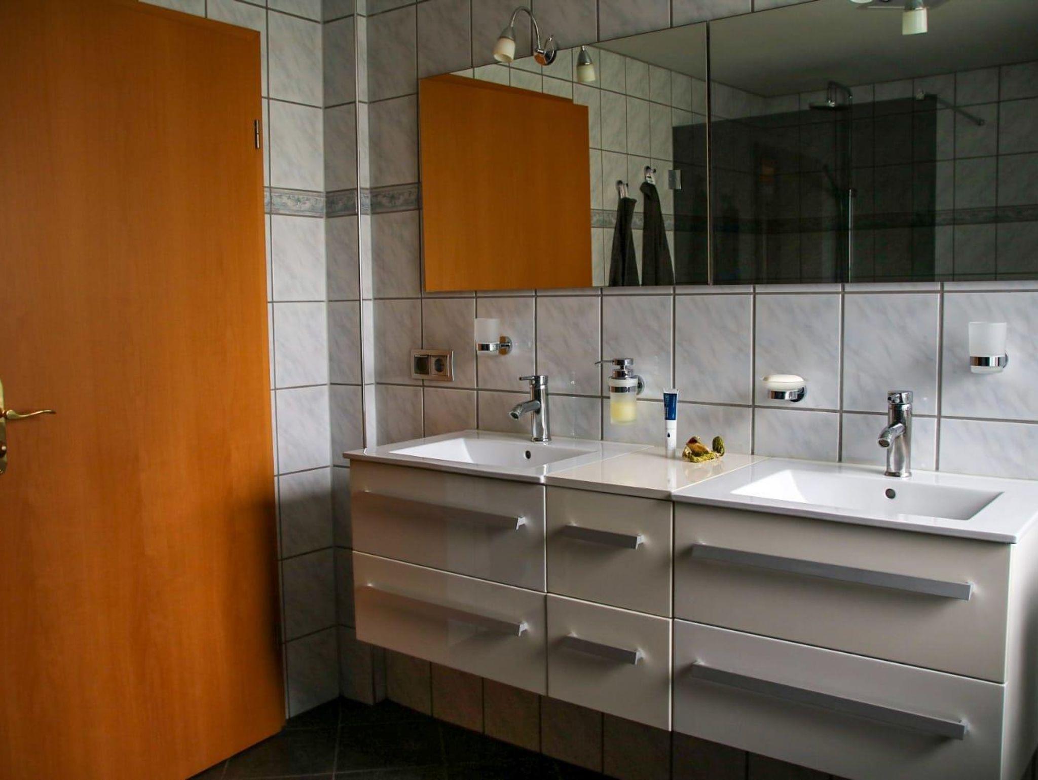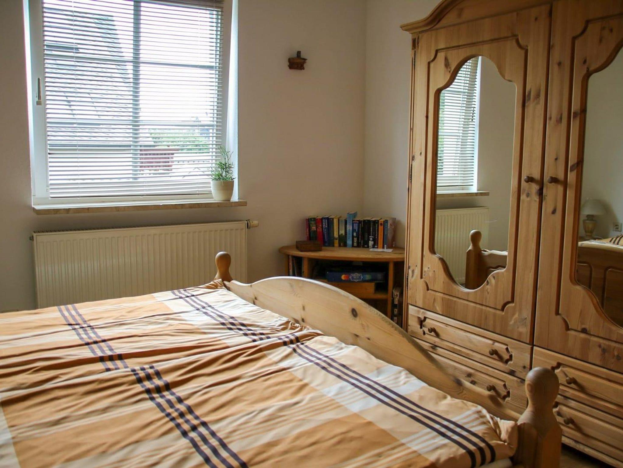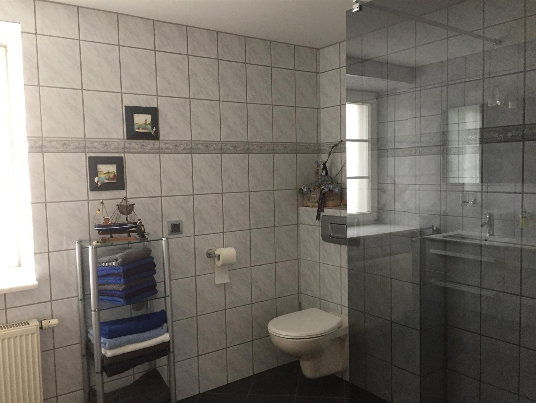 Die komplett ausgestattete Küche mit Geschirrspüler, Kühlschrank, Herd, Backofen, Wasserkocher, Toaster, Kaffeemaschine, inclusive Tee und Kaffee lässt keine Wünsche offen. Die Ferienwohnung verfügt über ein Schlafzimmer mit Doppelbett . Das geräumige Badezimmer mit ebenerdiger Dusche , Regenbrause, Doppelwaschbecken, Fön und großen Spiegel rundet das Gesamtbild ab.